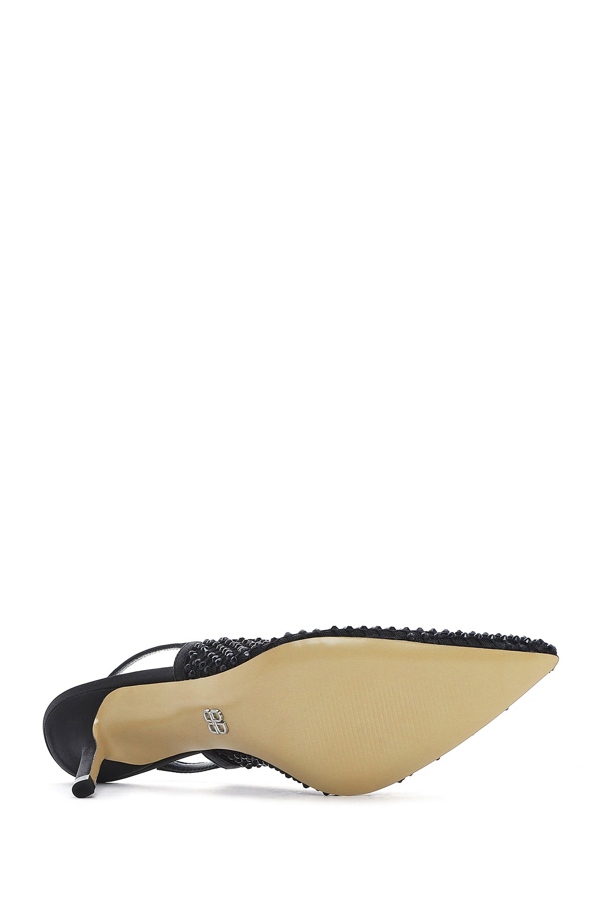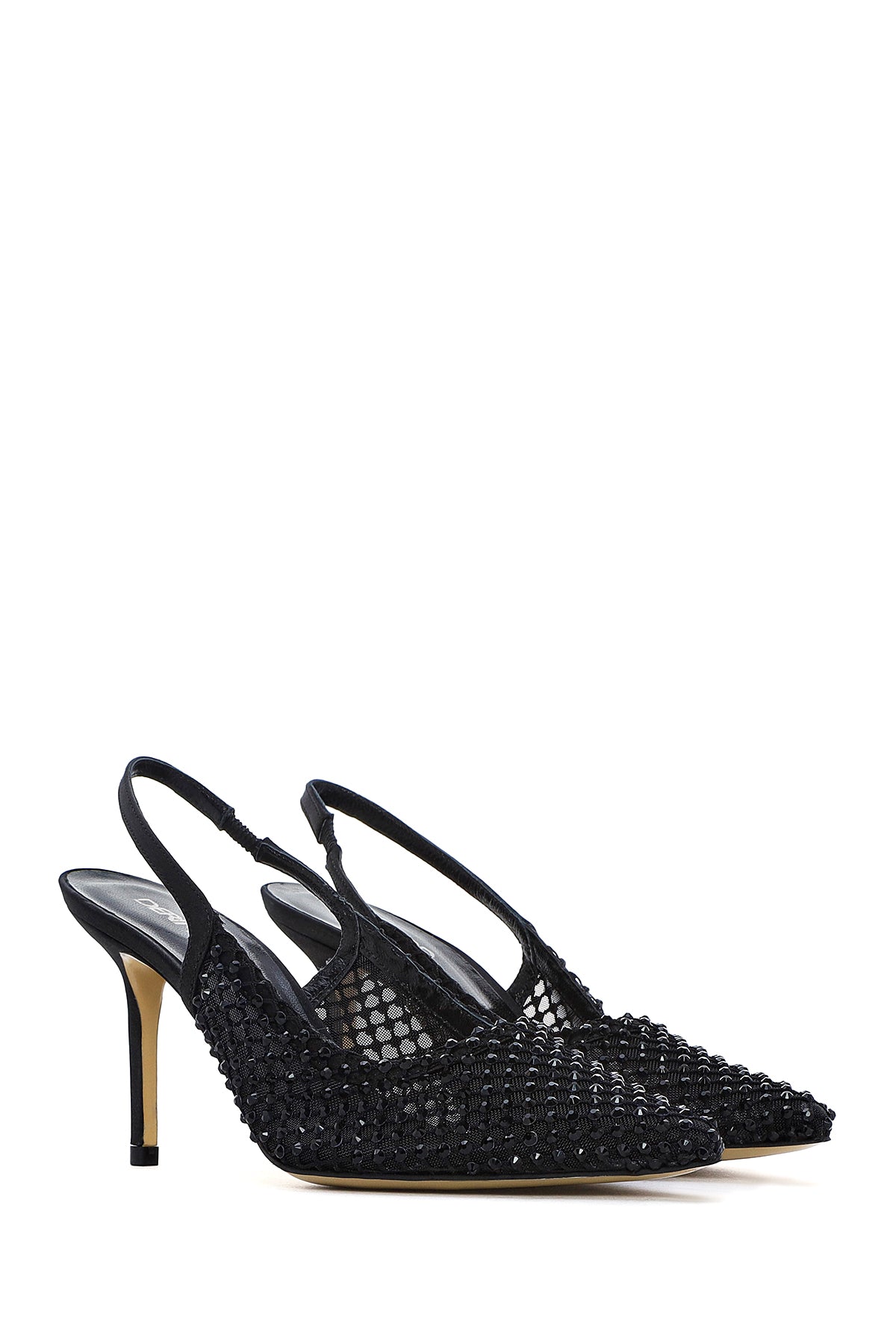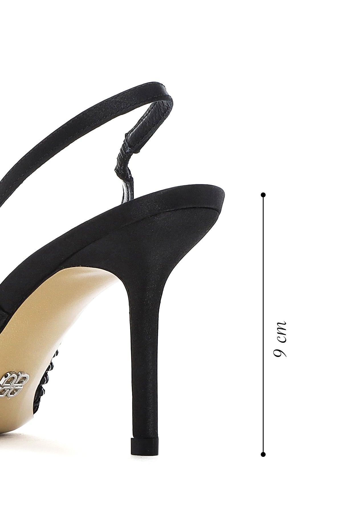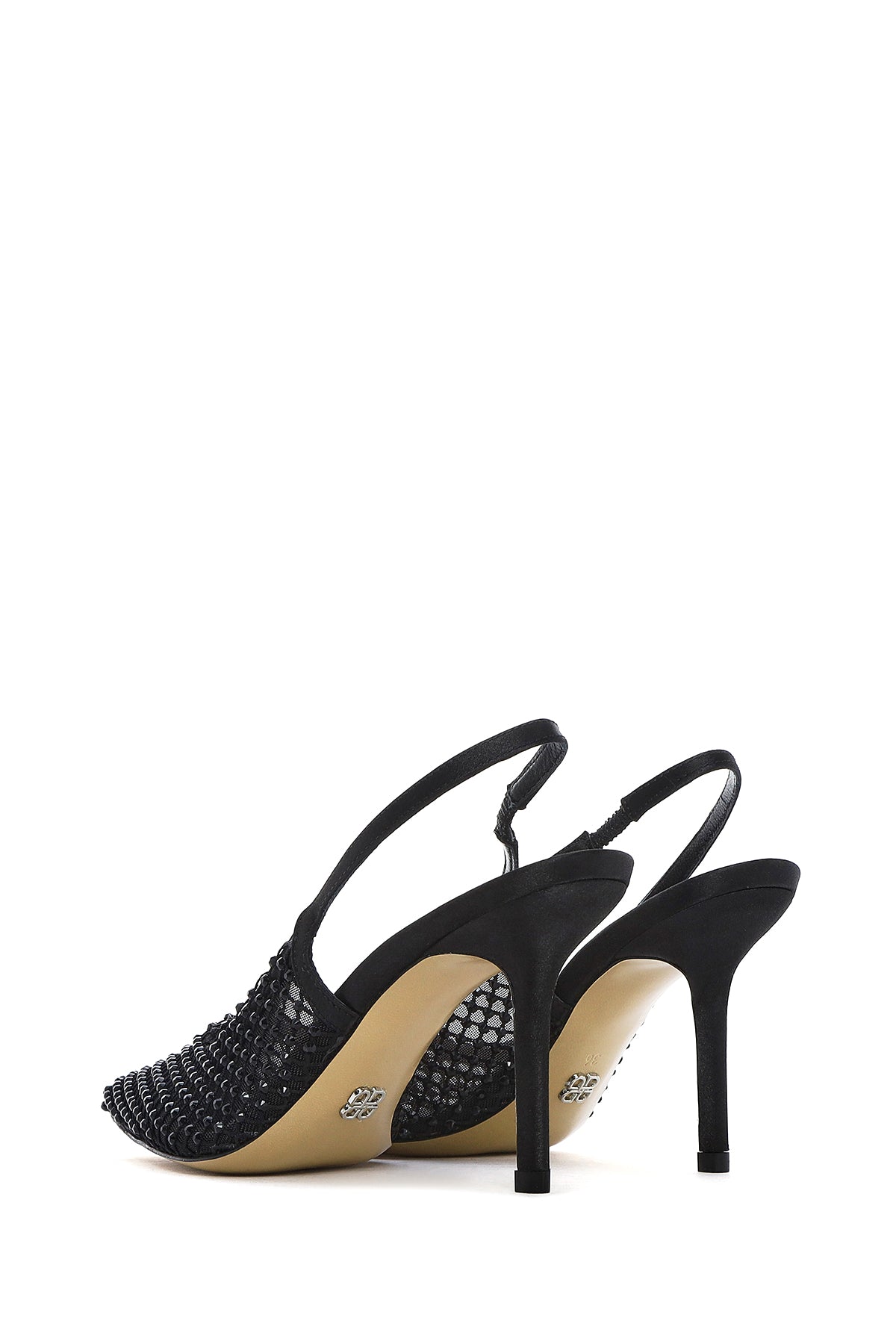 Kadın Siyah Taşlı Arkası Açık İnce Topuklu Deri Ayakkabı
