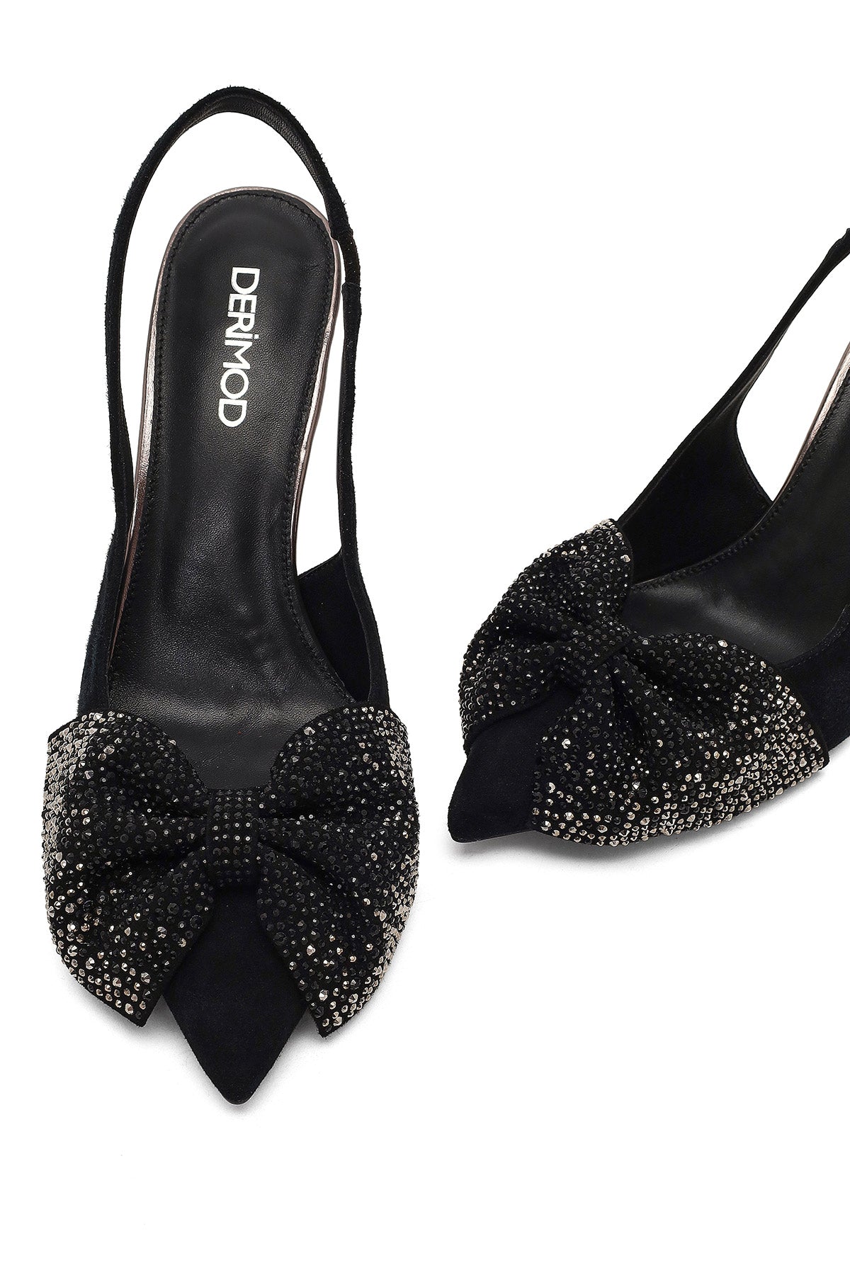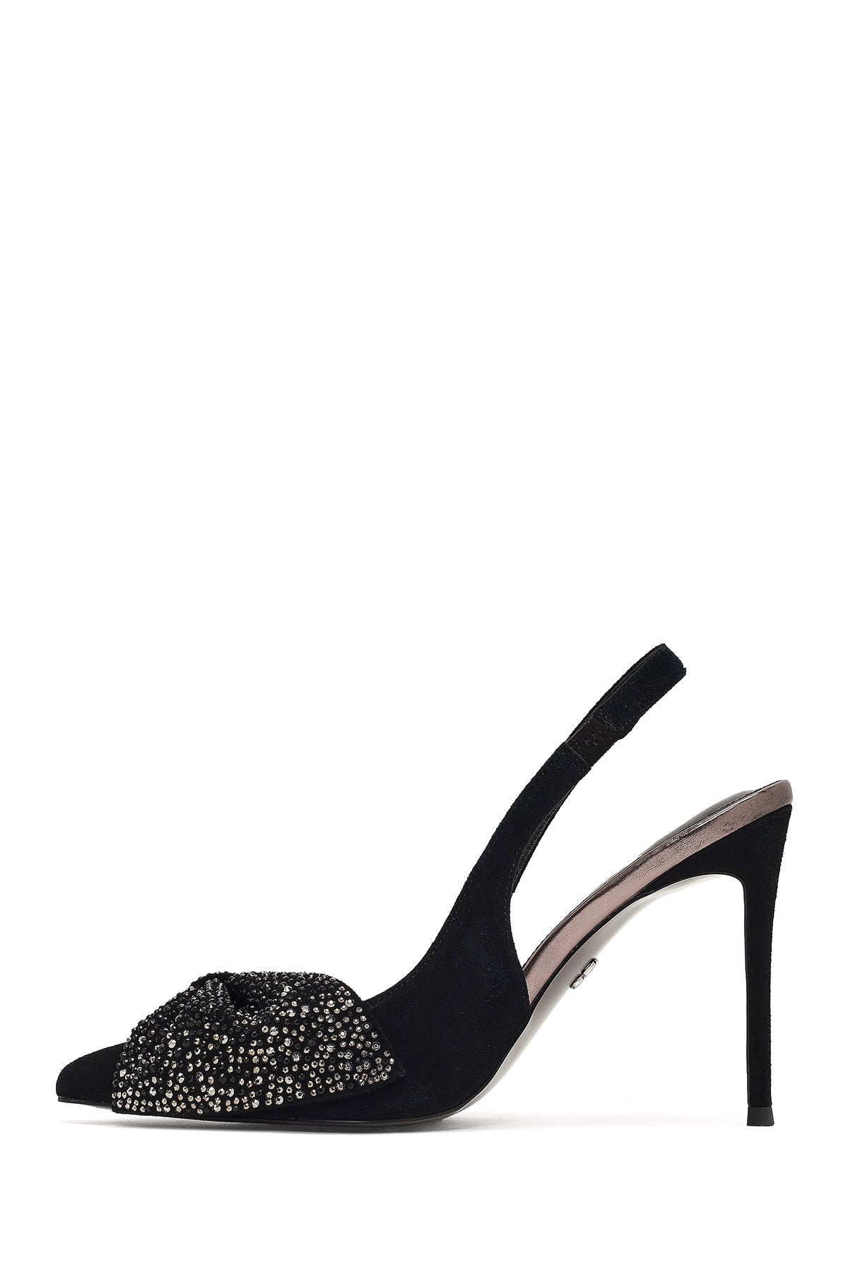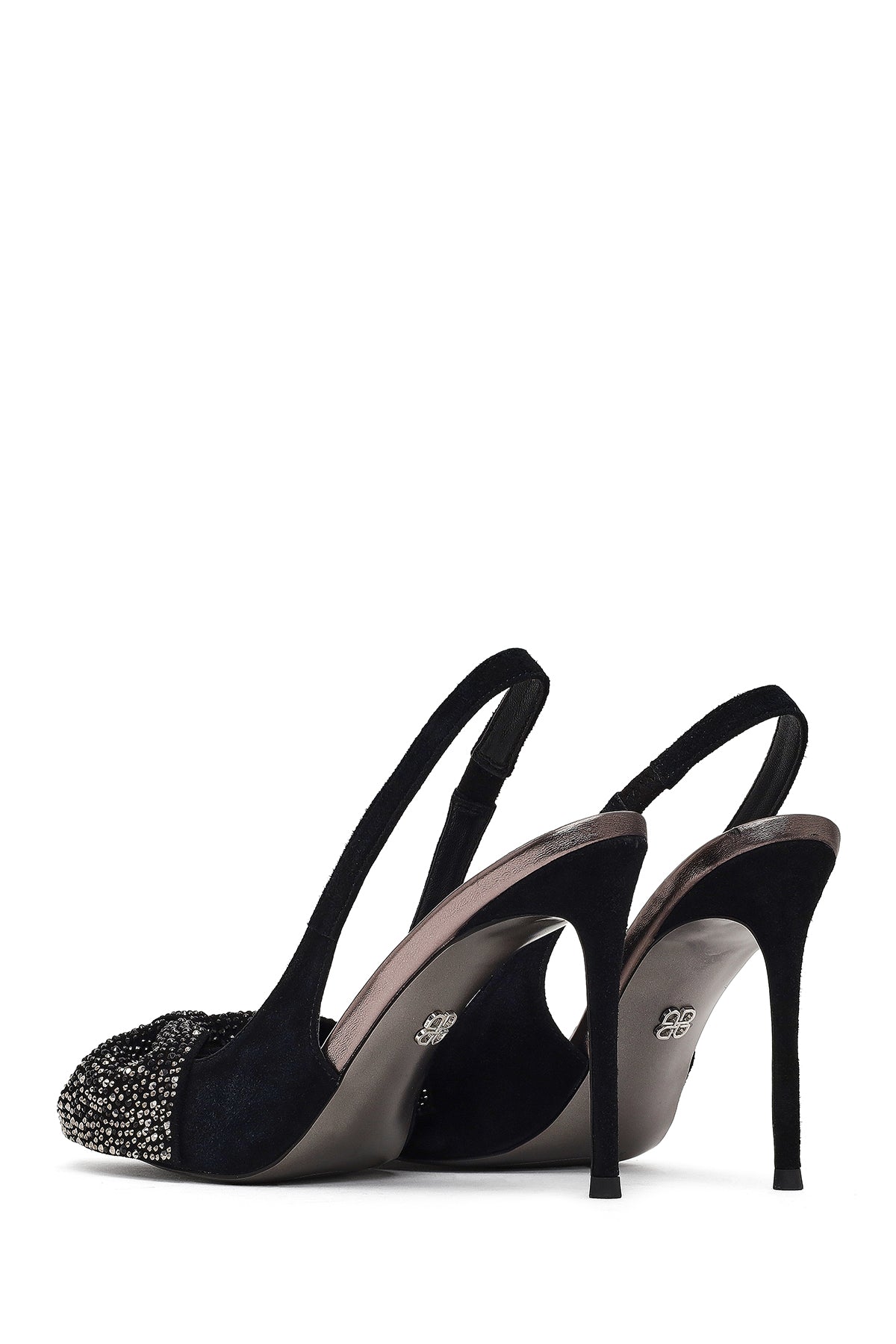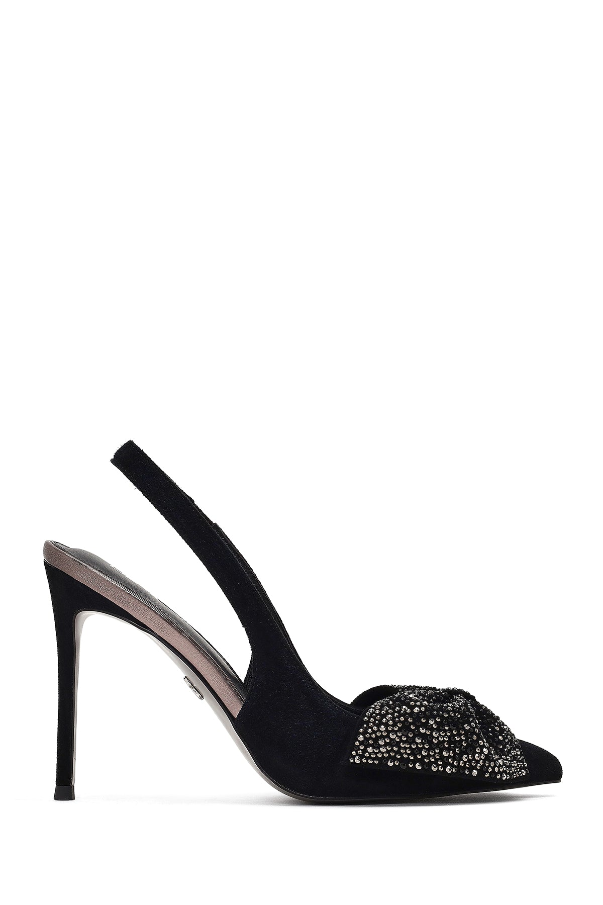 Kadın Siyah Arkası Açık Taşlı İnce Yüksek Topuklu Süet Deri Ayakkabı