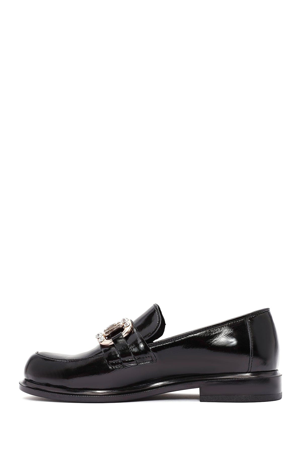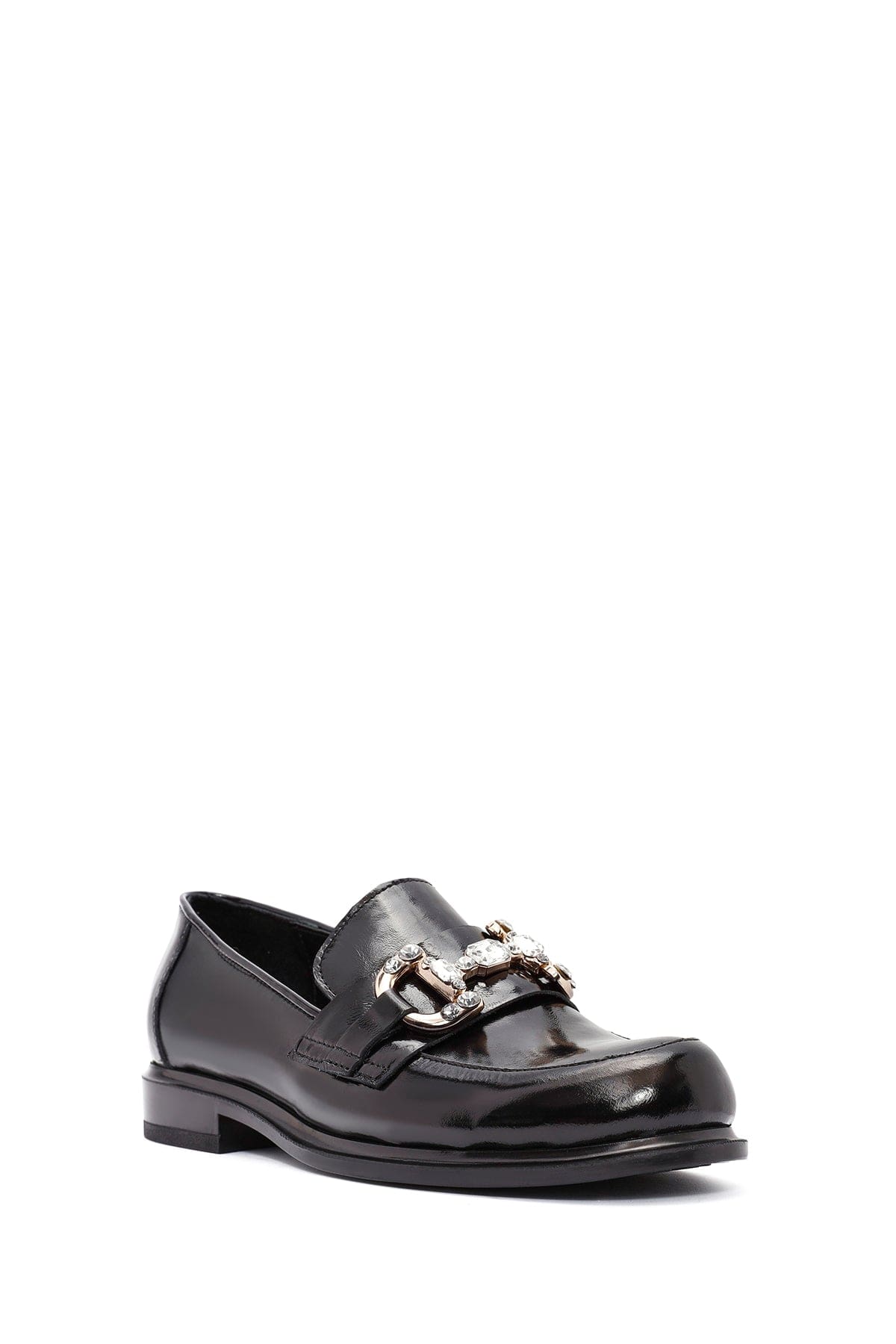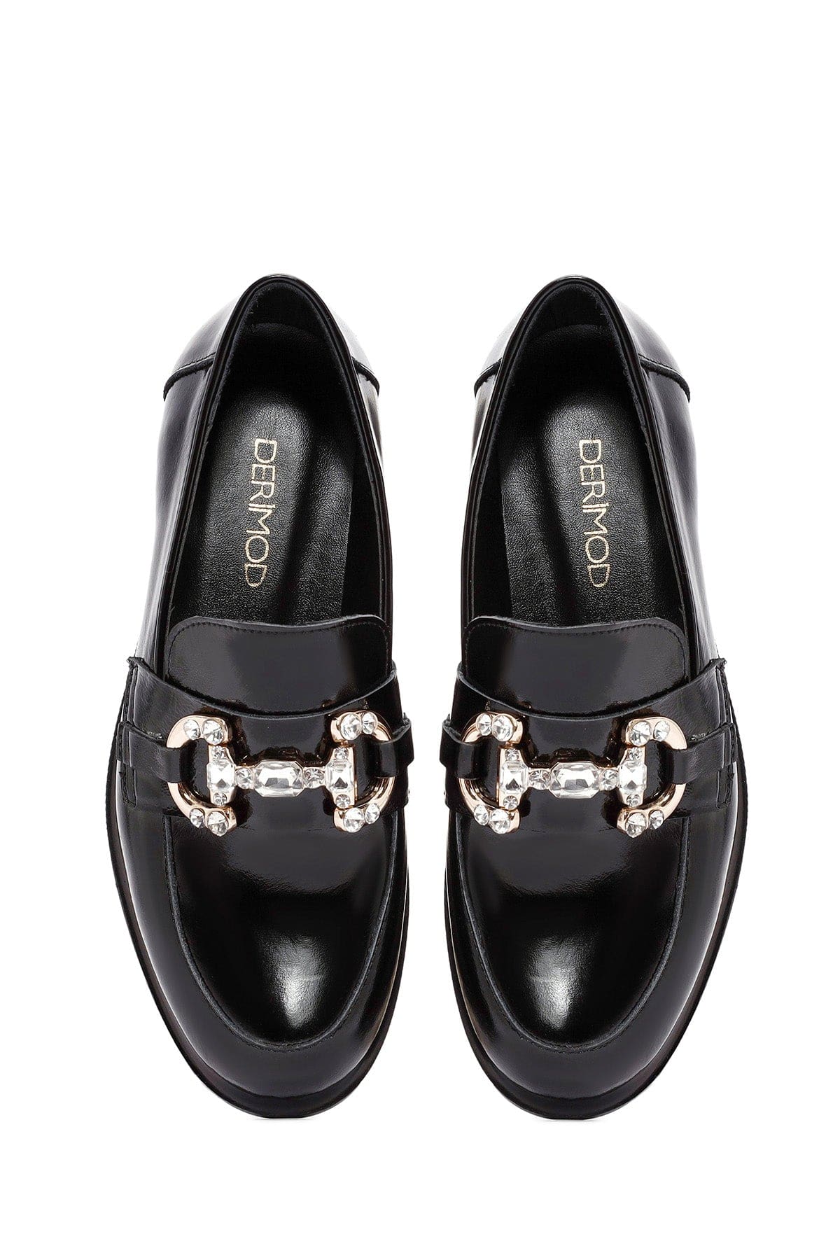 Kadın Siyah Taş Detaylı Deri Maskülen Loafer