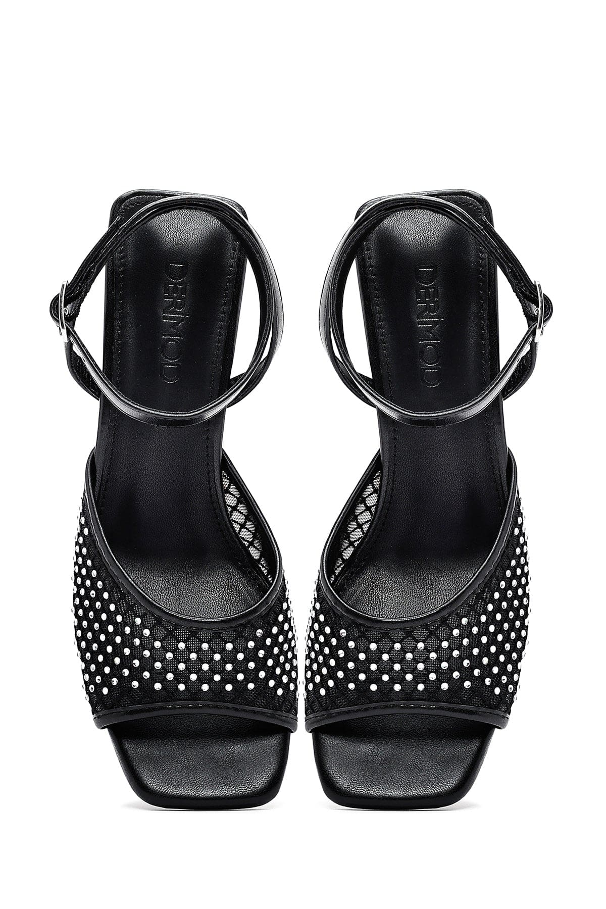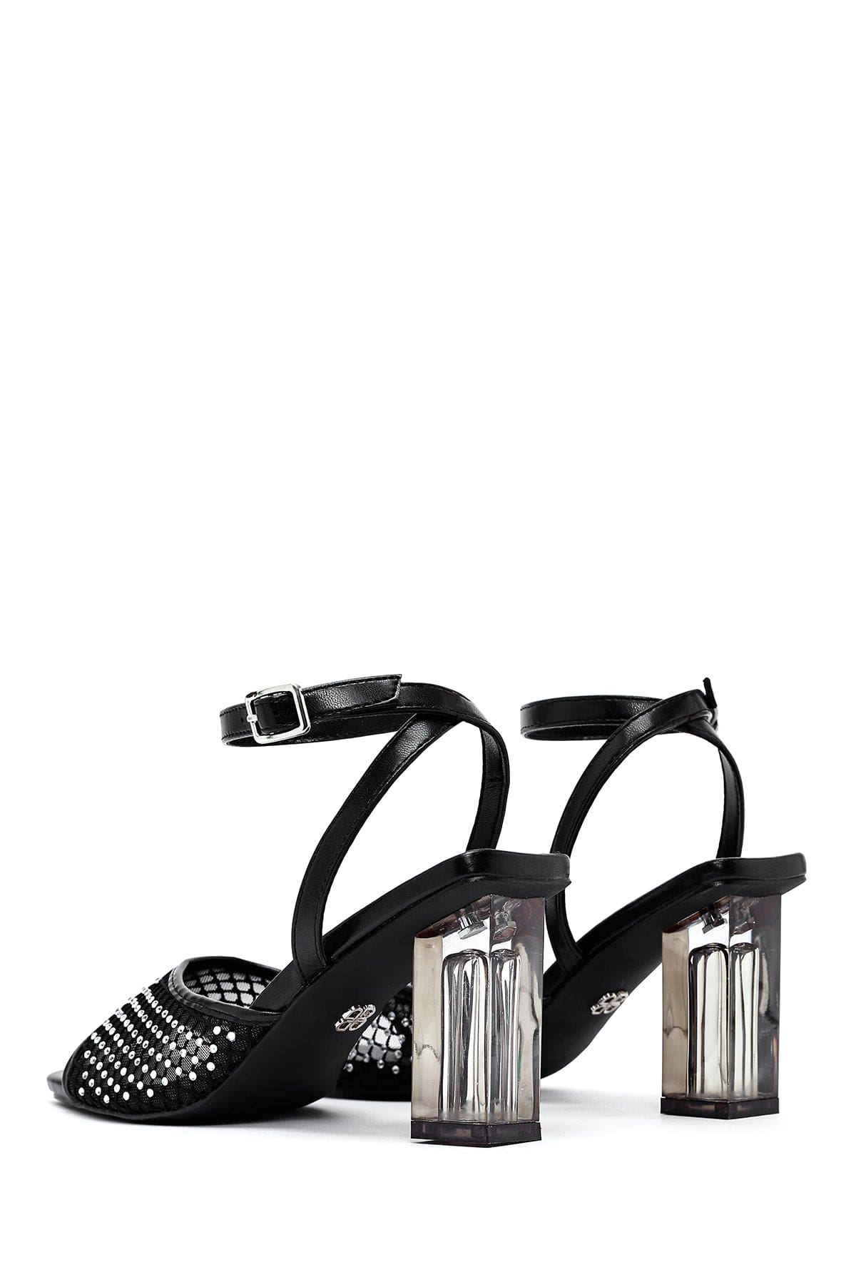 Kadın Siyah Bilekten Tokalı Taşlı Şeffaf Kalın Topuklu Sandalet