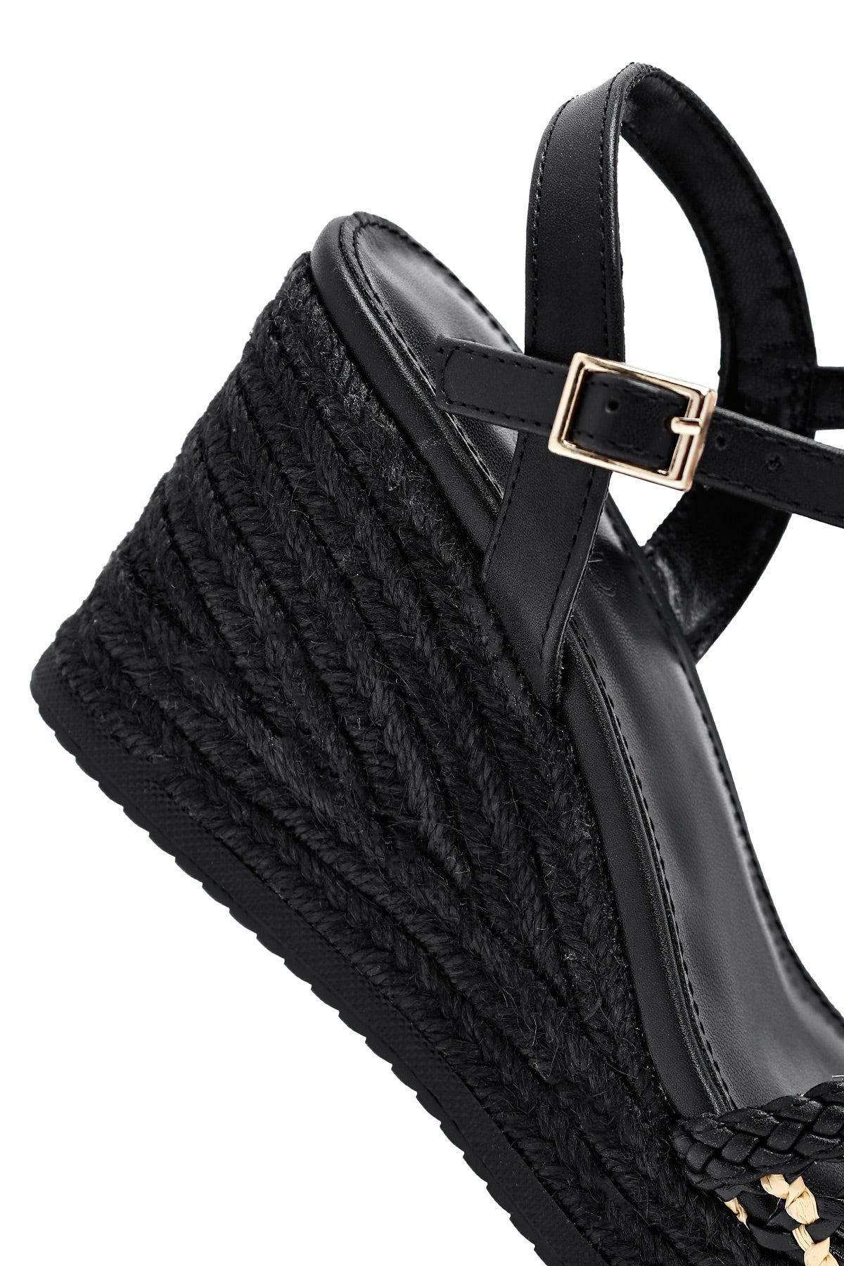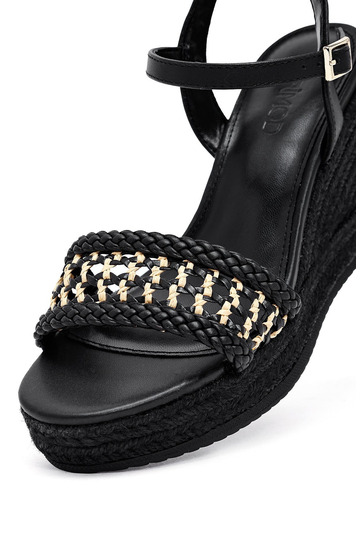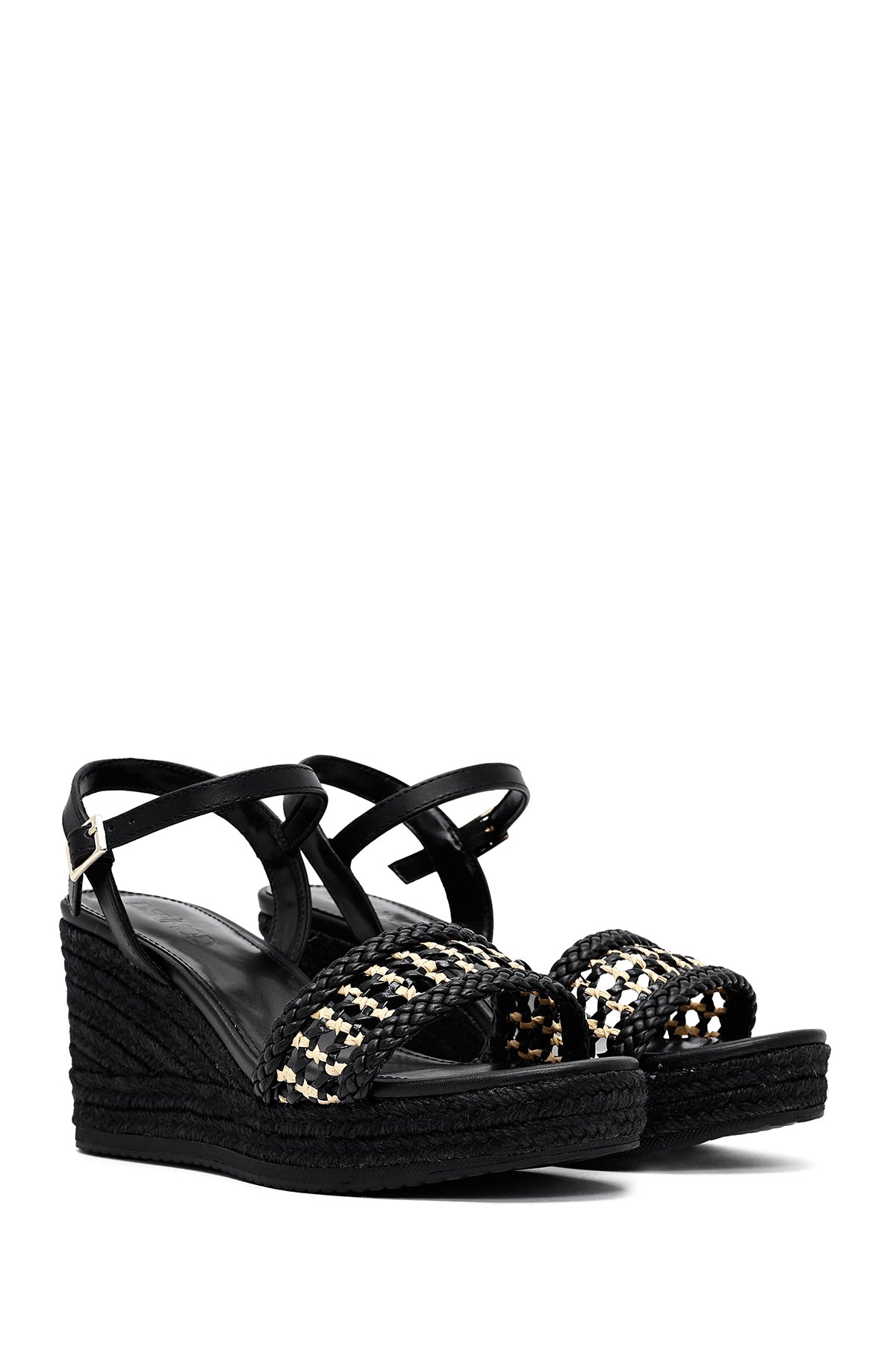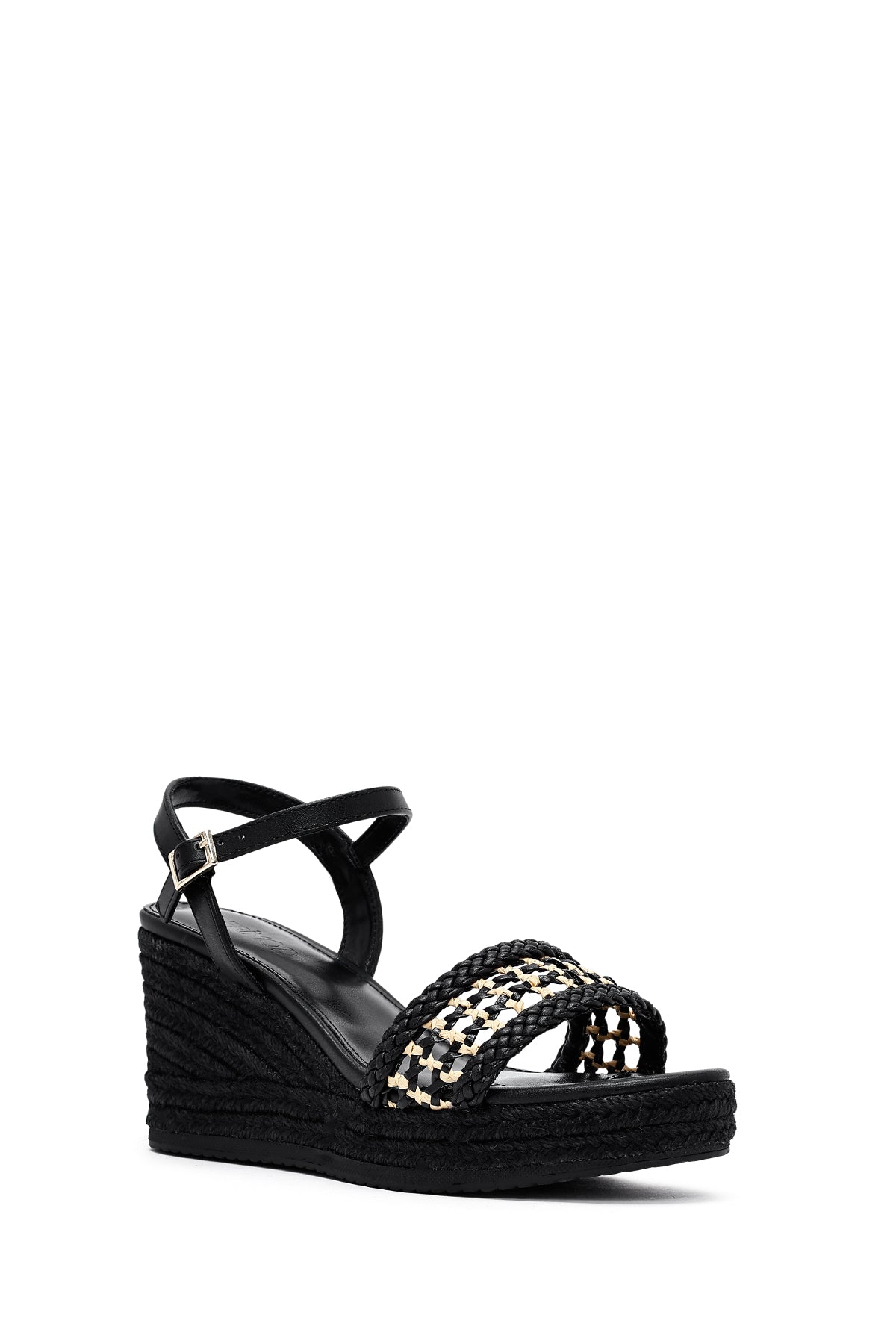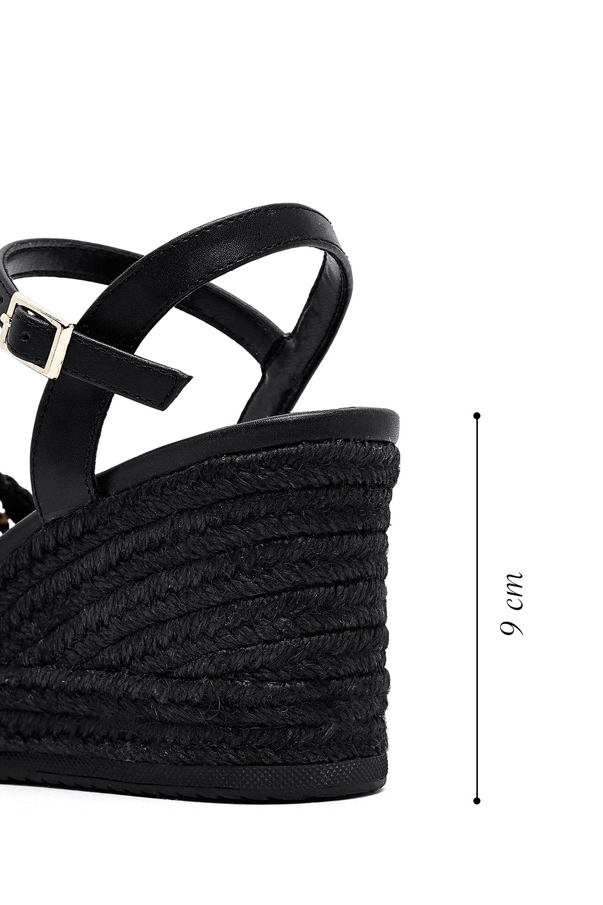 Kadın Siyah Bilekten Tokalı Örgülü Dolgu Topuklu Espadril Sandalet