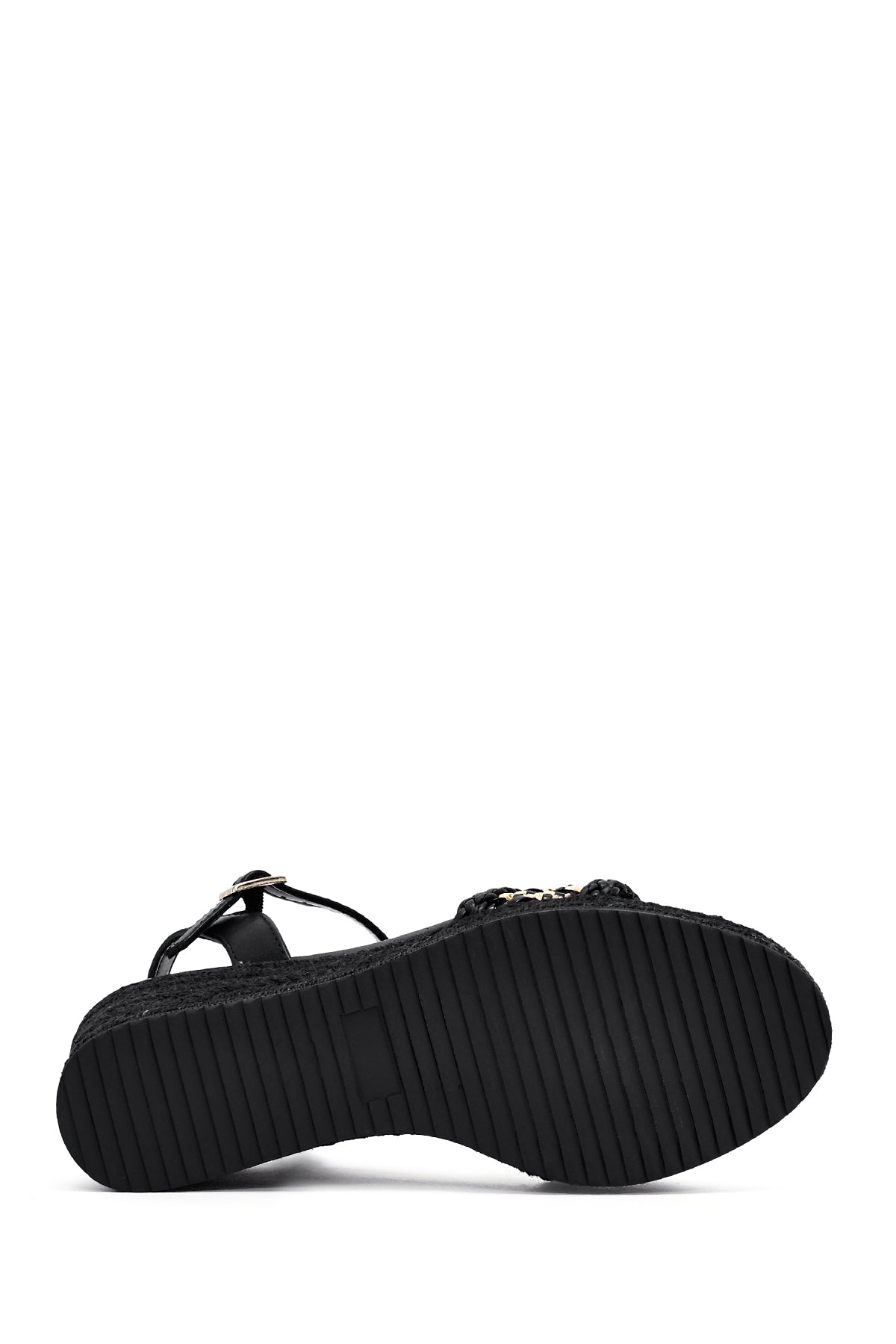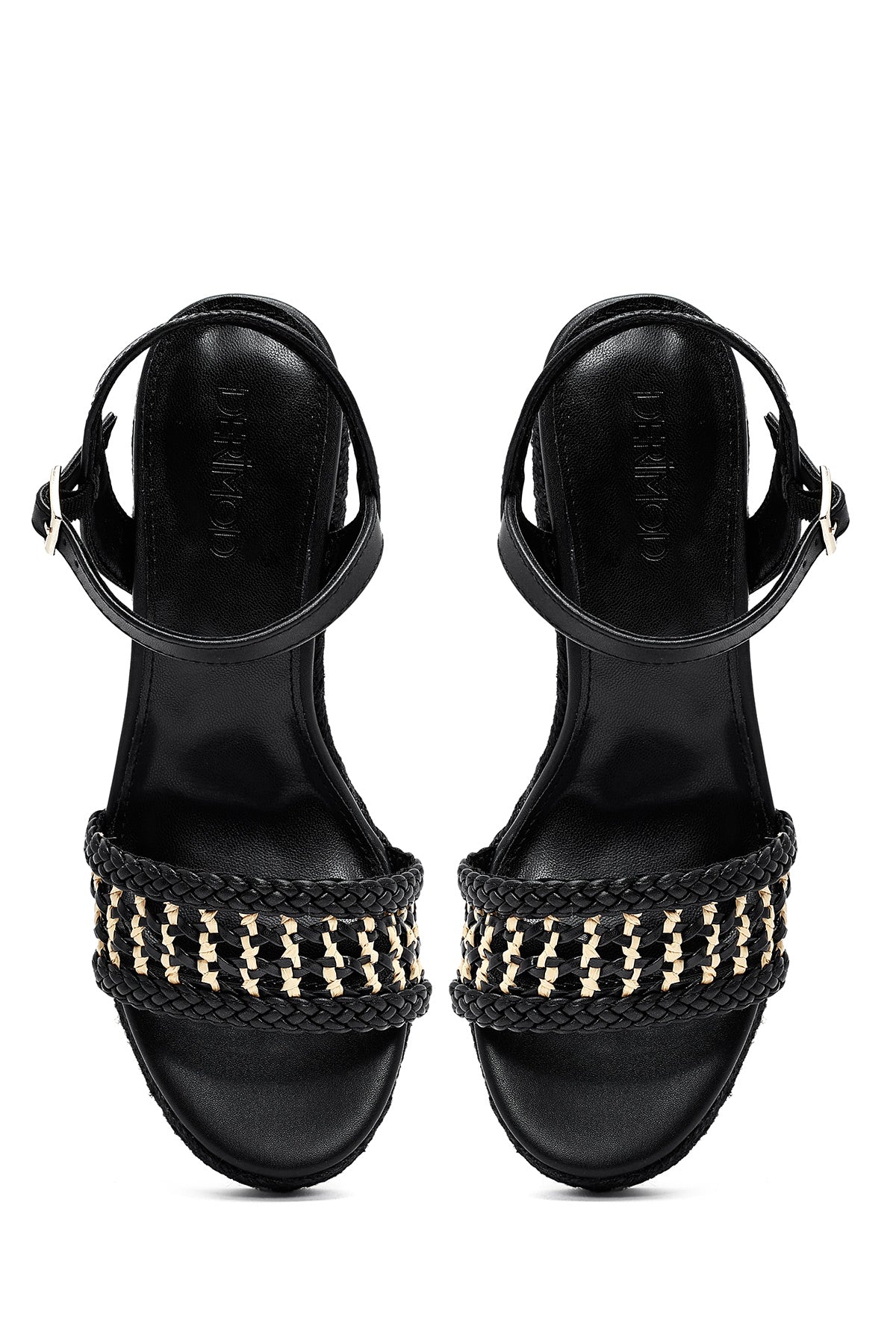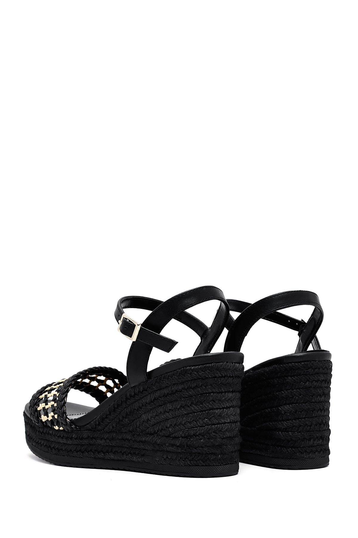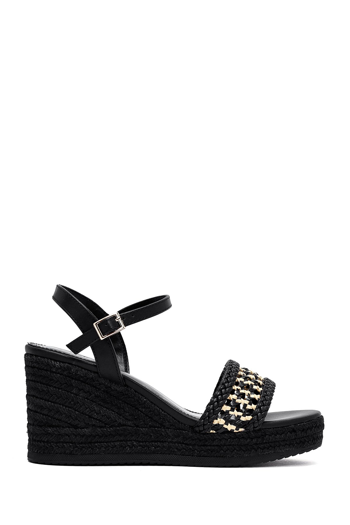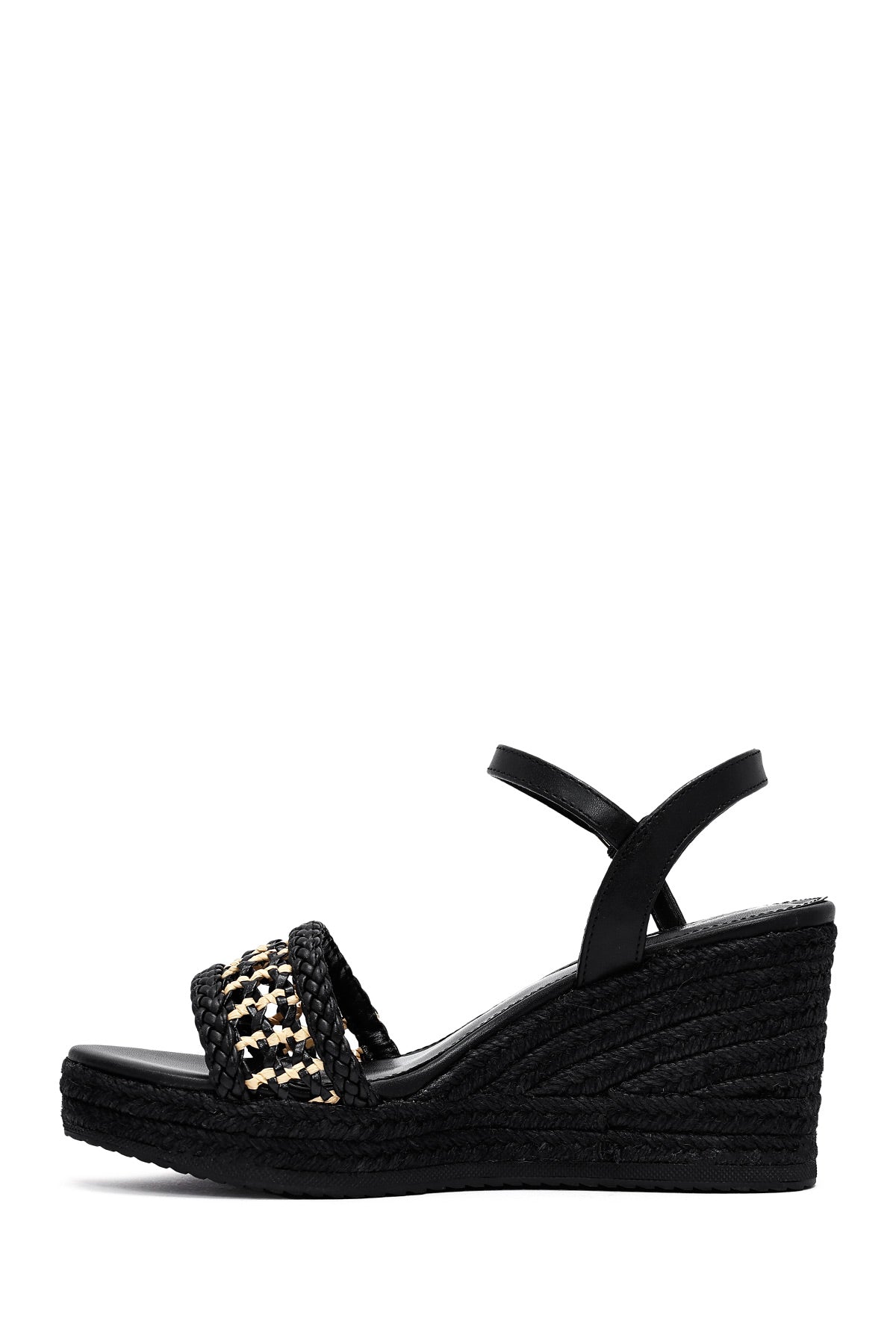 Kadın Siyah Bilekten Tokalı Örgülü Dolgu Topuklu Espadril Sandalet