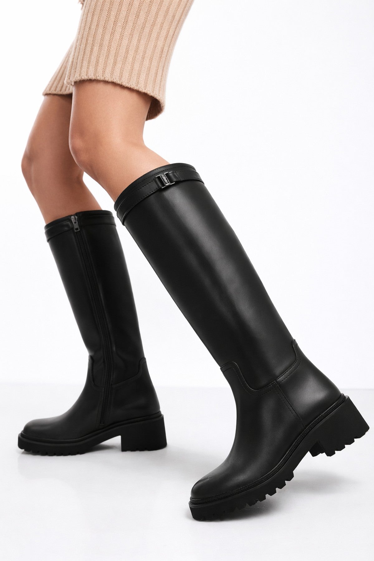 Kadın Siyah Fermuarlı Kalın Tabanlı Deri Çizme