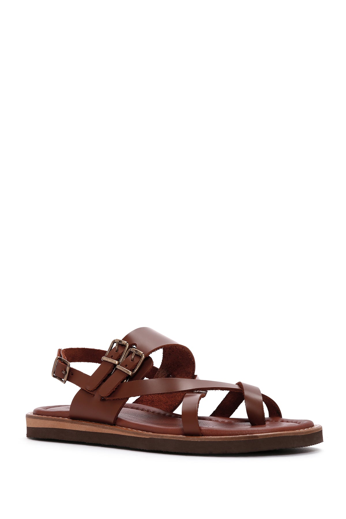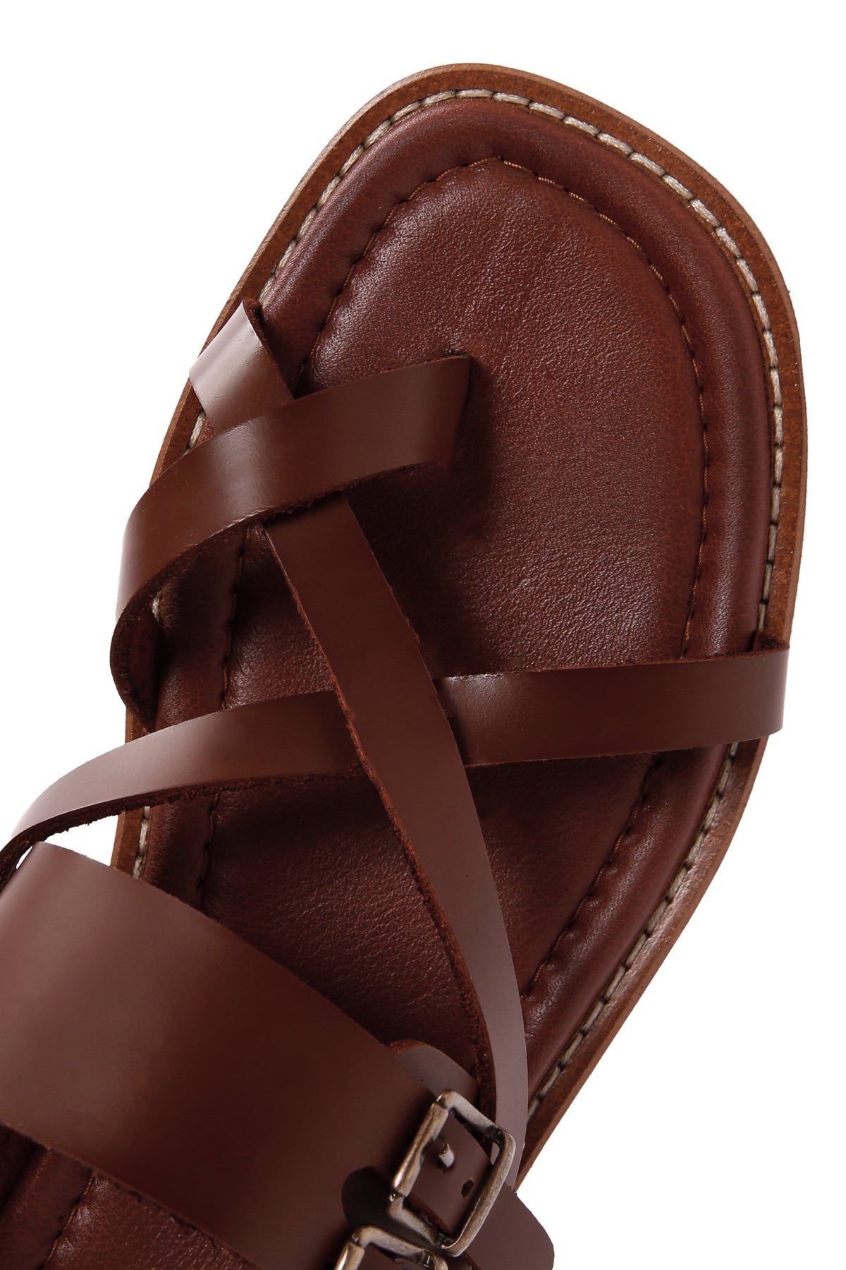 صندل زنانه چرم قهوهای بنددار مچ پا انگشتی دری مد