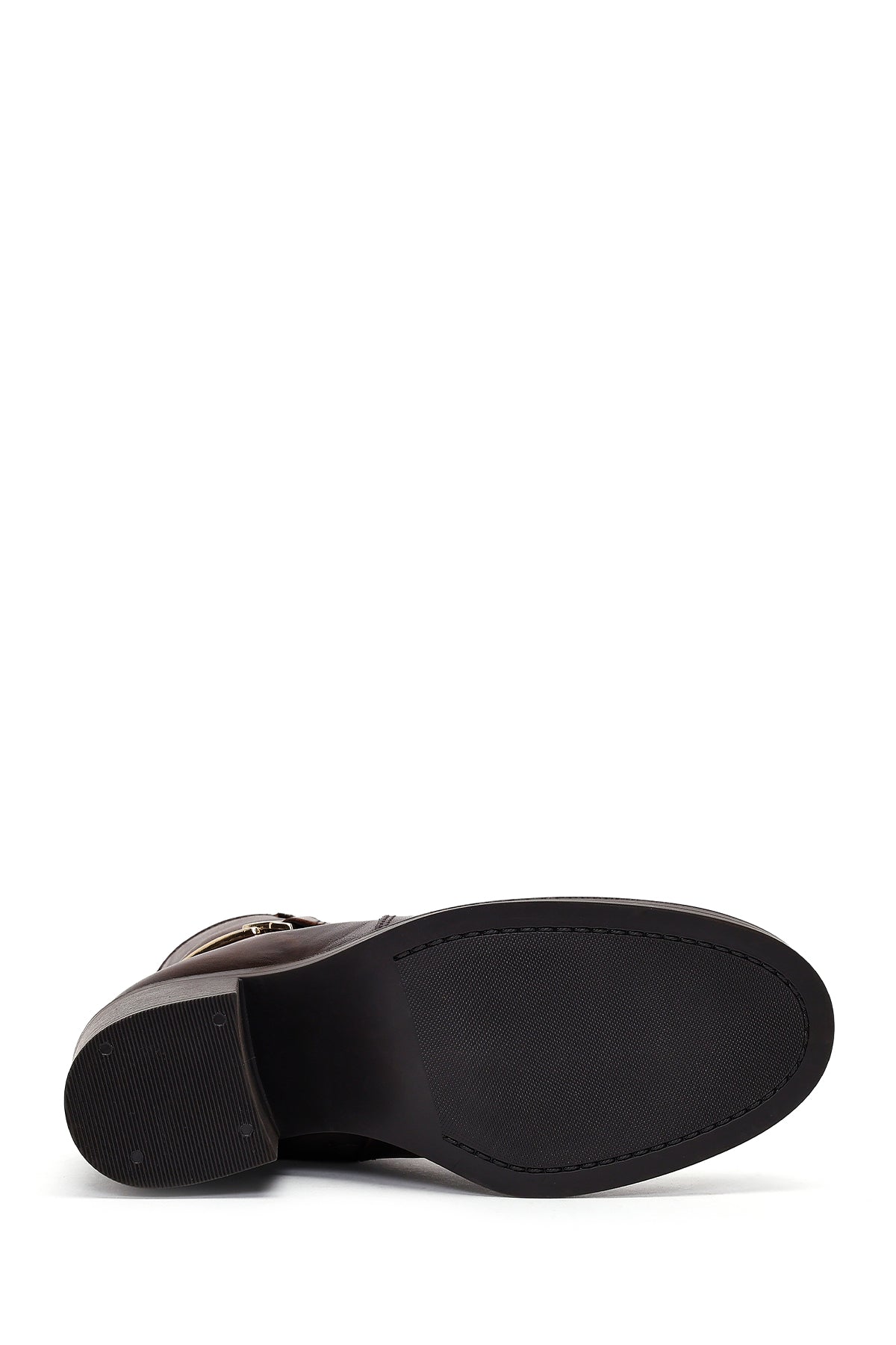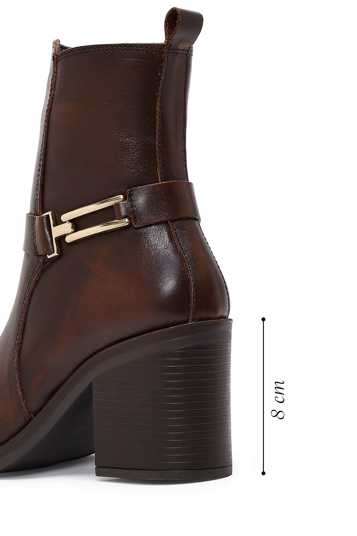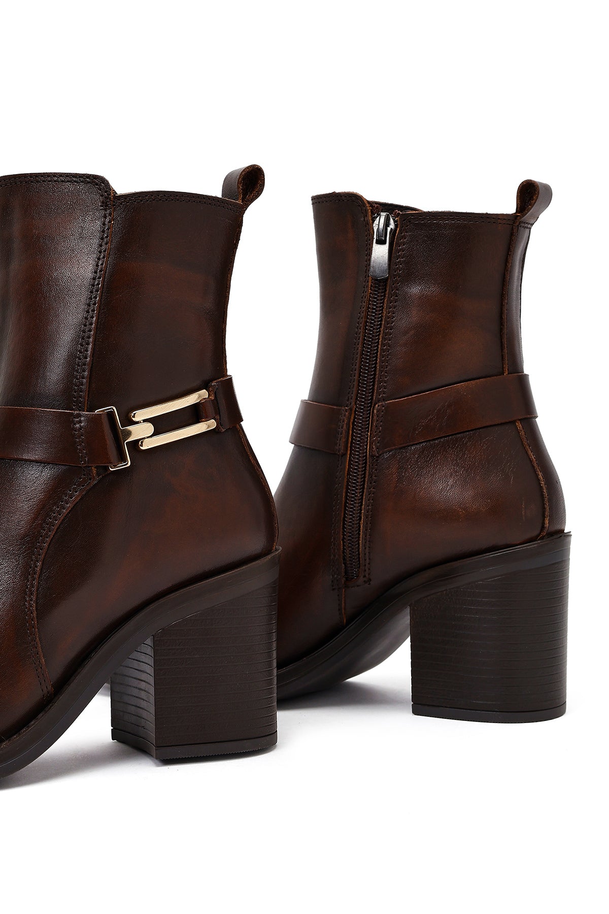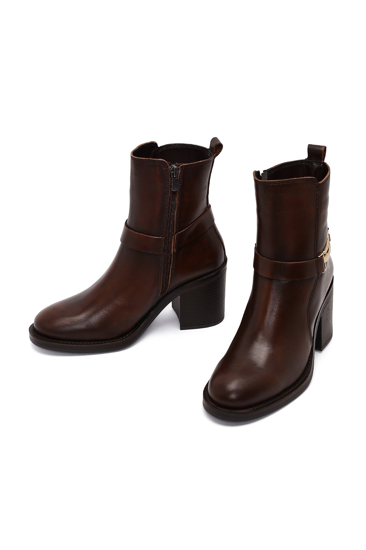 Kadın Kahverengi Tokalı Kalın Topuklu Deri Bot