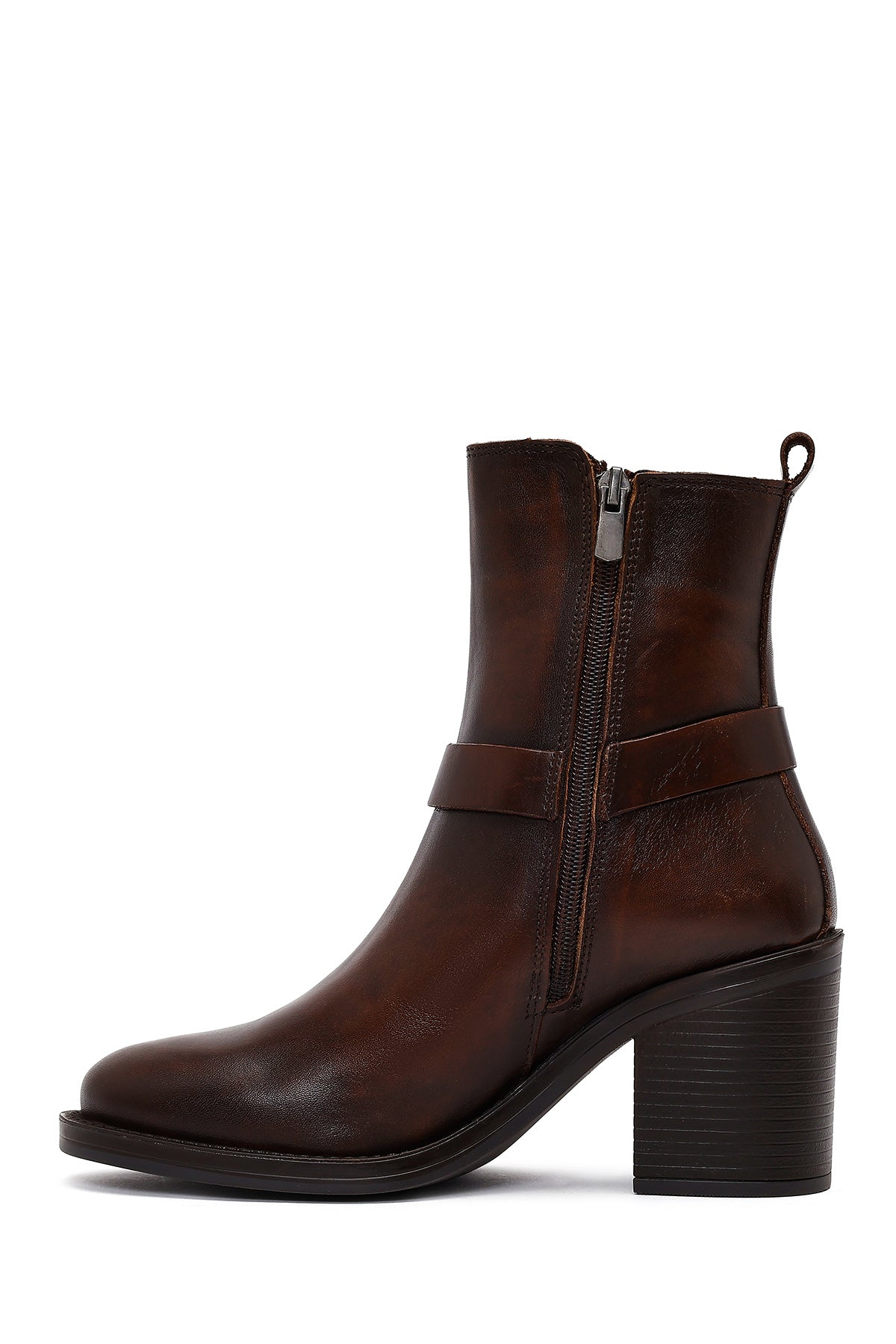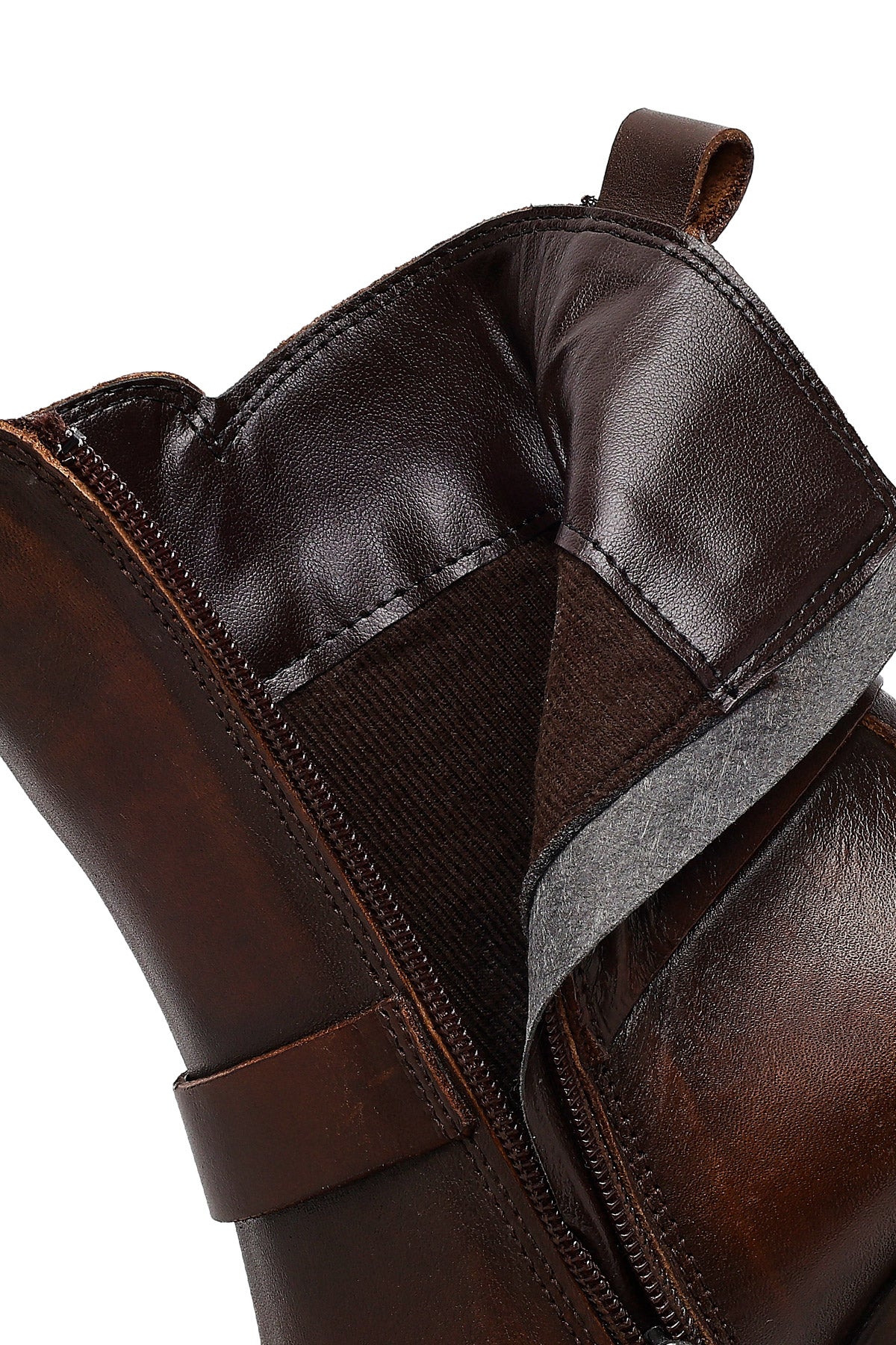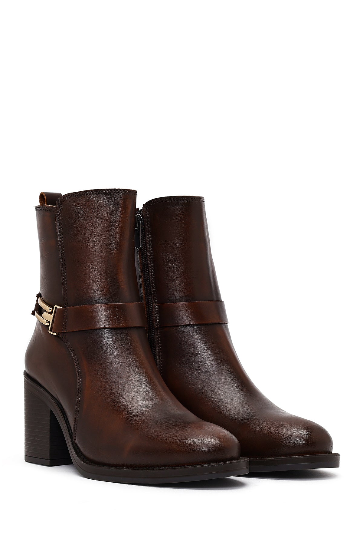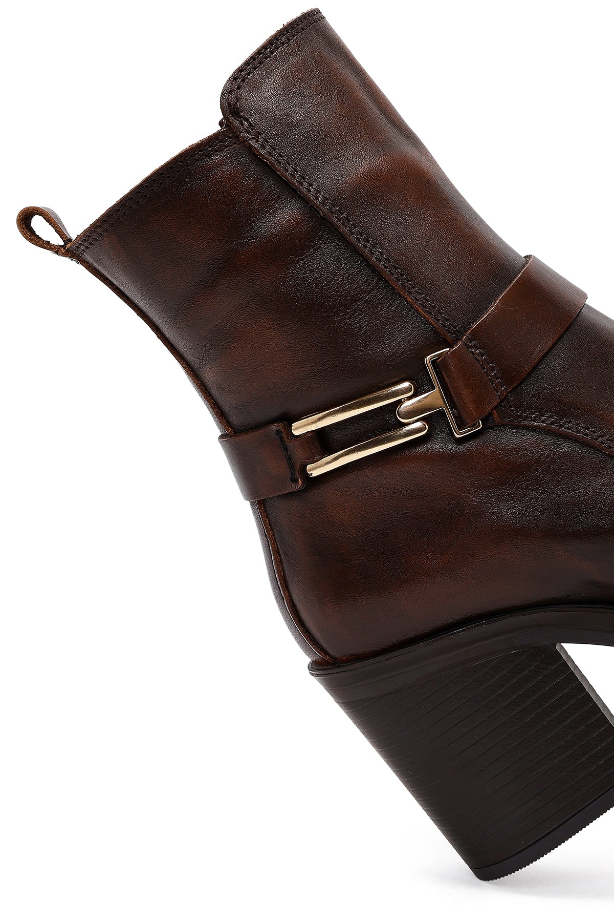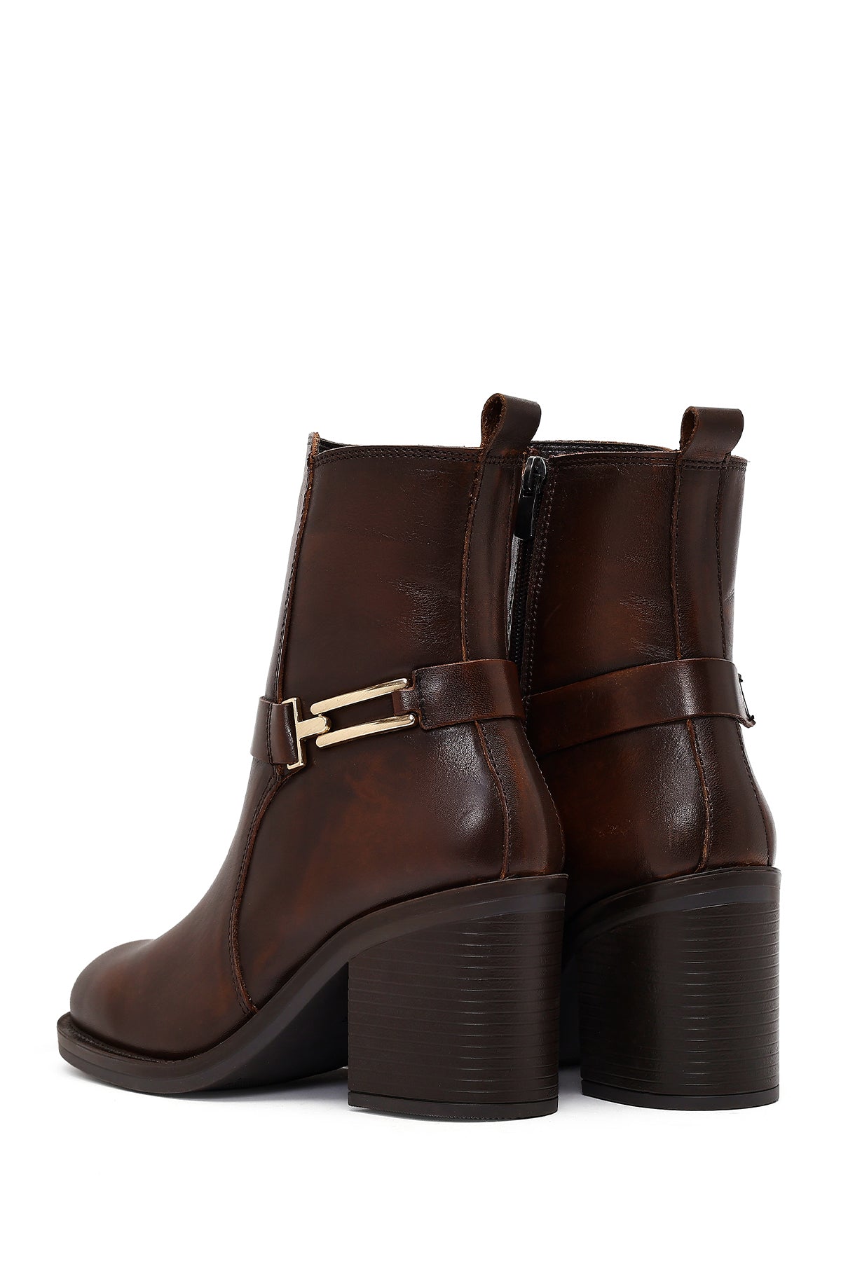 Kadın Kahverengi Tokalı Kalın Topuklu Deri Bot