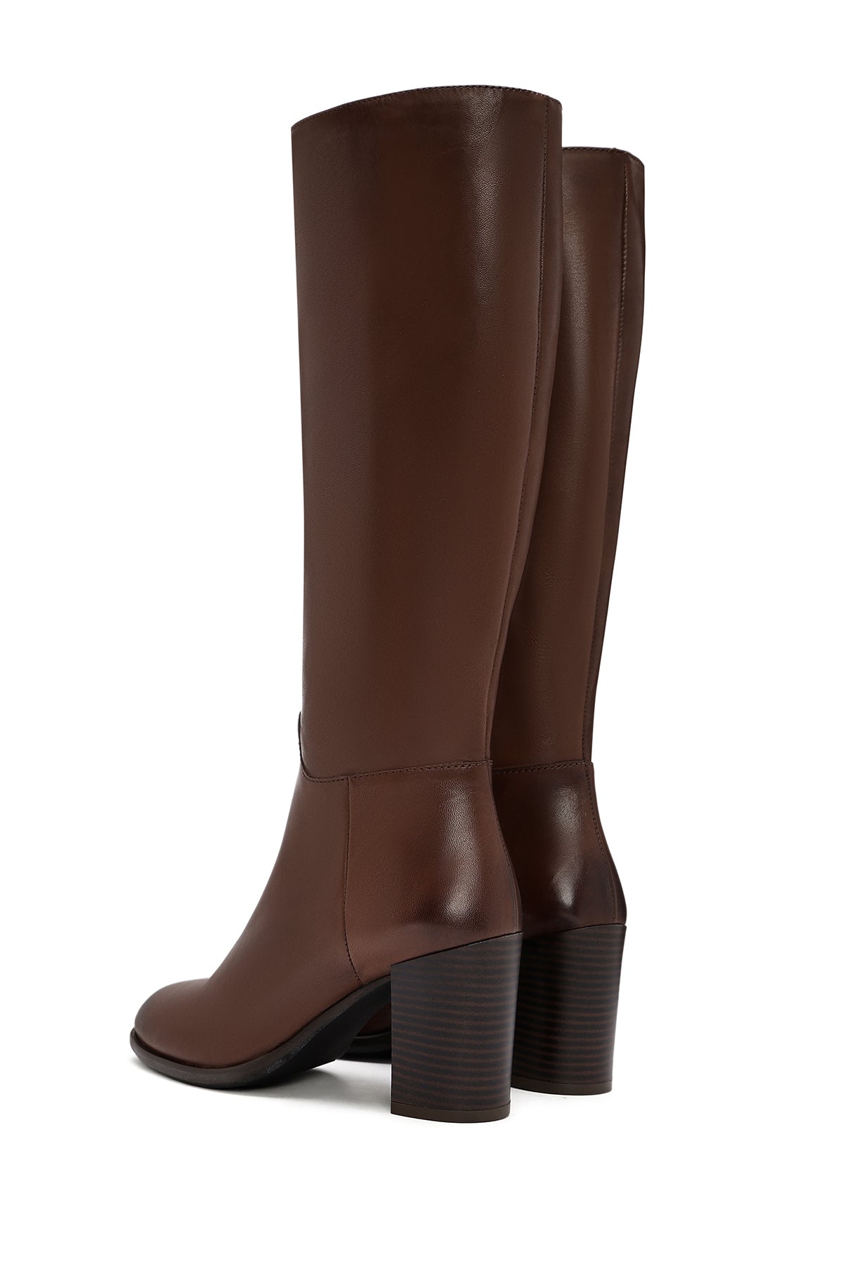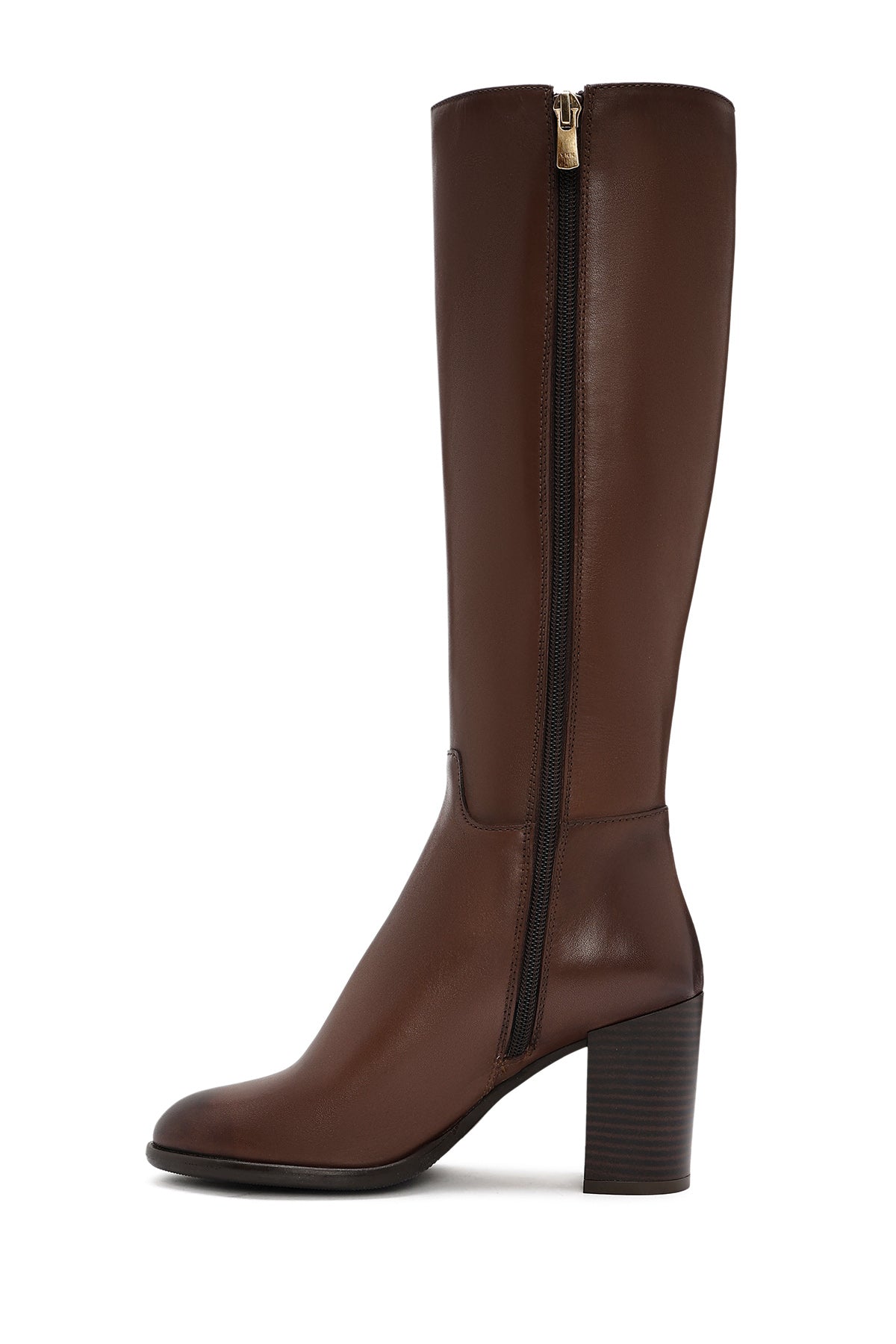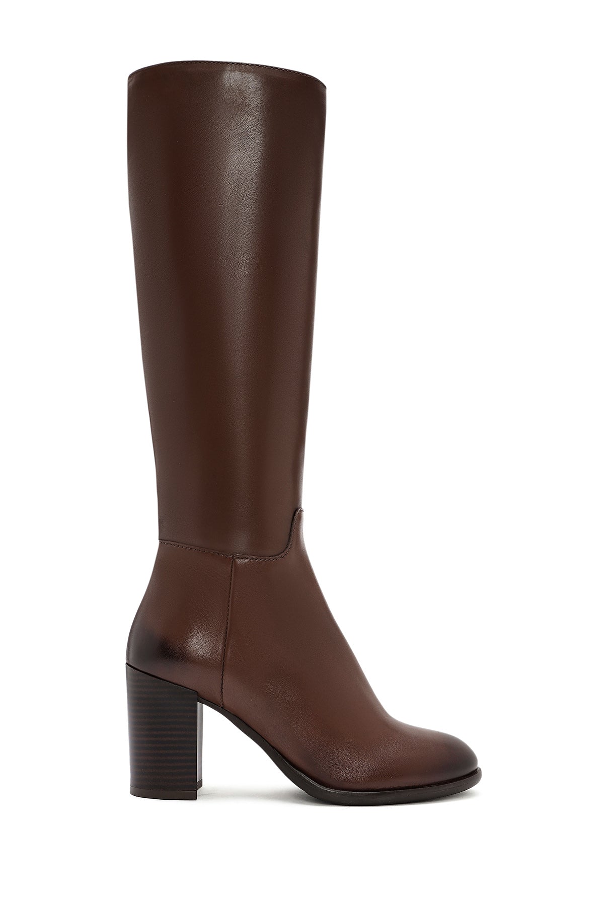 Kadın Kahverengi Fermuarlı Kalın Topuklu Deri Çizme