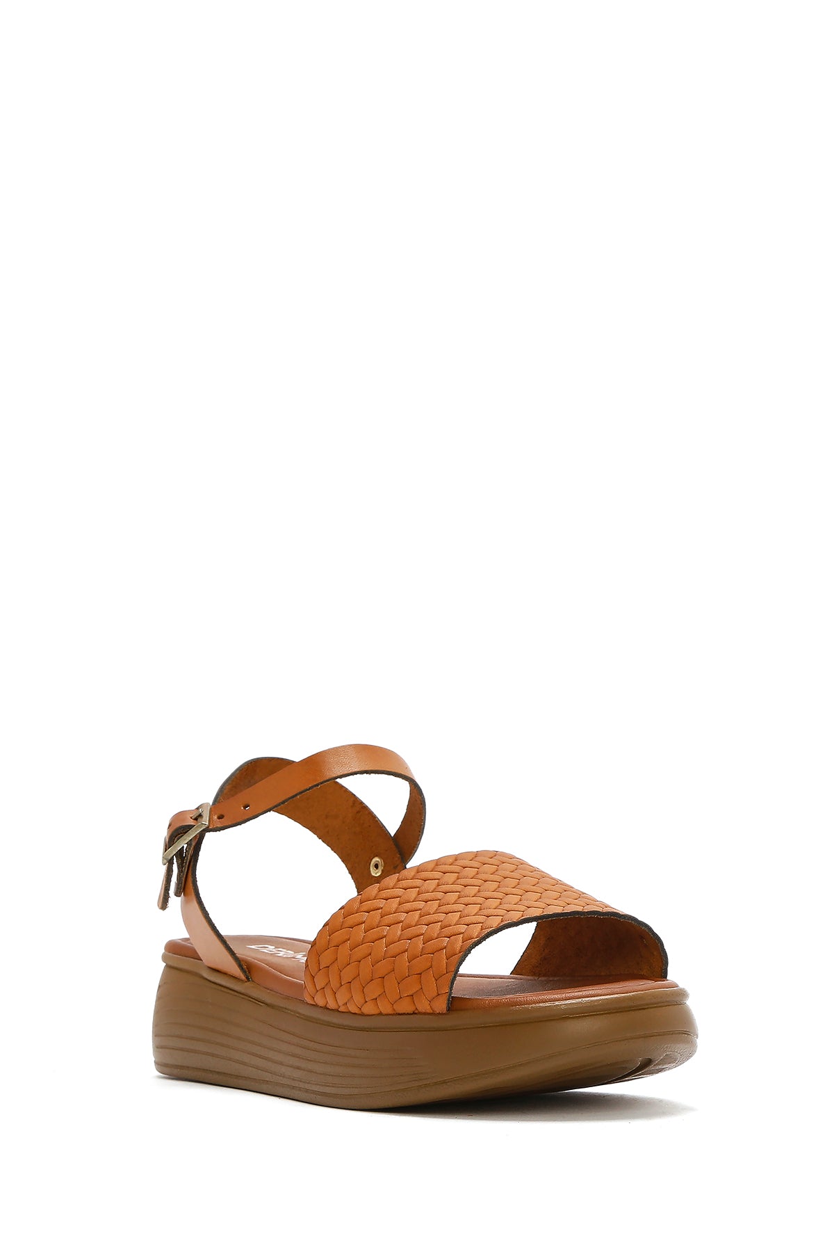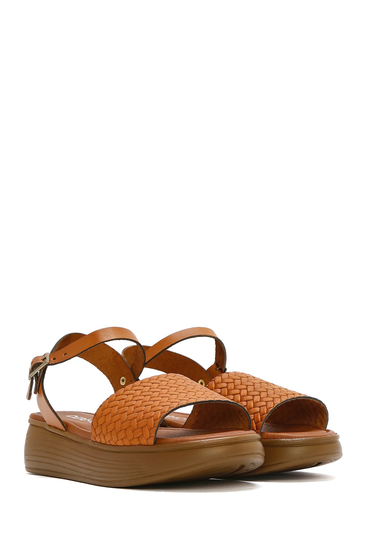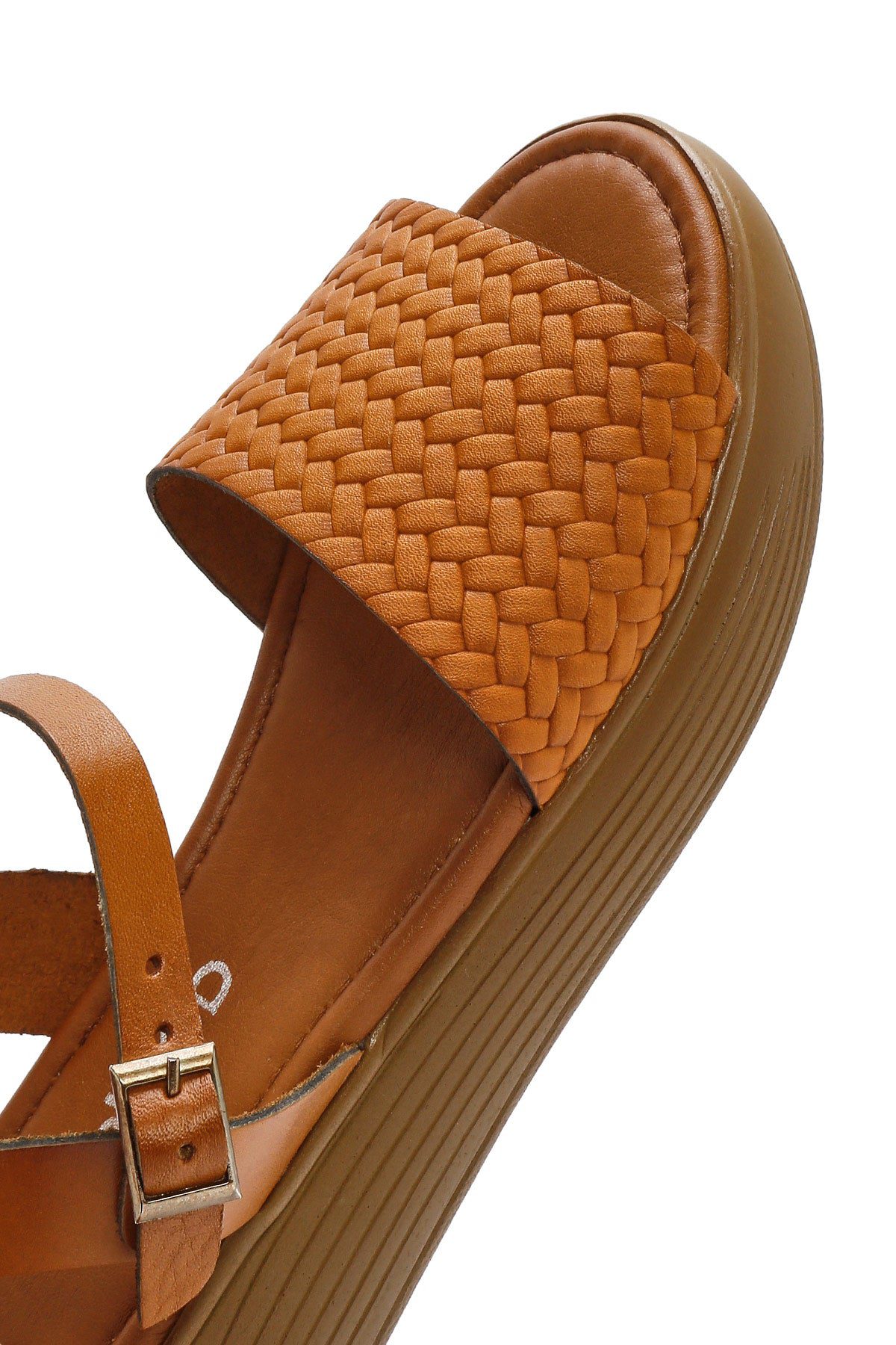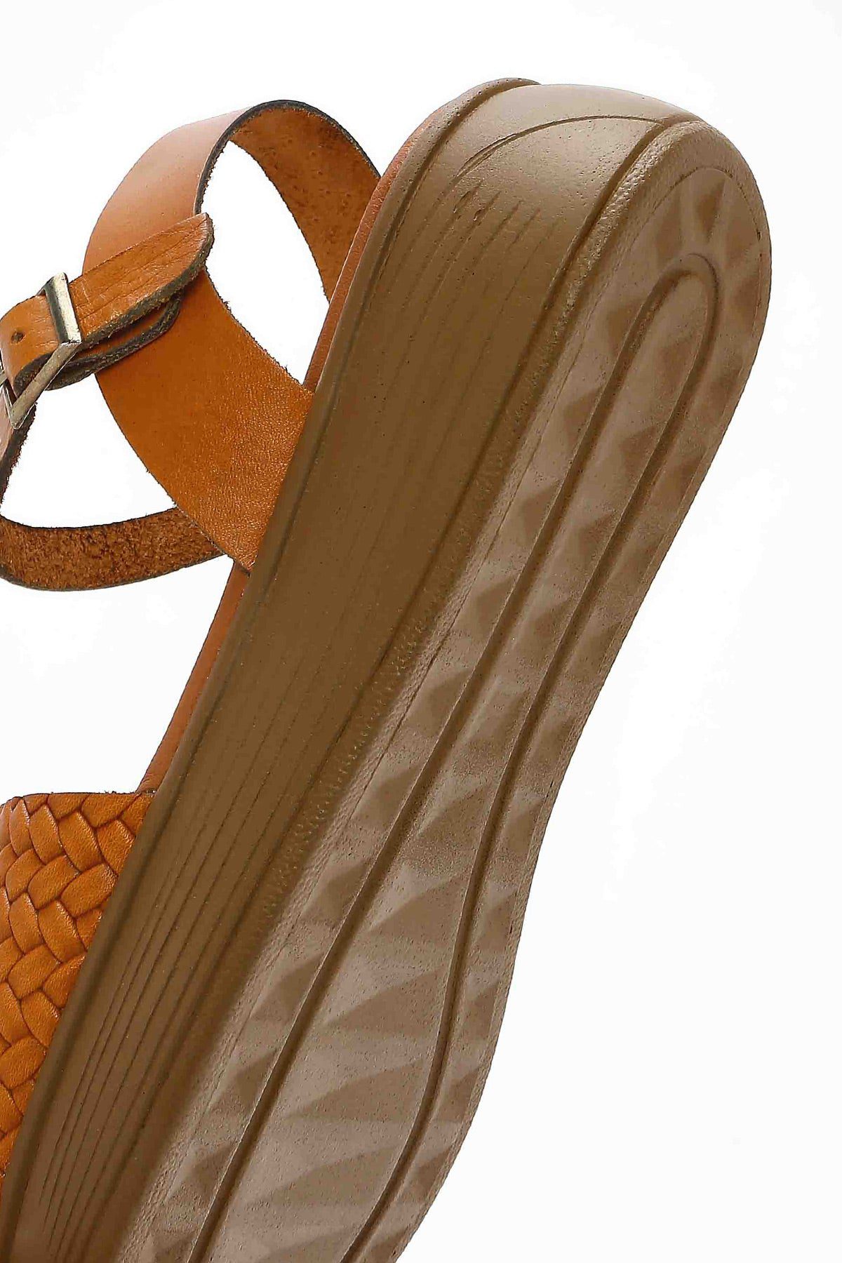 Kadın Taba Bilekten Bağlamalı Örgülü Kalın Tabanlı Deri Sandalet