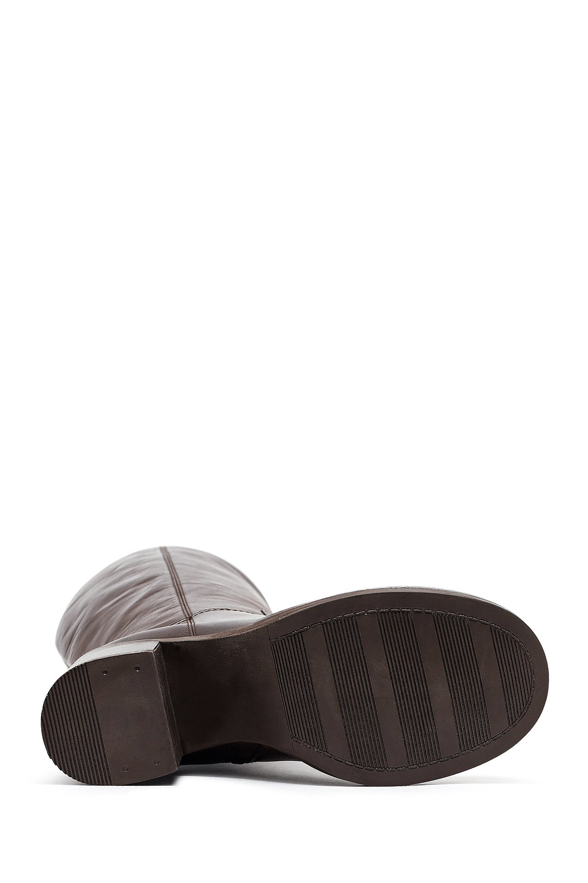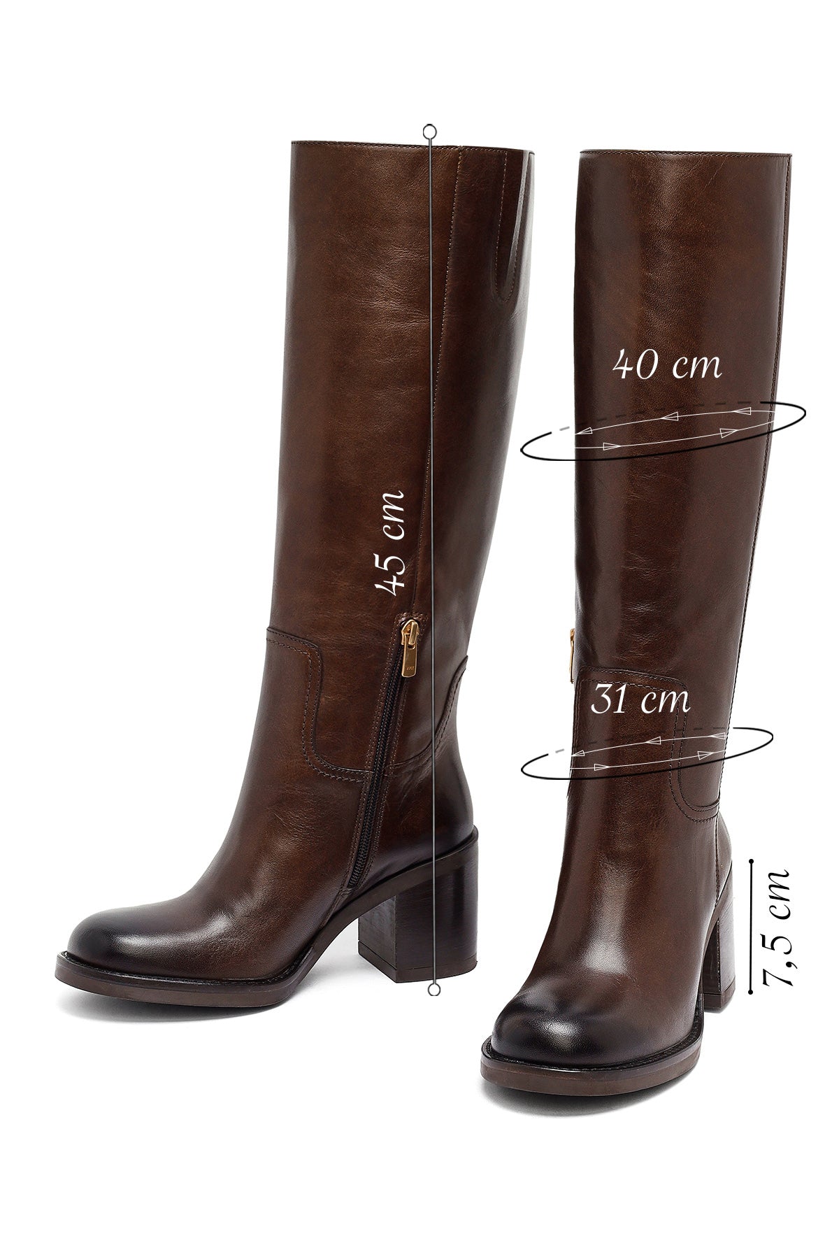 Kadın Kahverengi Fermuarlı Kalın Topuklu Deri Çizme