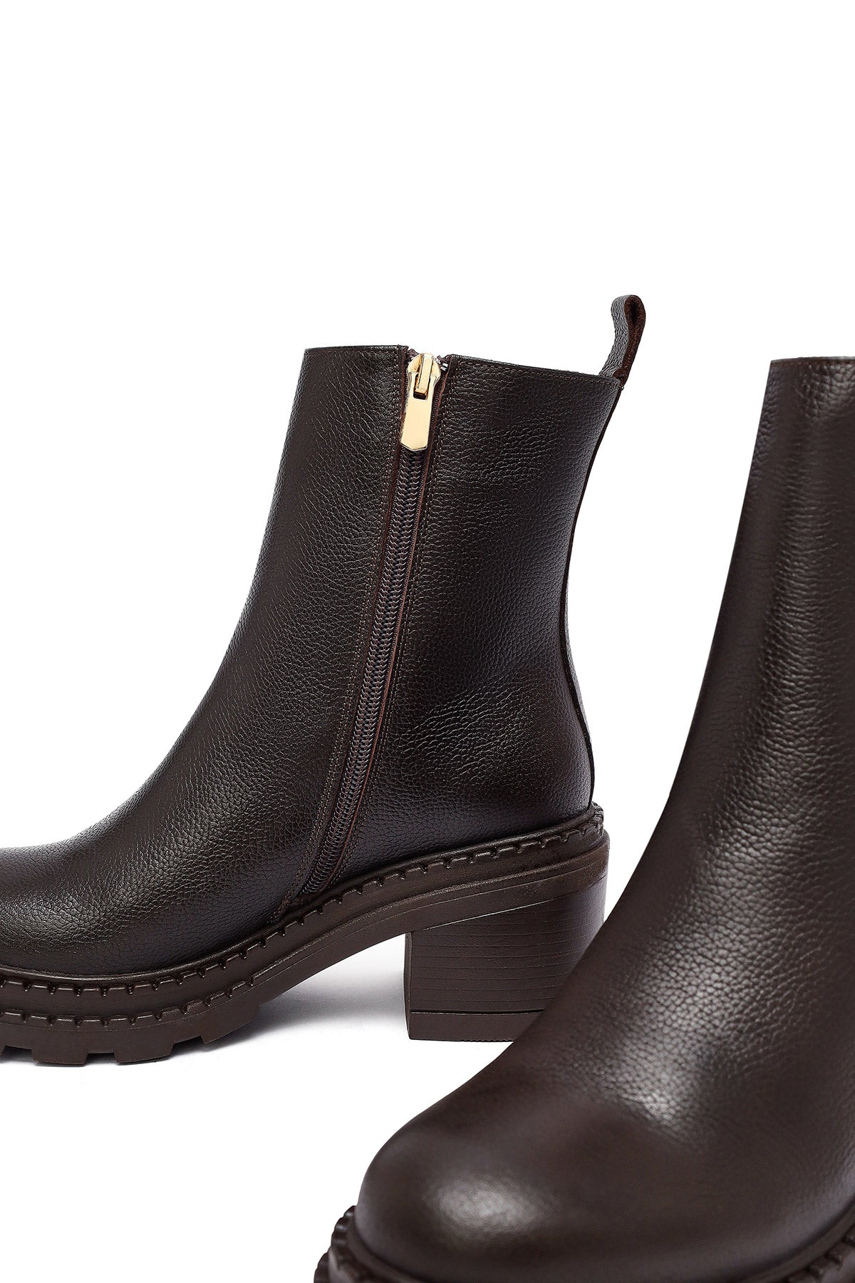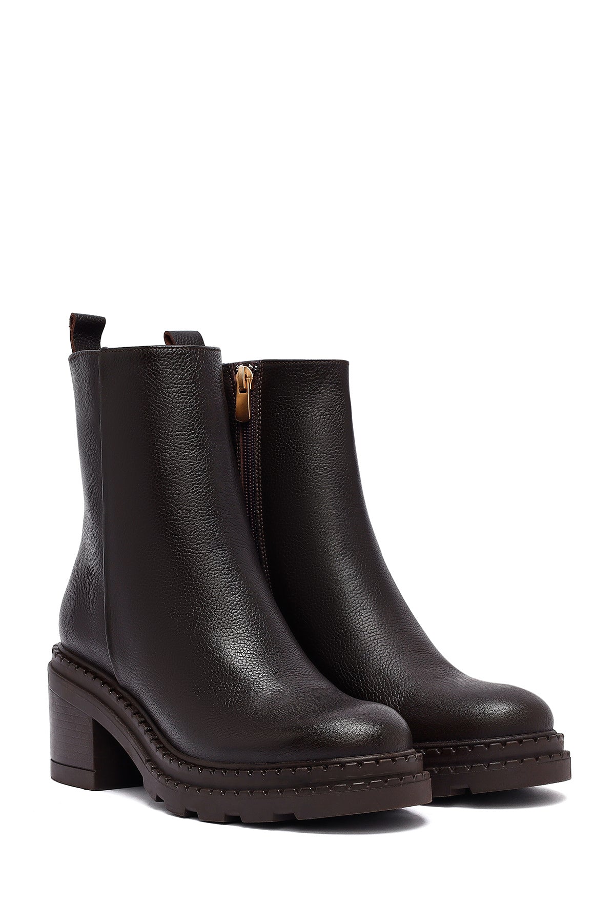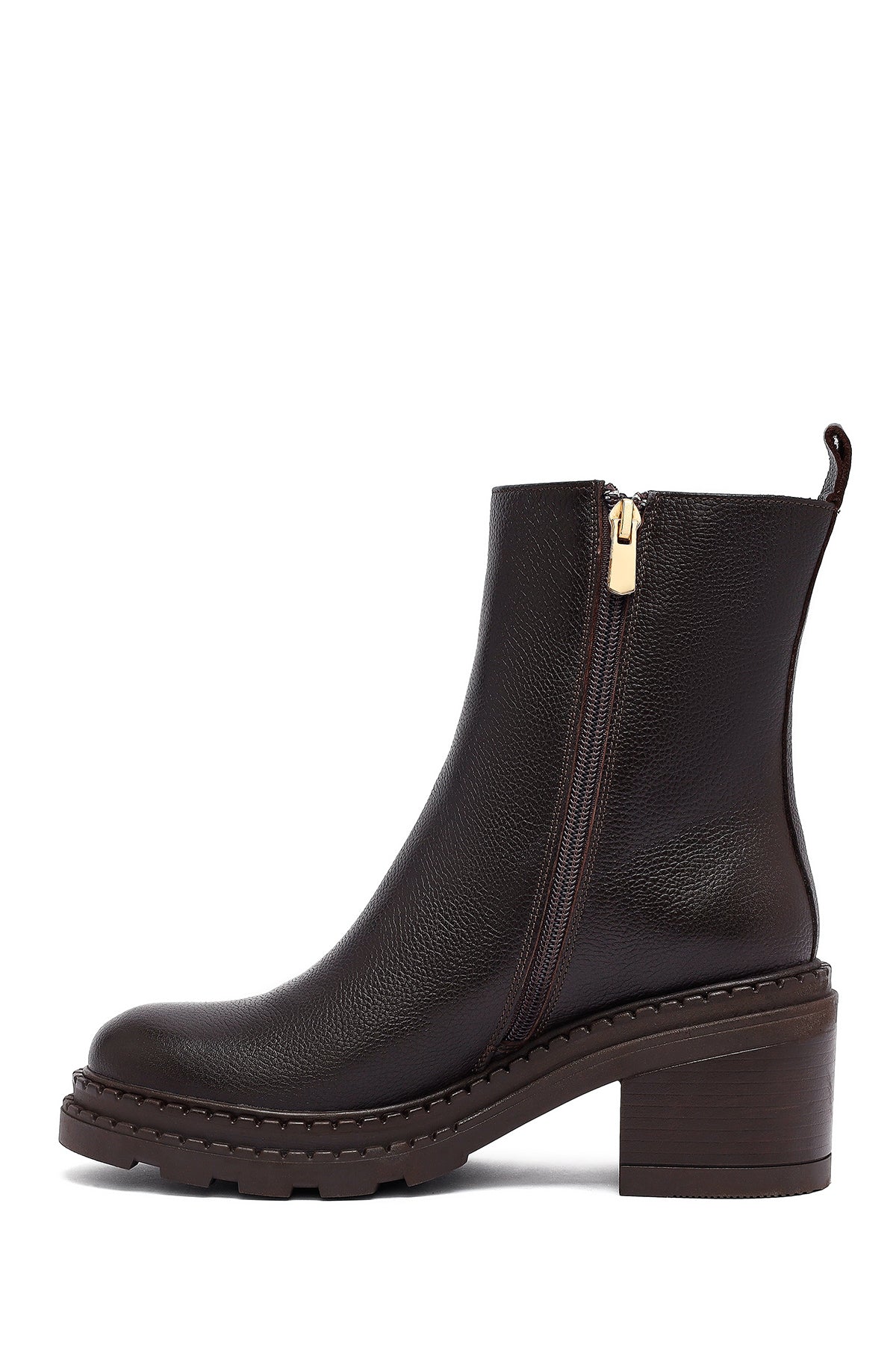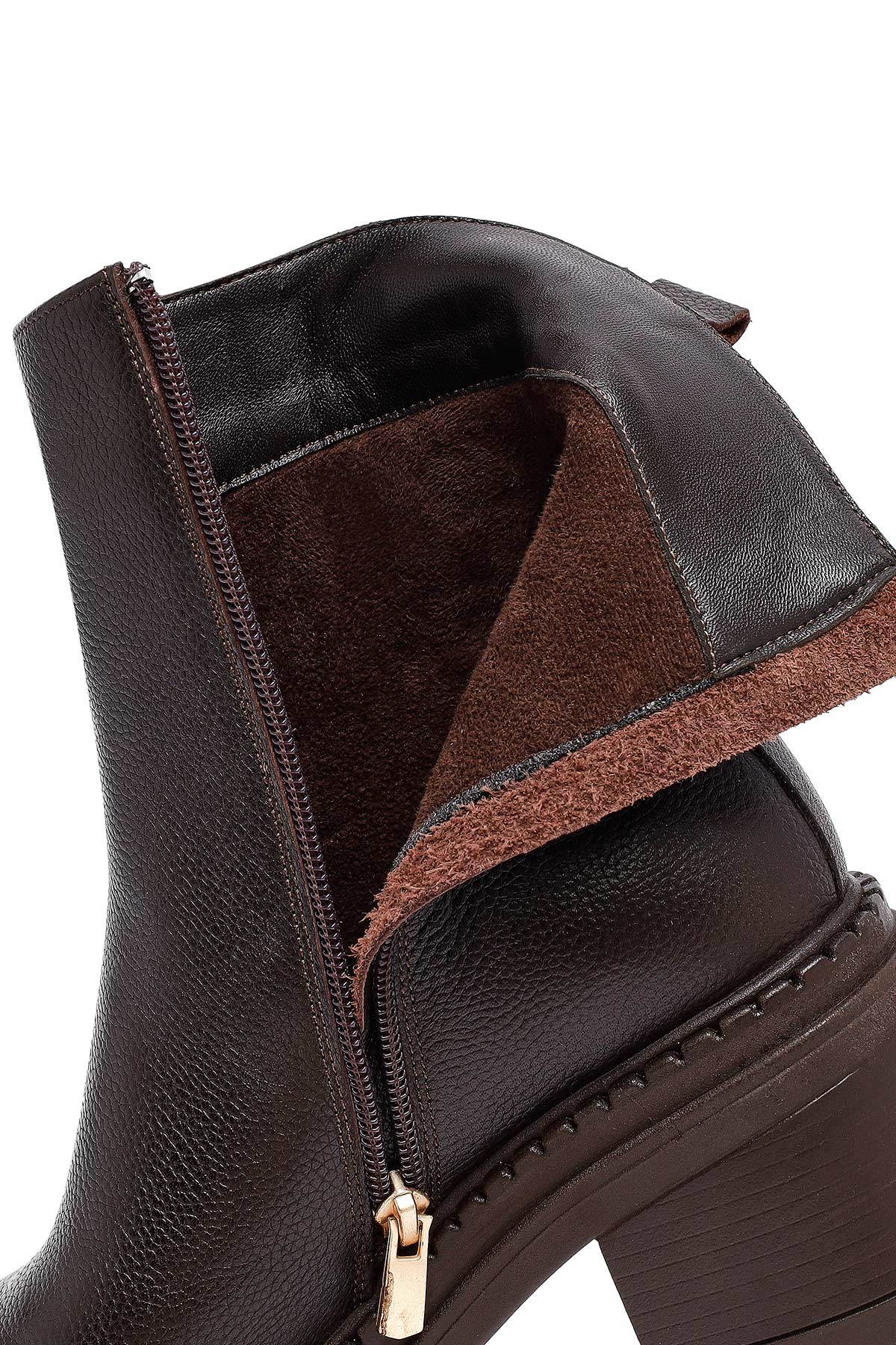 Kadın Kahverengi Fermuarlı Kalın Topuklu Deri Bot