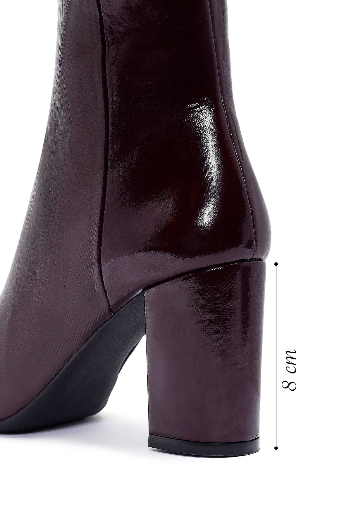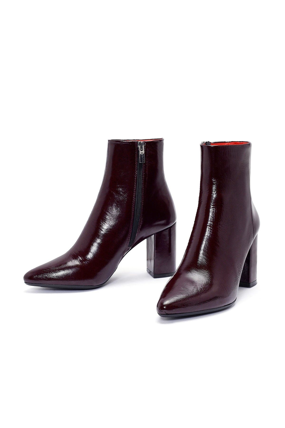 بوت زنانه زرشکی چرمی براق زیپدار پاشنه ضخیم دری مد