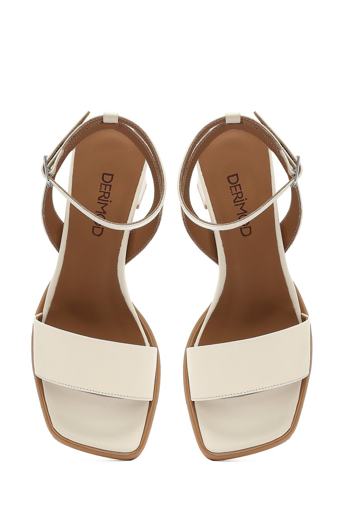 Kadın Krem Bilekten Tokalı Kalın Topuklu Deri Sandalet