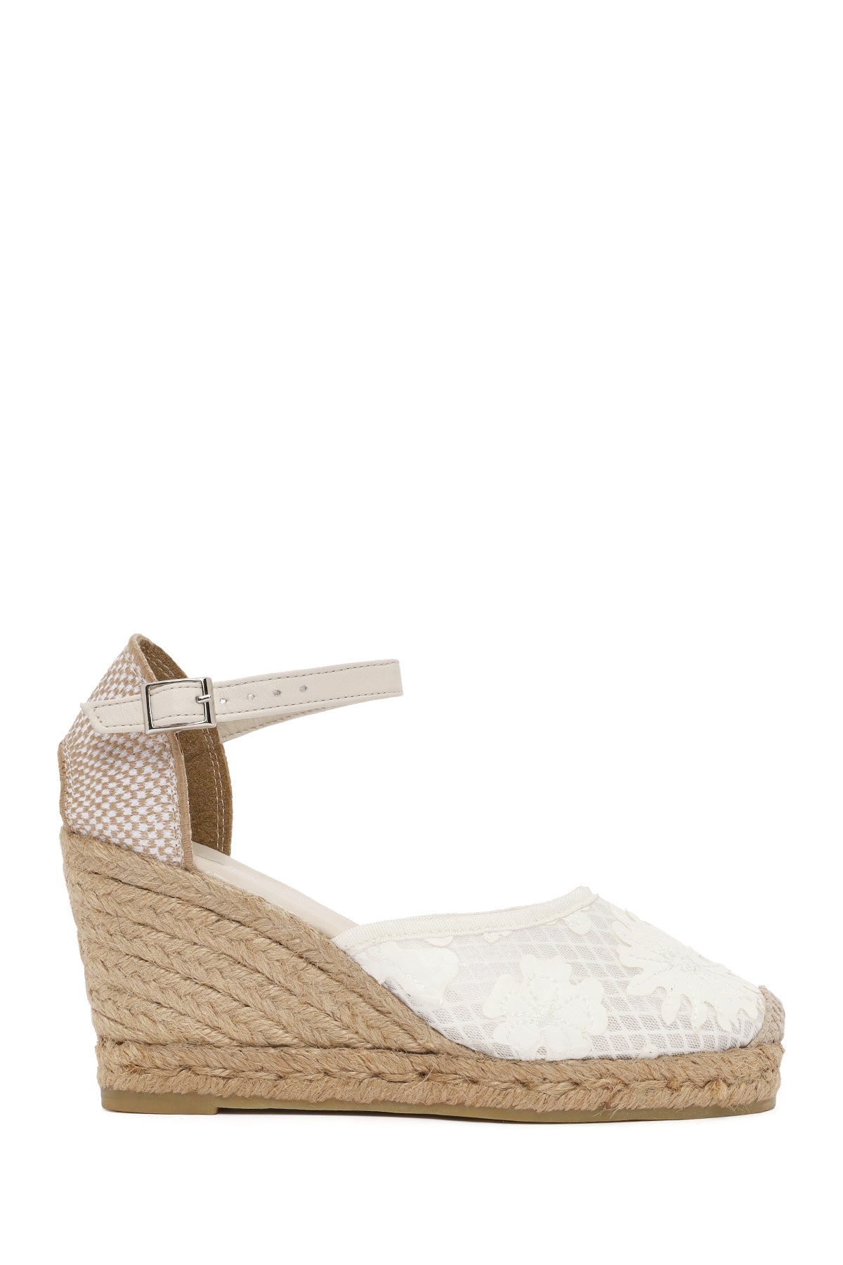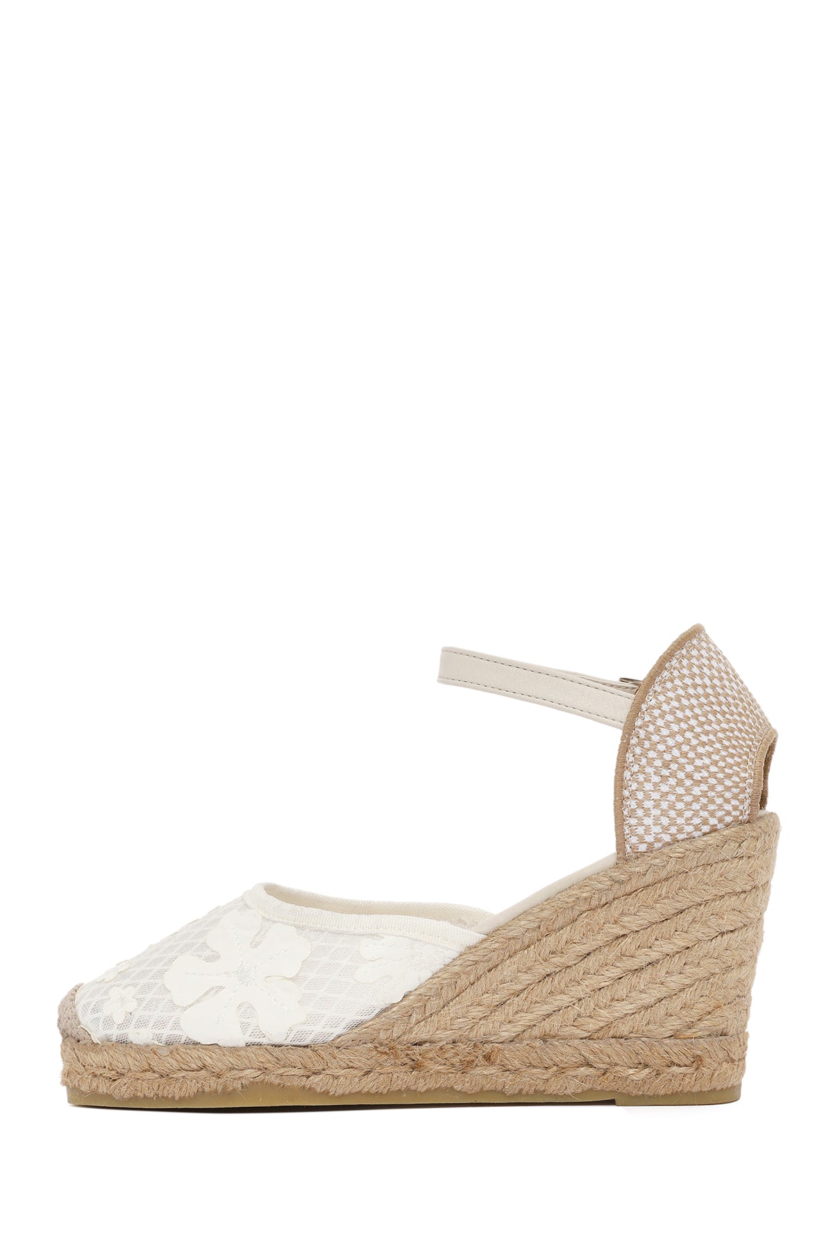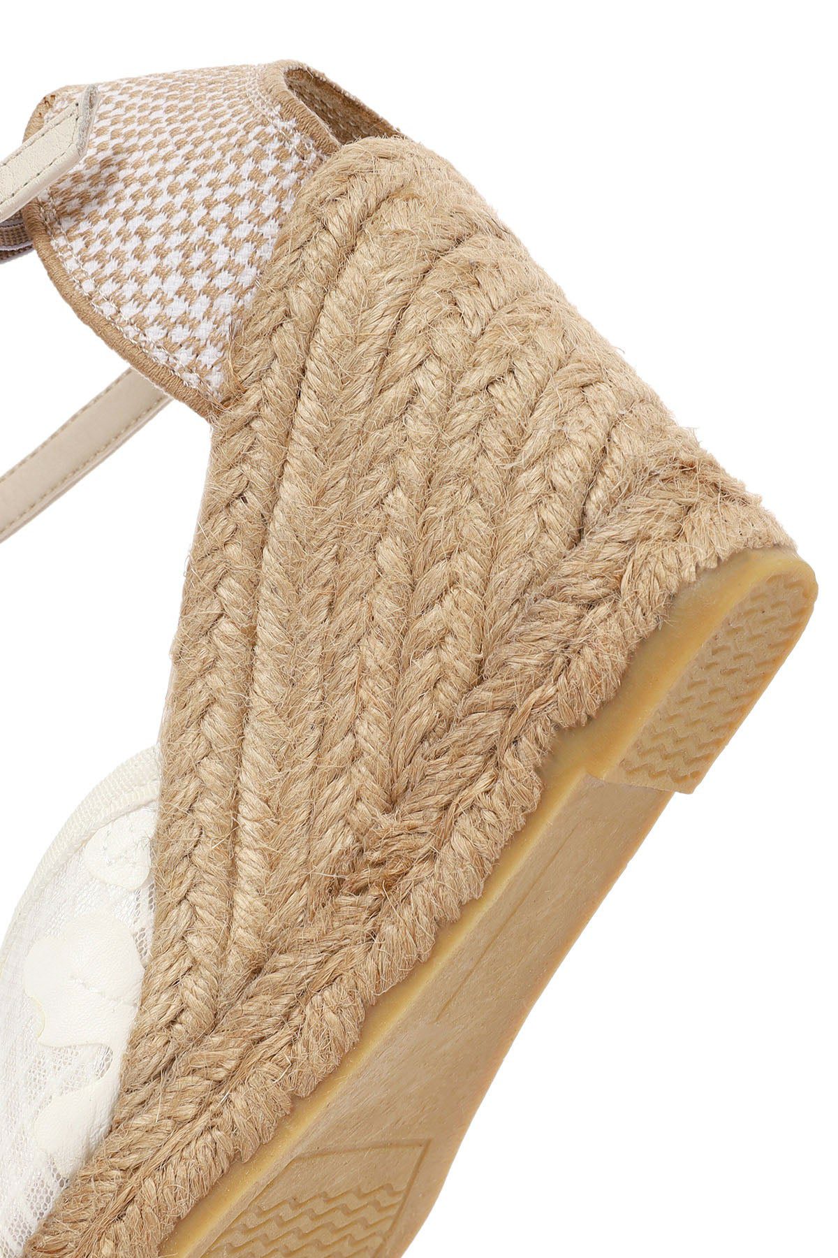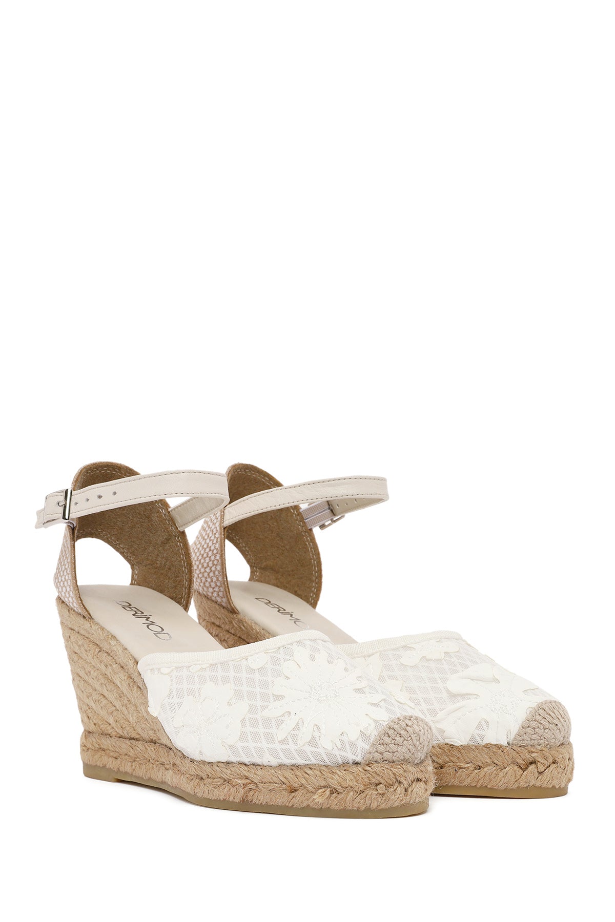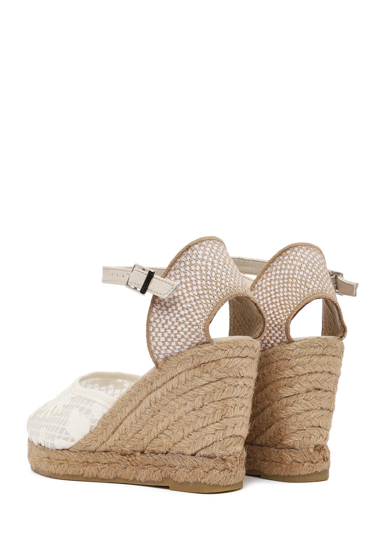 Kadın Krem Bilekten Bantlı Desenli Dolgu Topuklu Espadril