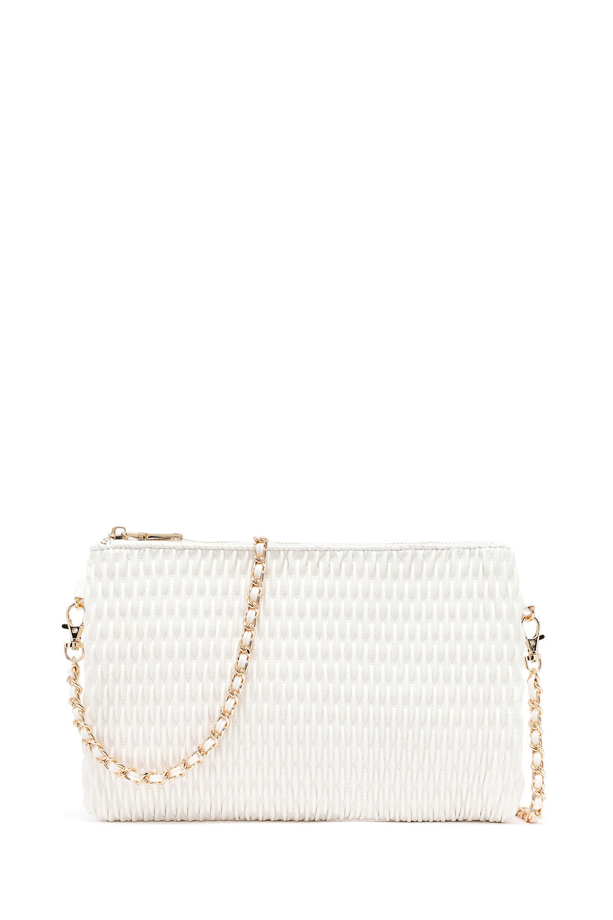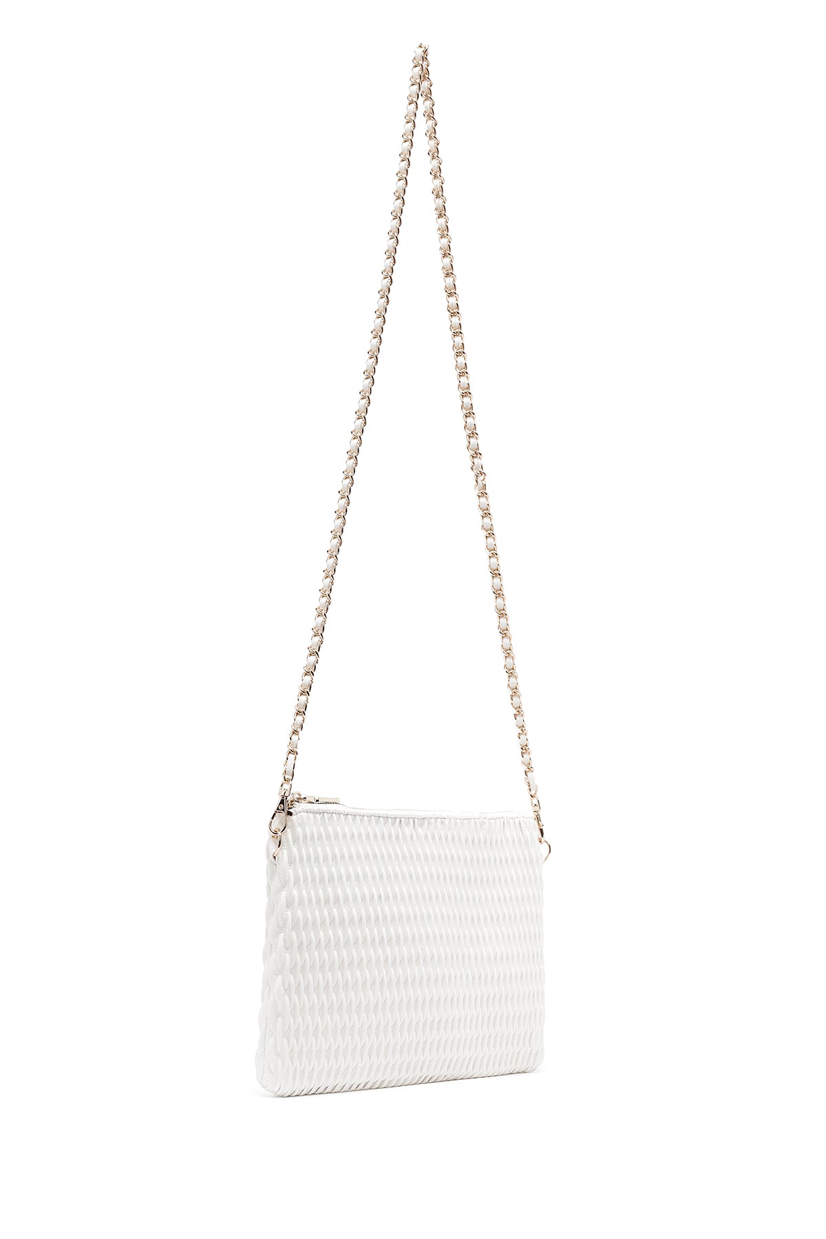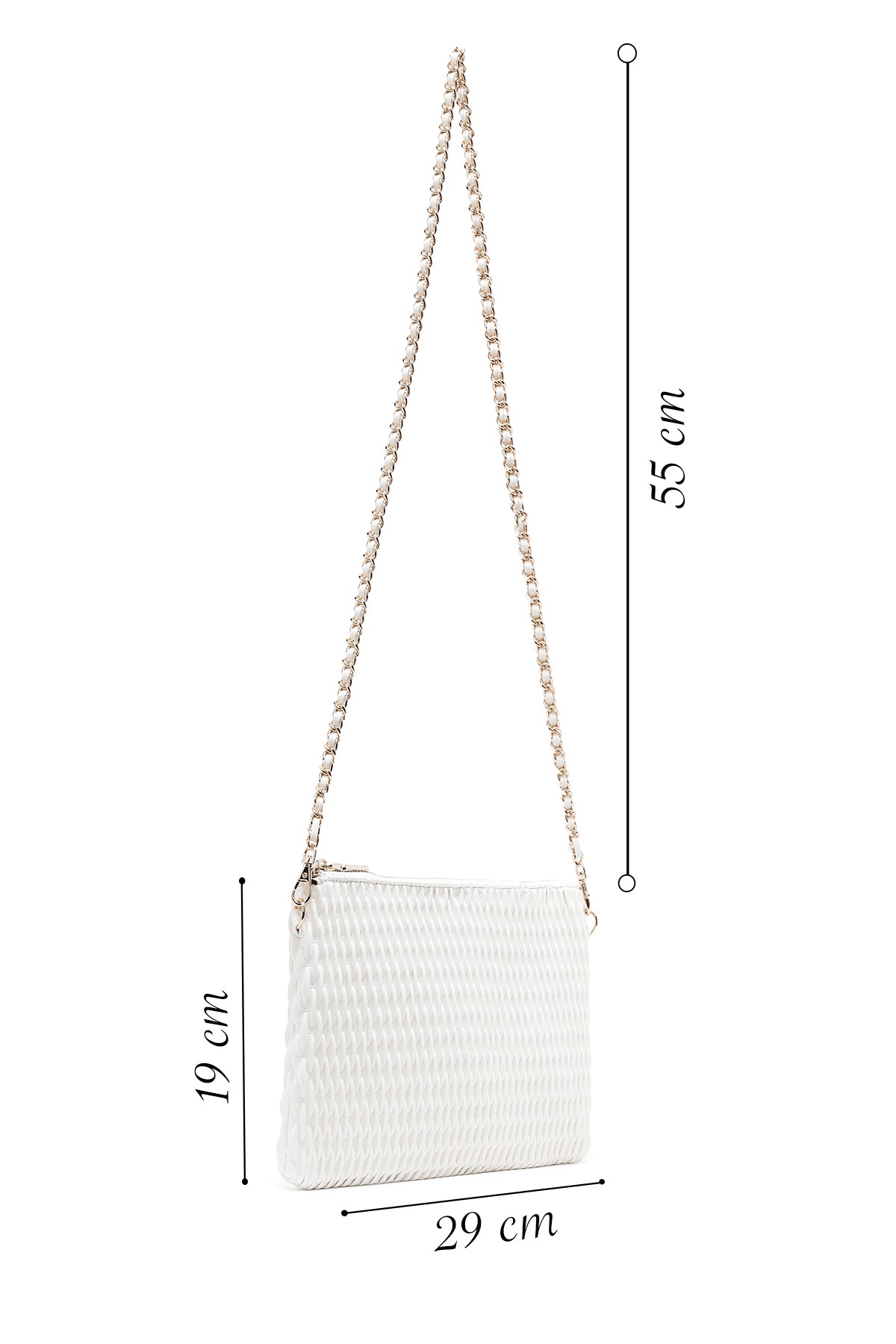 کیف مجلسی زنانه کرم طرحدار با بند زنجیری بلند دری مد