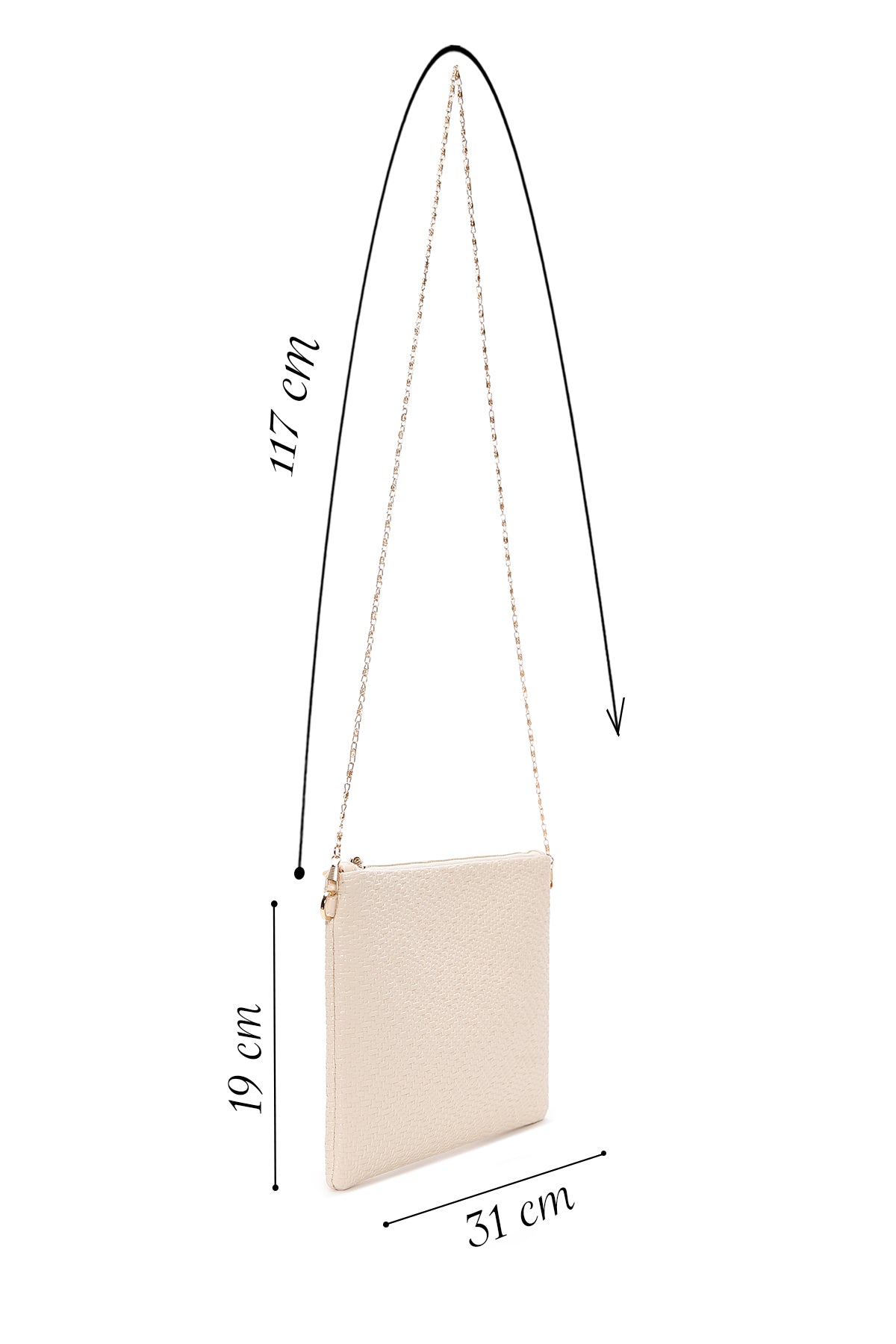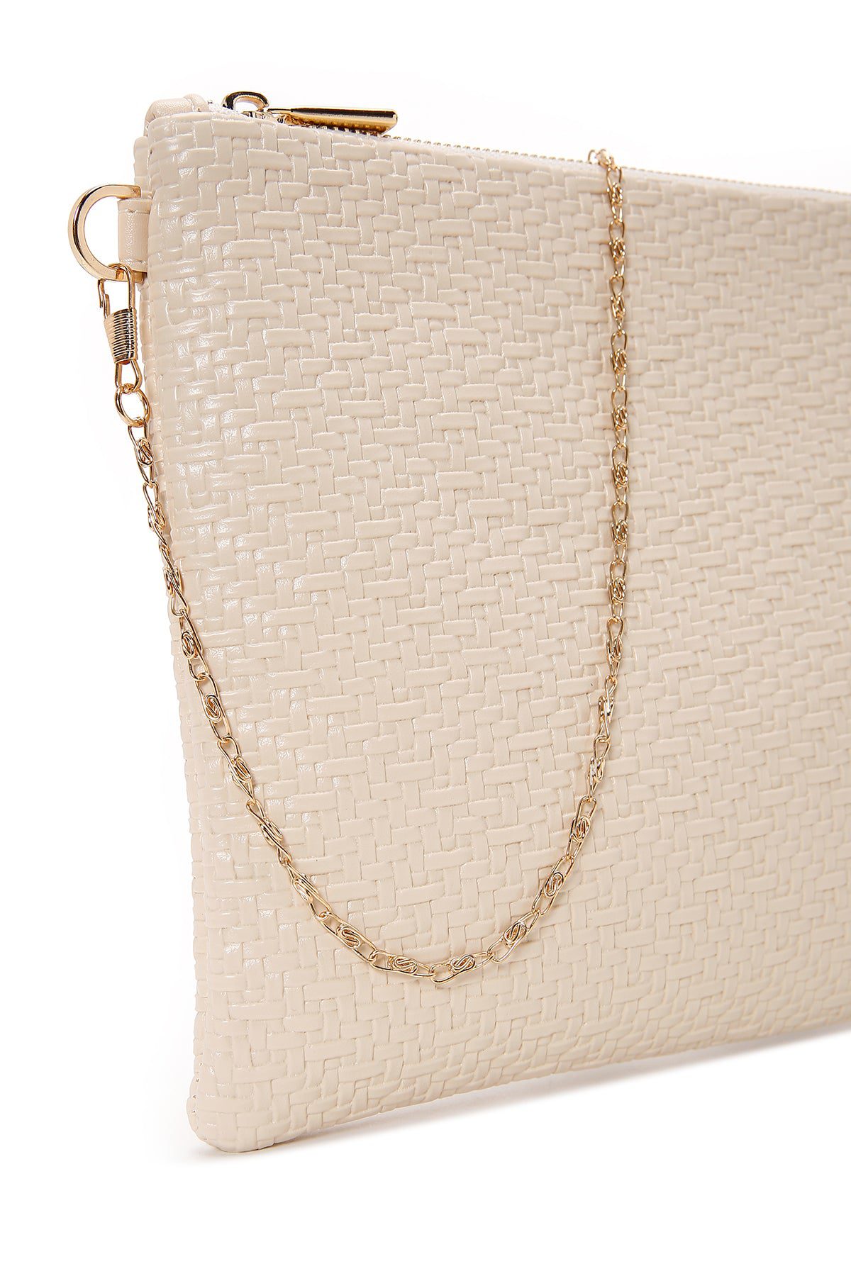 کیف مجلسی زنانه کرم دستی بافتدار با بند زنجیری بلند دری مد