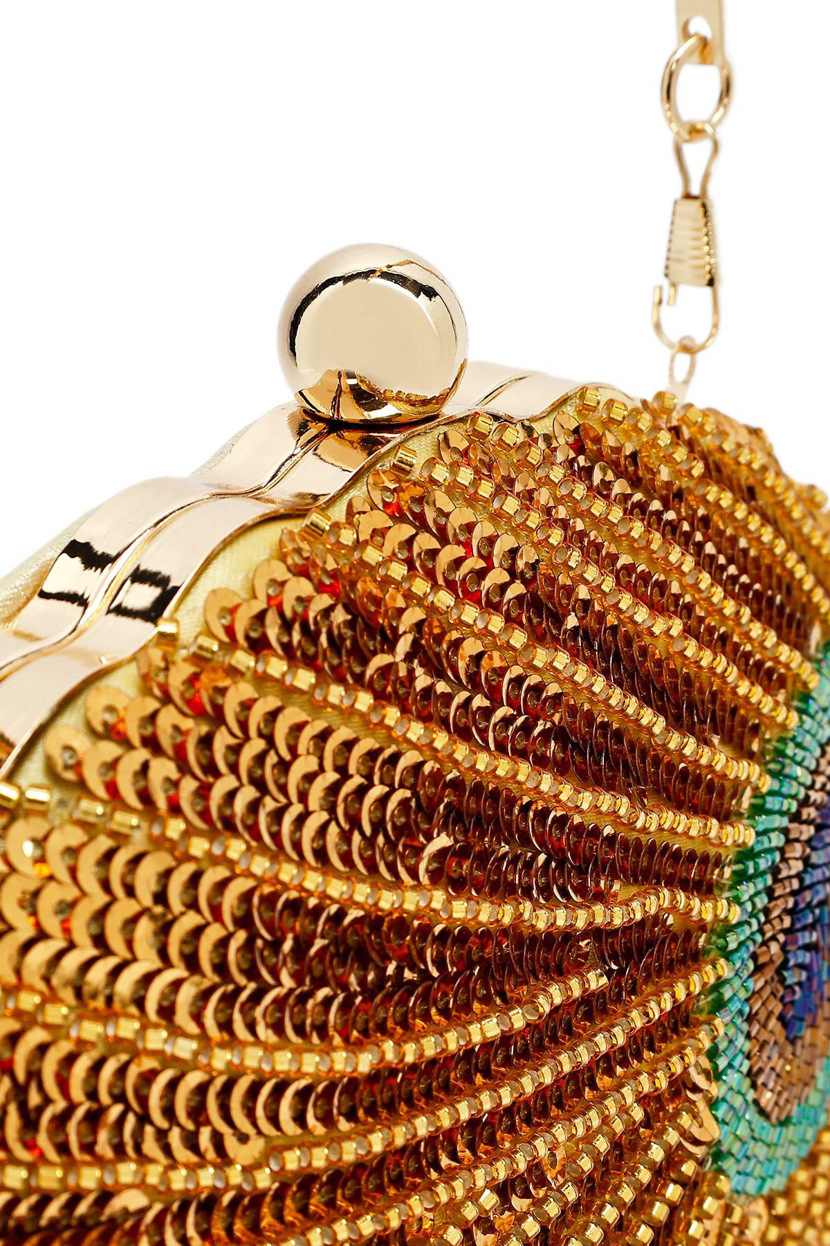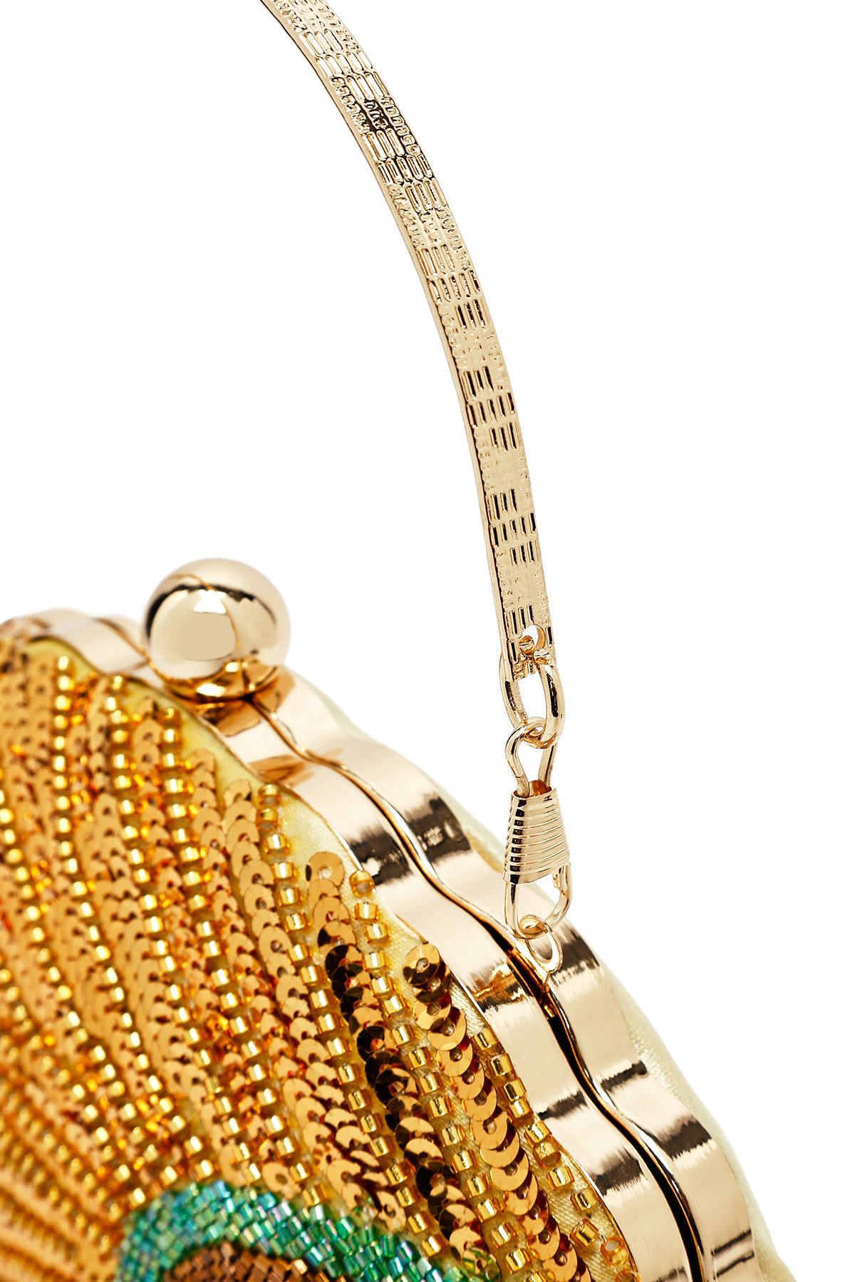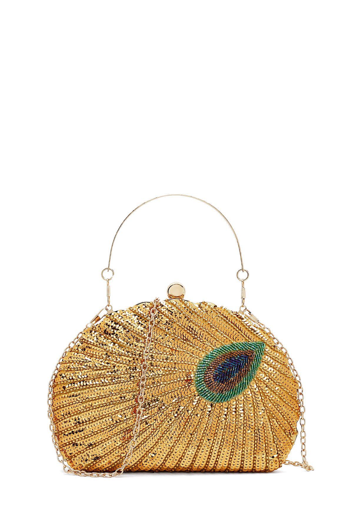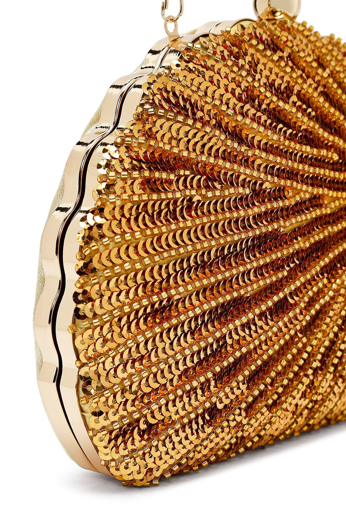 Kadın Altın Uzun Zincir Askılı Pullu Kutu Abiye Kol Çantası