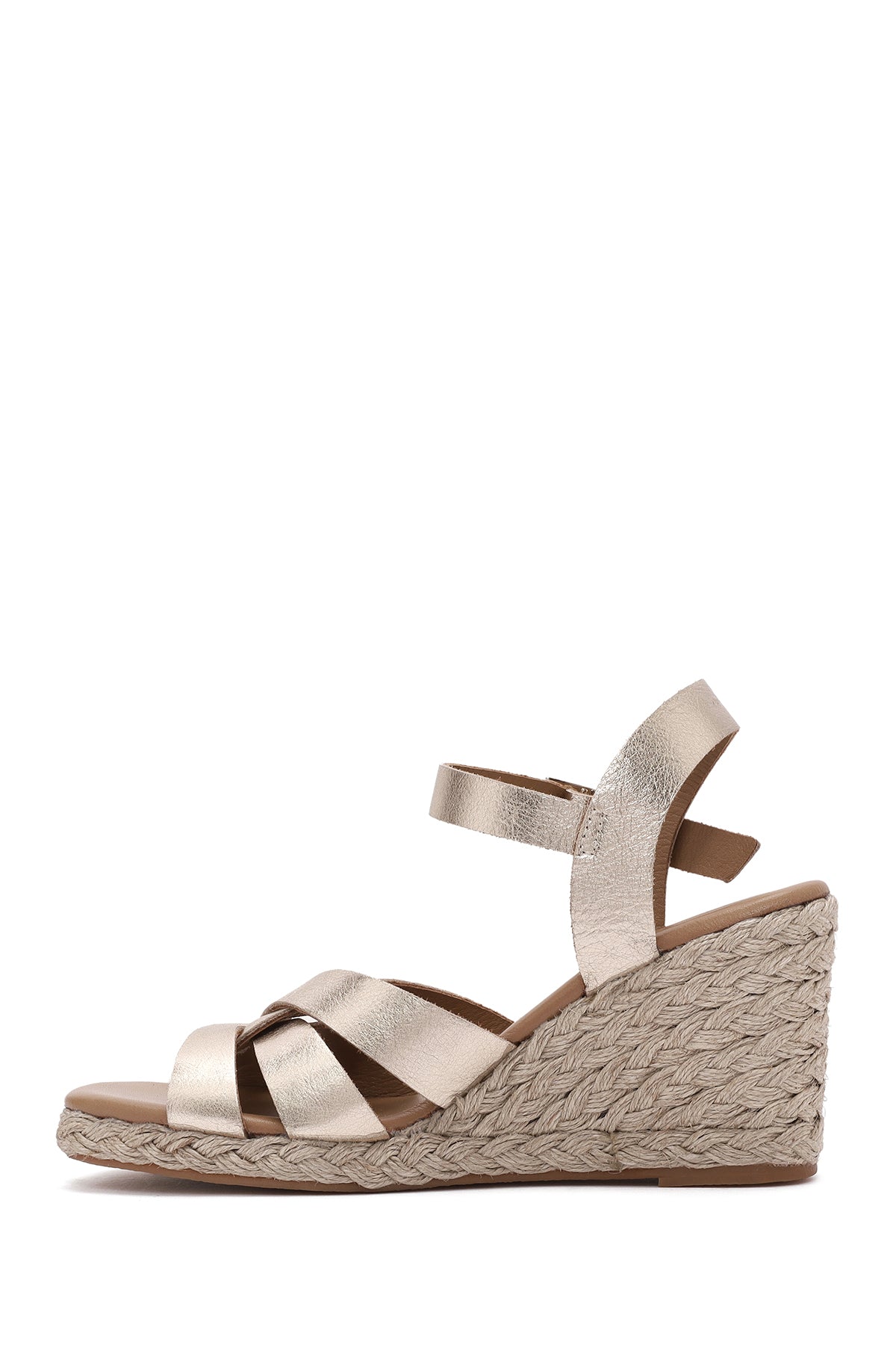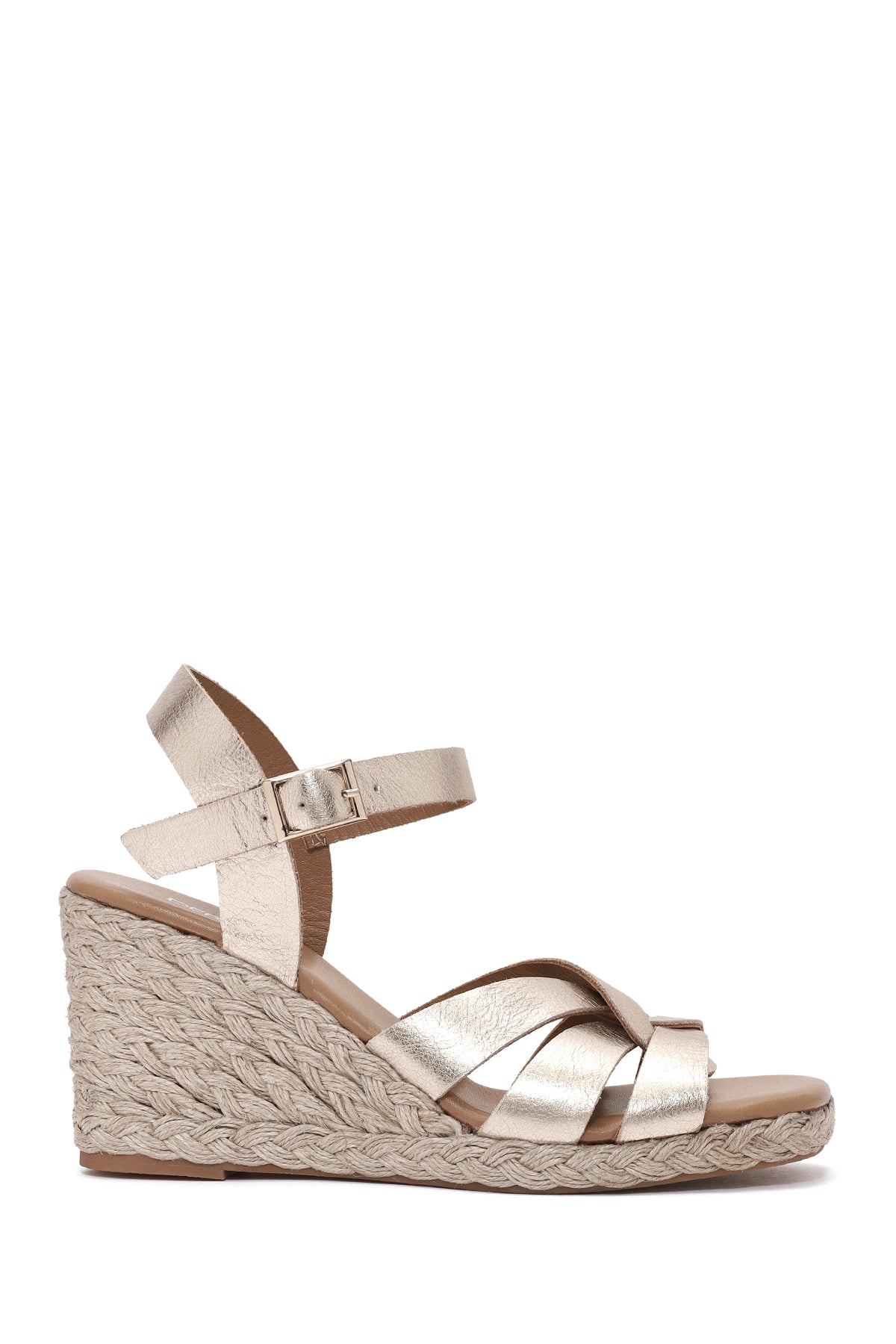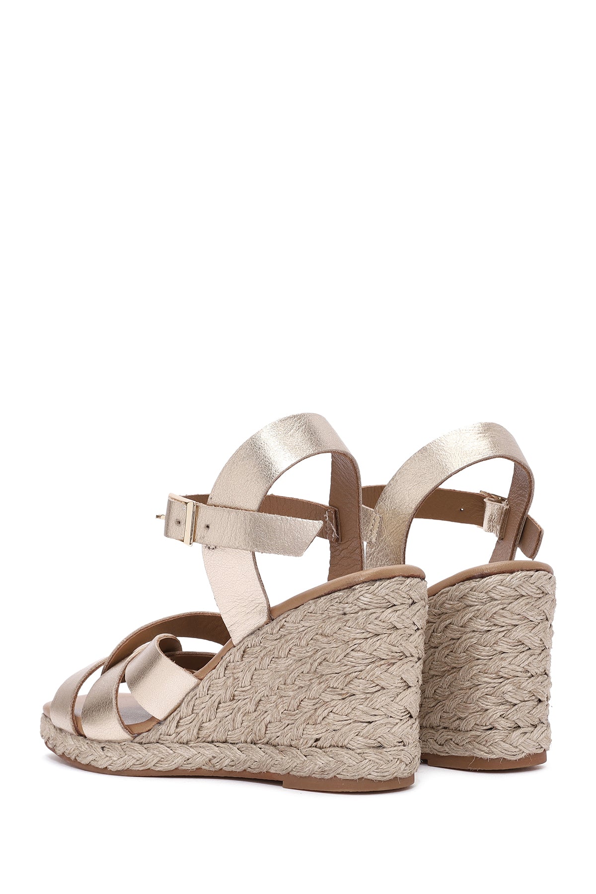 Kadın Altın Bilekten Tokalı Dolgu Topuklu Metalik Deri Espadril Sandalet