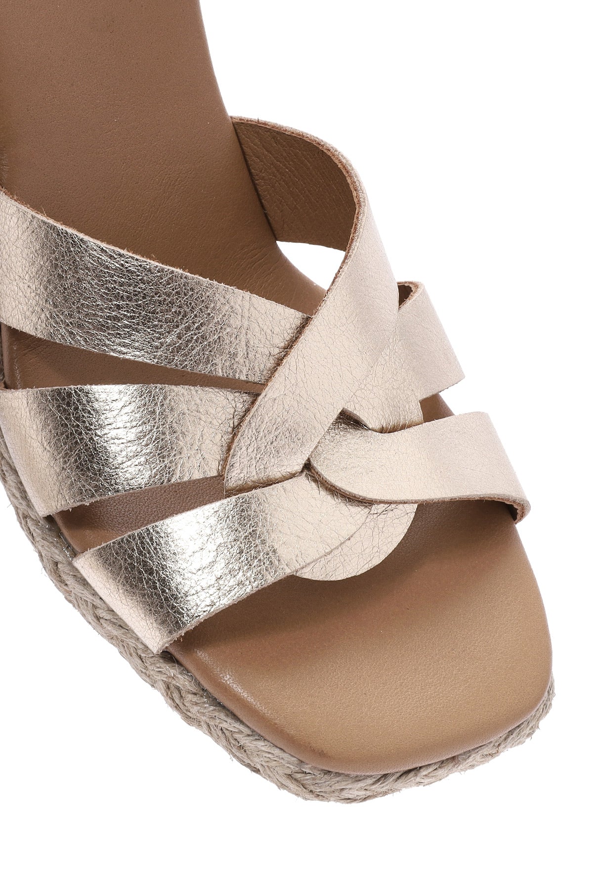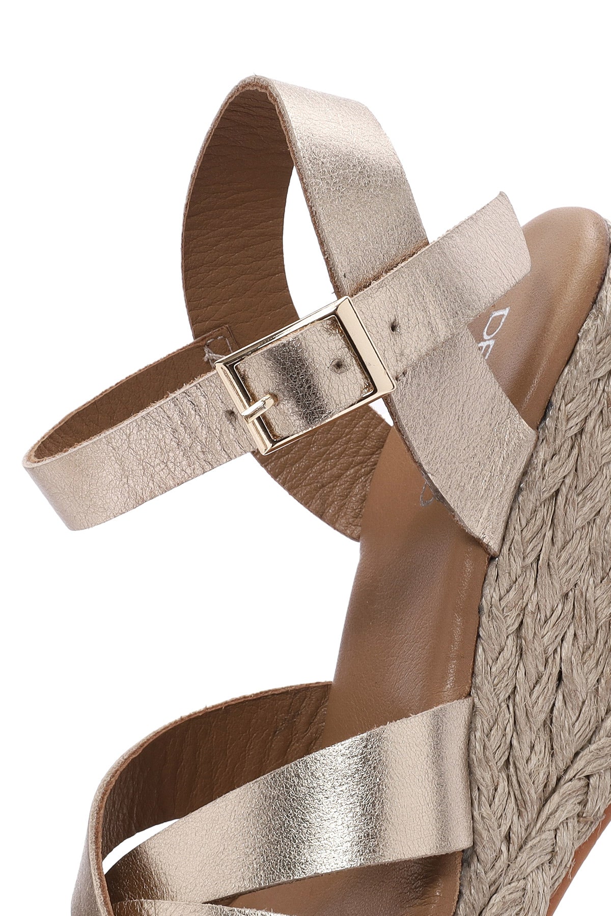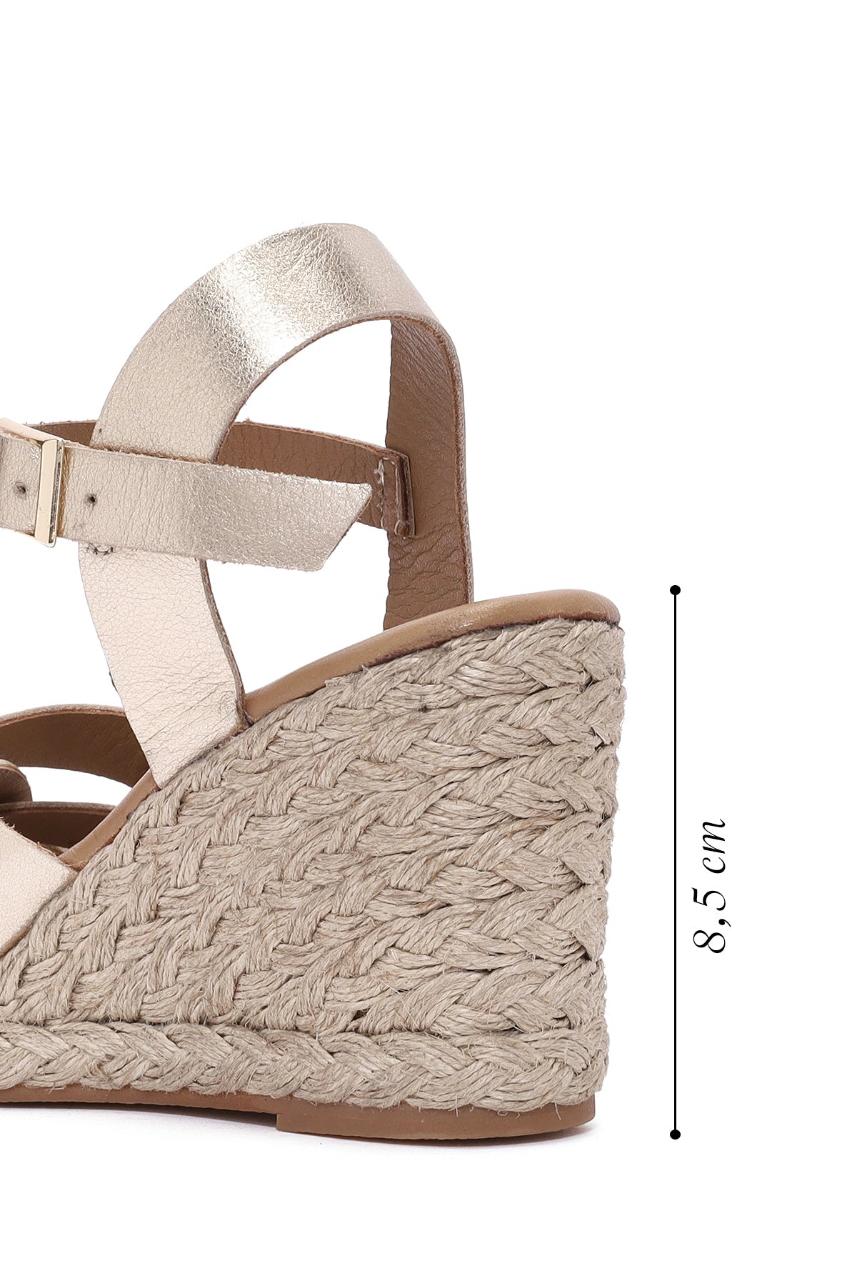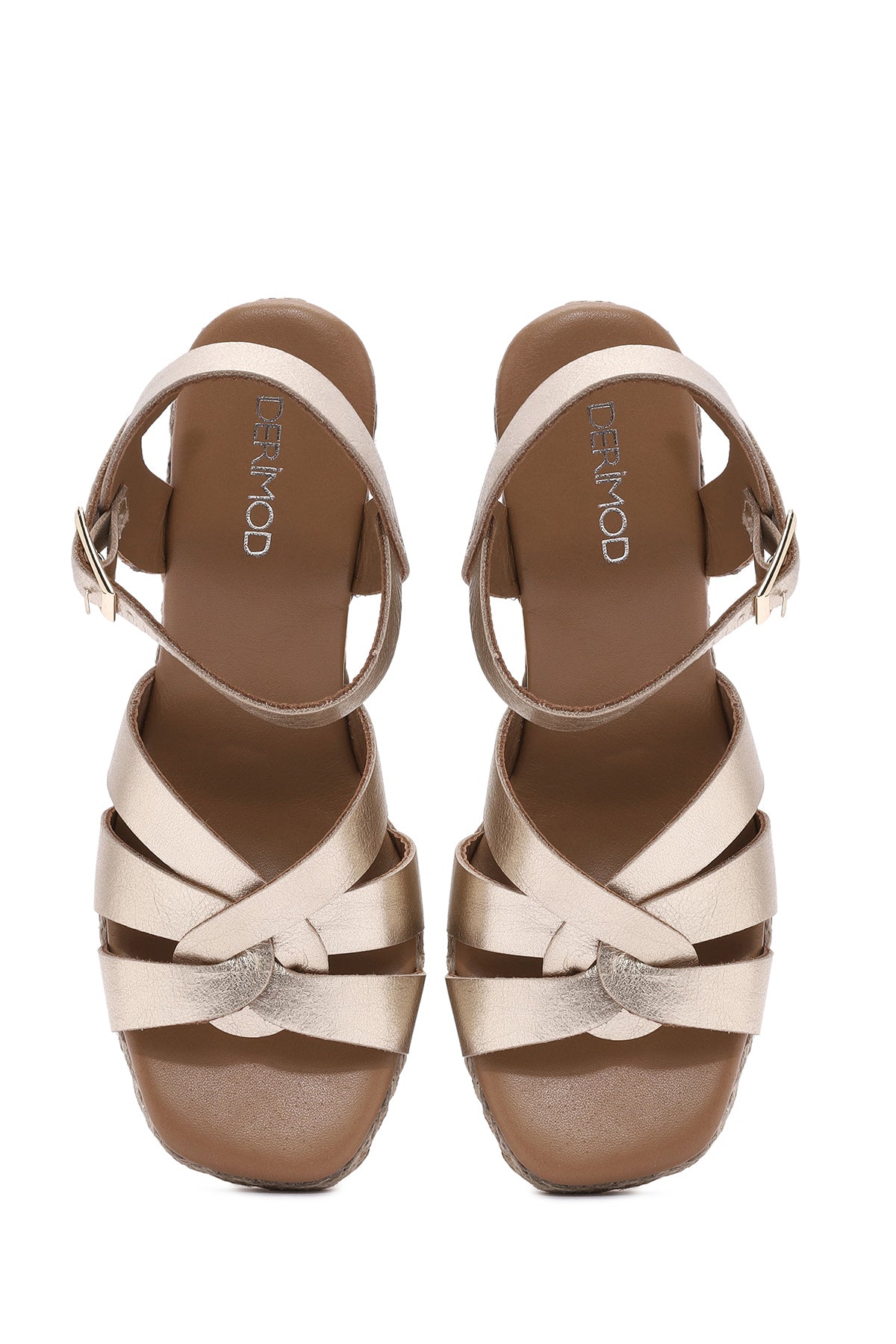 Kadın Altın Bilekten Tokalı Dolgu Topuklu Metalik Deri Espadril Sandalet