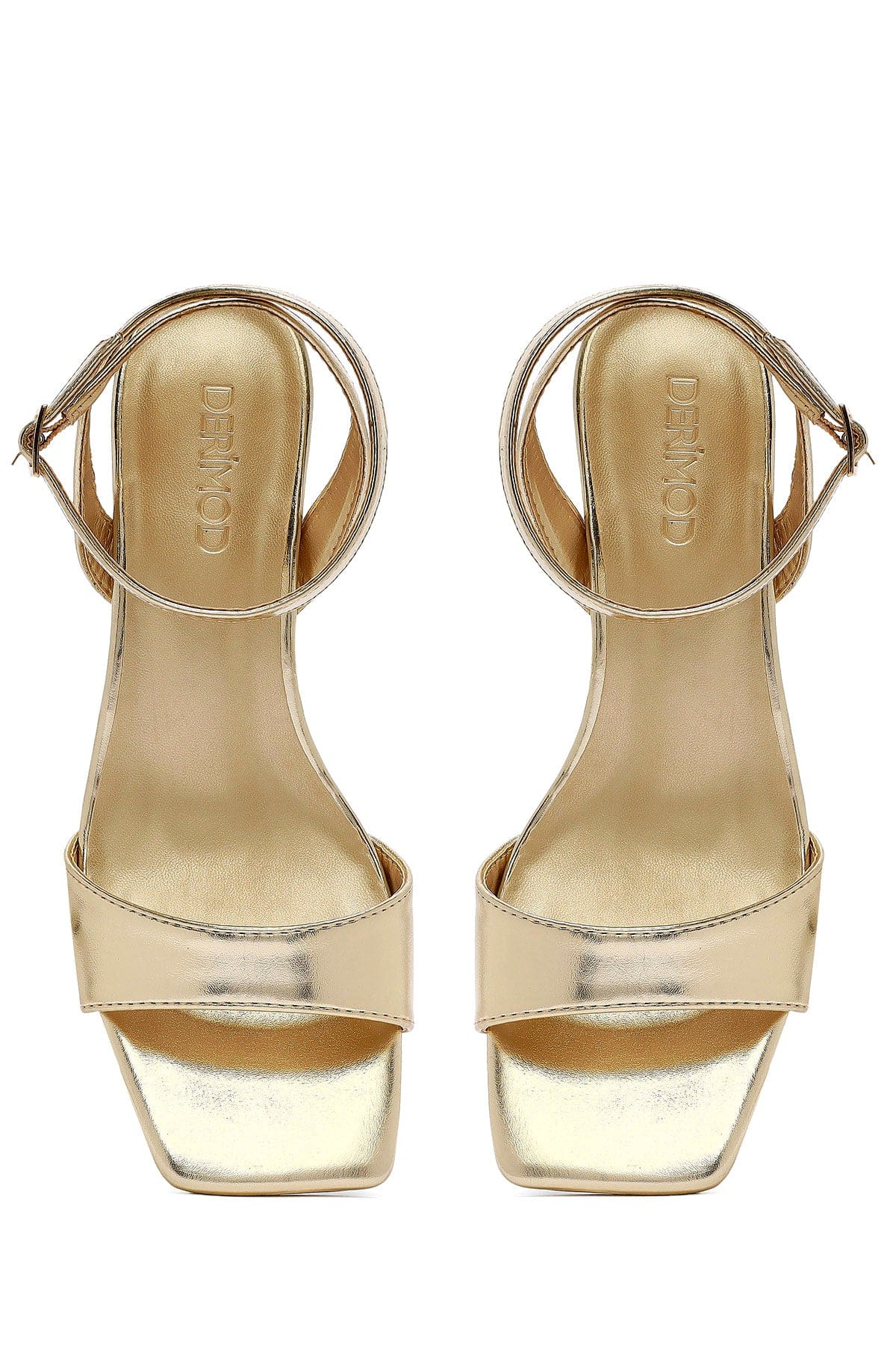 Kadın Altın Bilekten Tokalı Kalın Topuklu Metalik Sandalet
