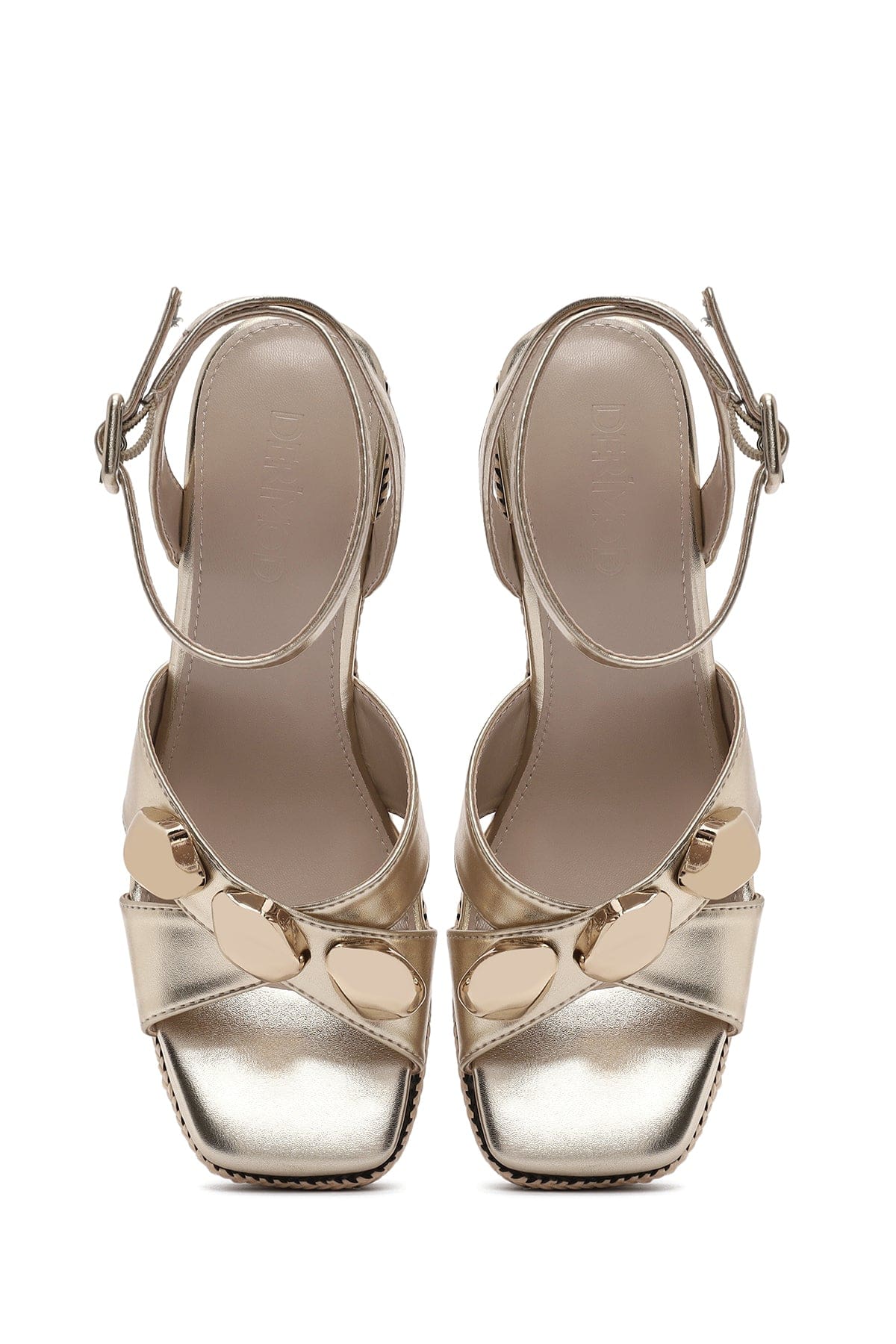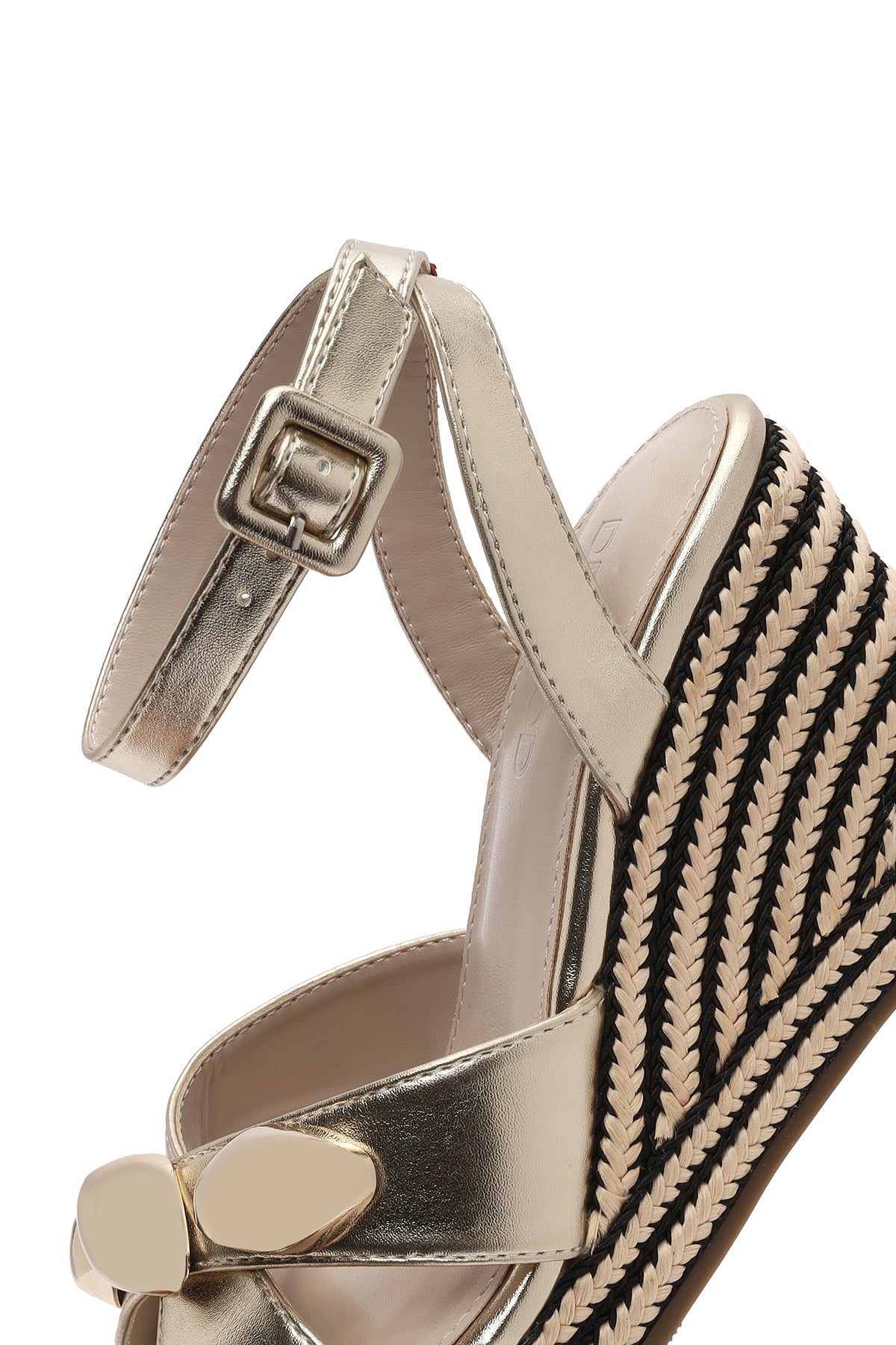 Kadın Altın Bilekten Tokalı Dolgu Topuklu Metalik Espadril Sandalet