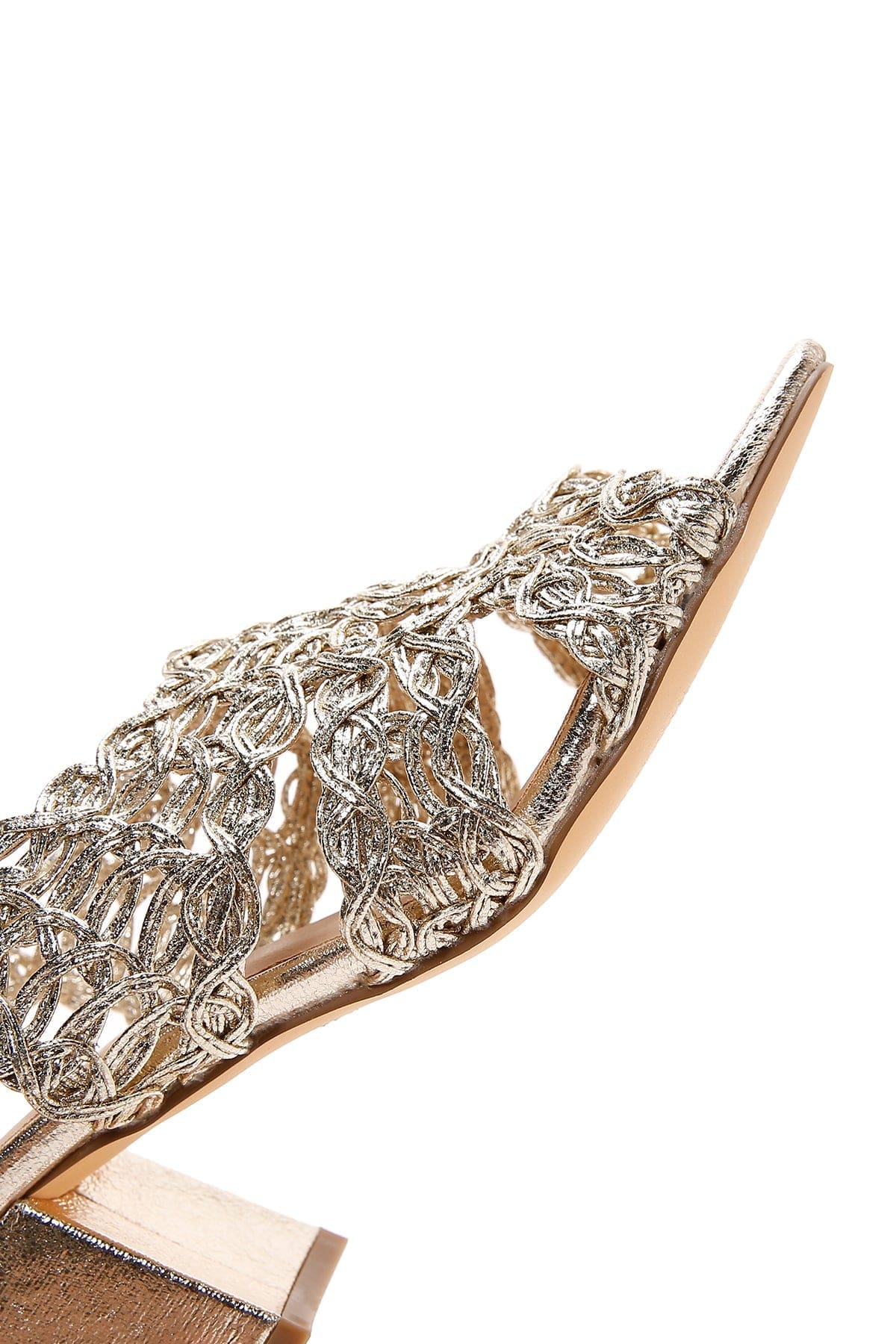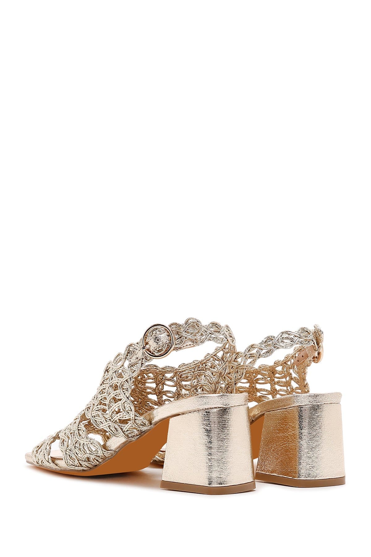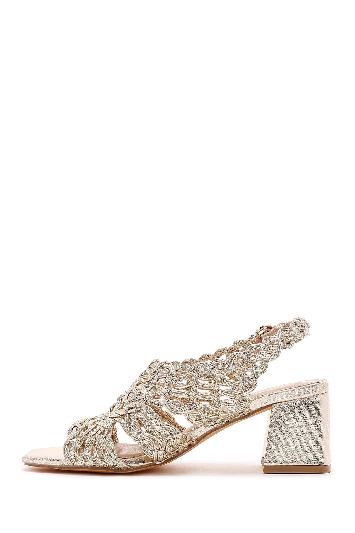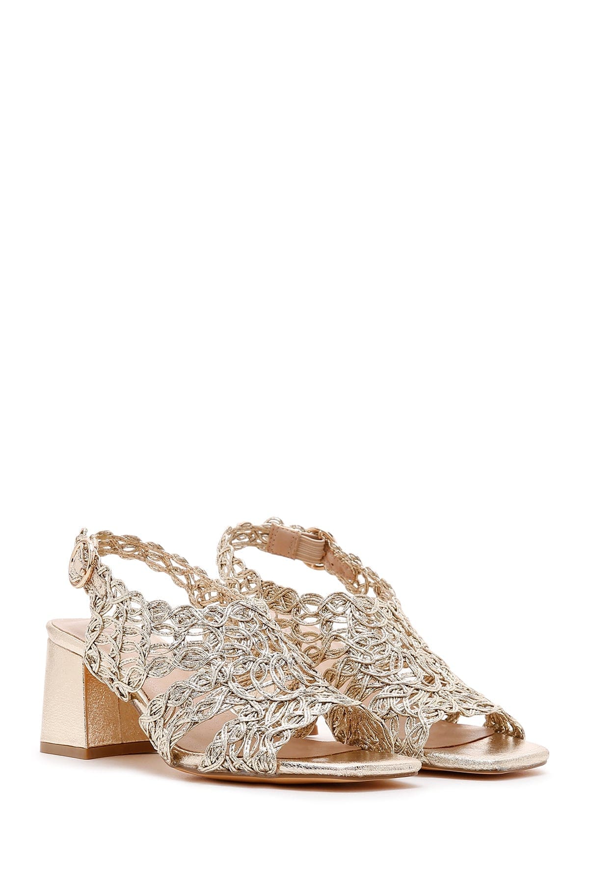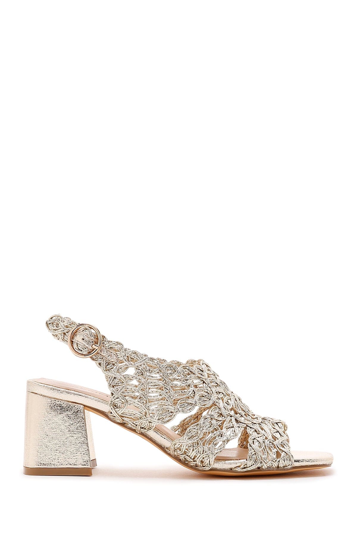 Kadın Altın Örgülü Metalik Kalın Kısa Topuklu Sandalet