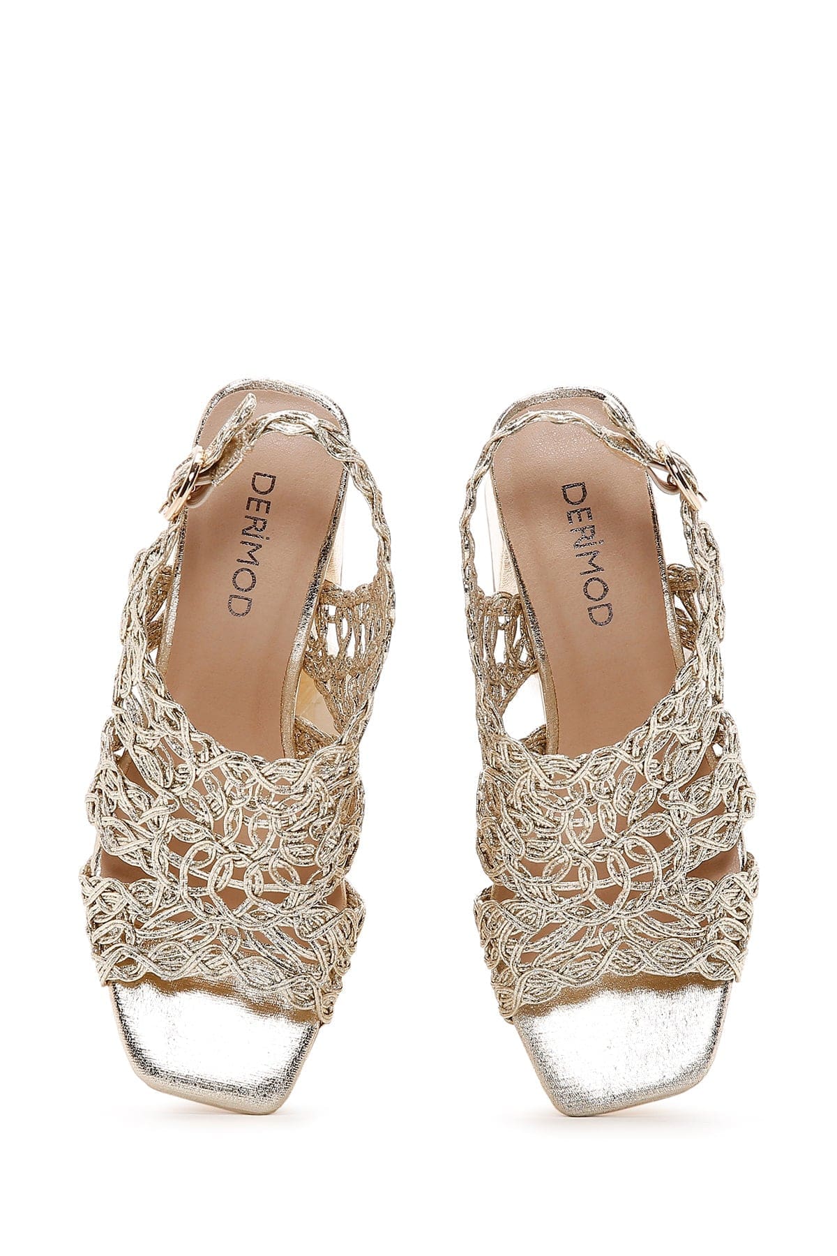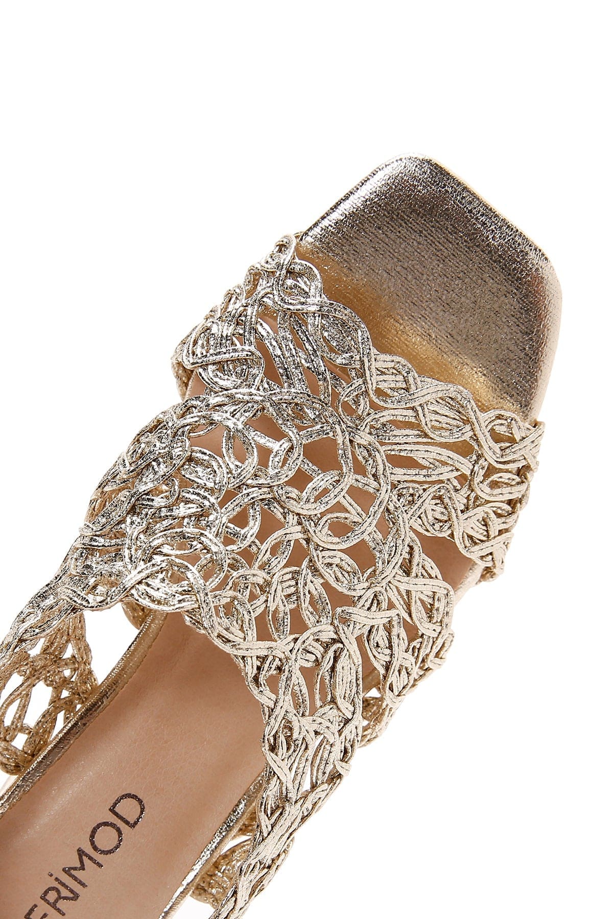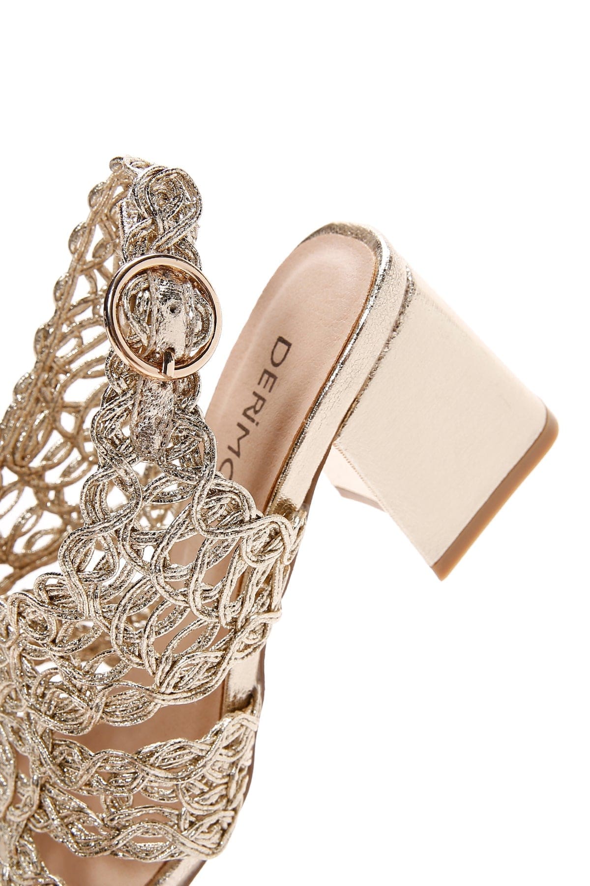 صندل زنانه طلایی بافتدار متالیک پاشنه کوتاه ضخیم دری مد