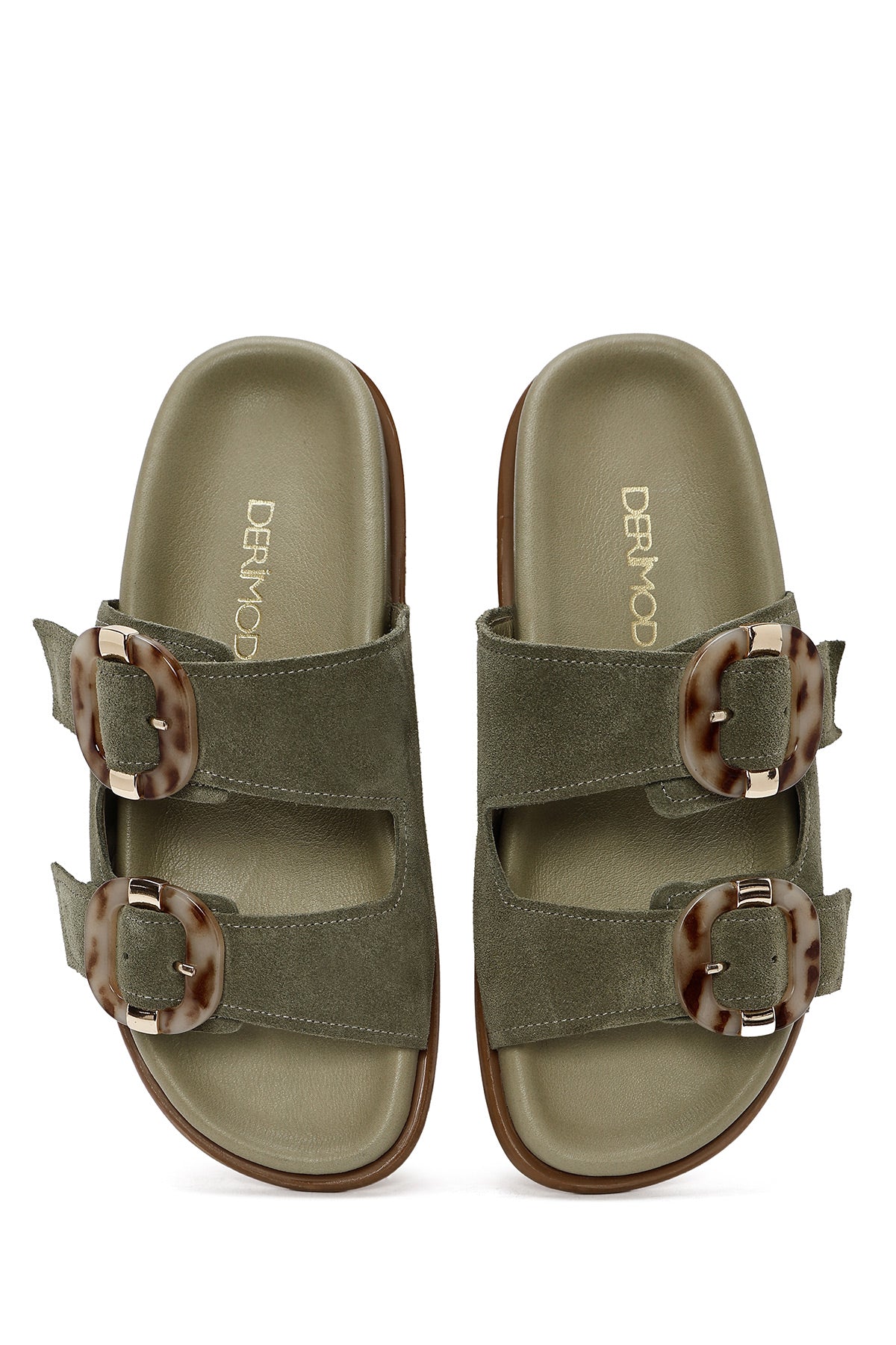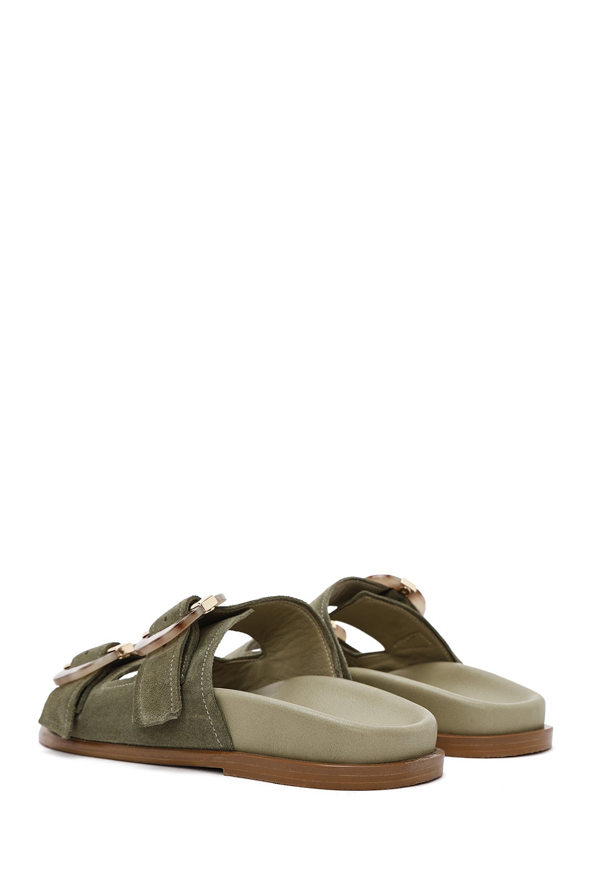 Kadın Yeşil Çift Tokalı Süet Deri Terlik