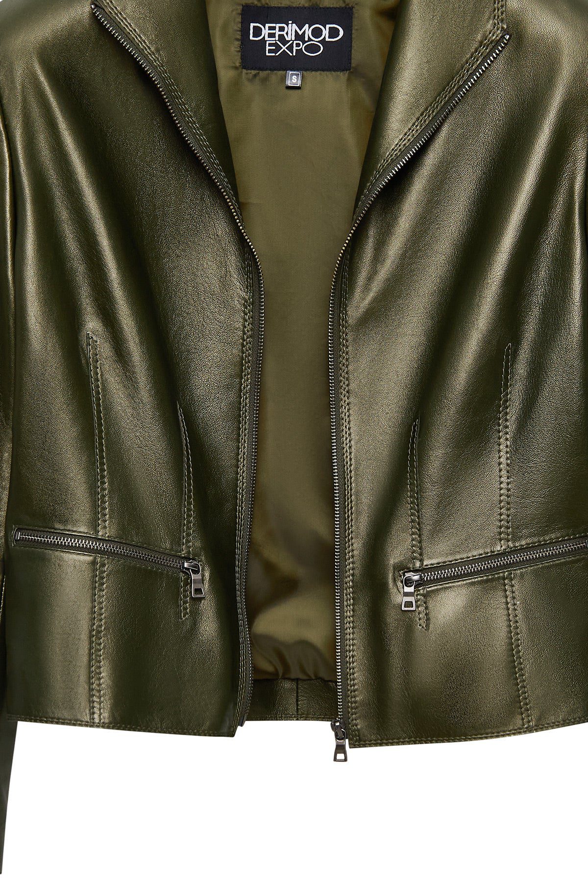 Amy Kadın Yeşil Devrik Yaka Deri Ceket