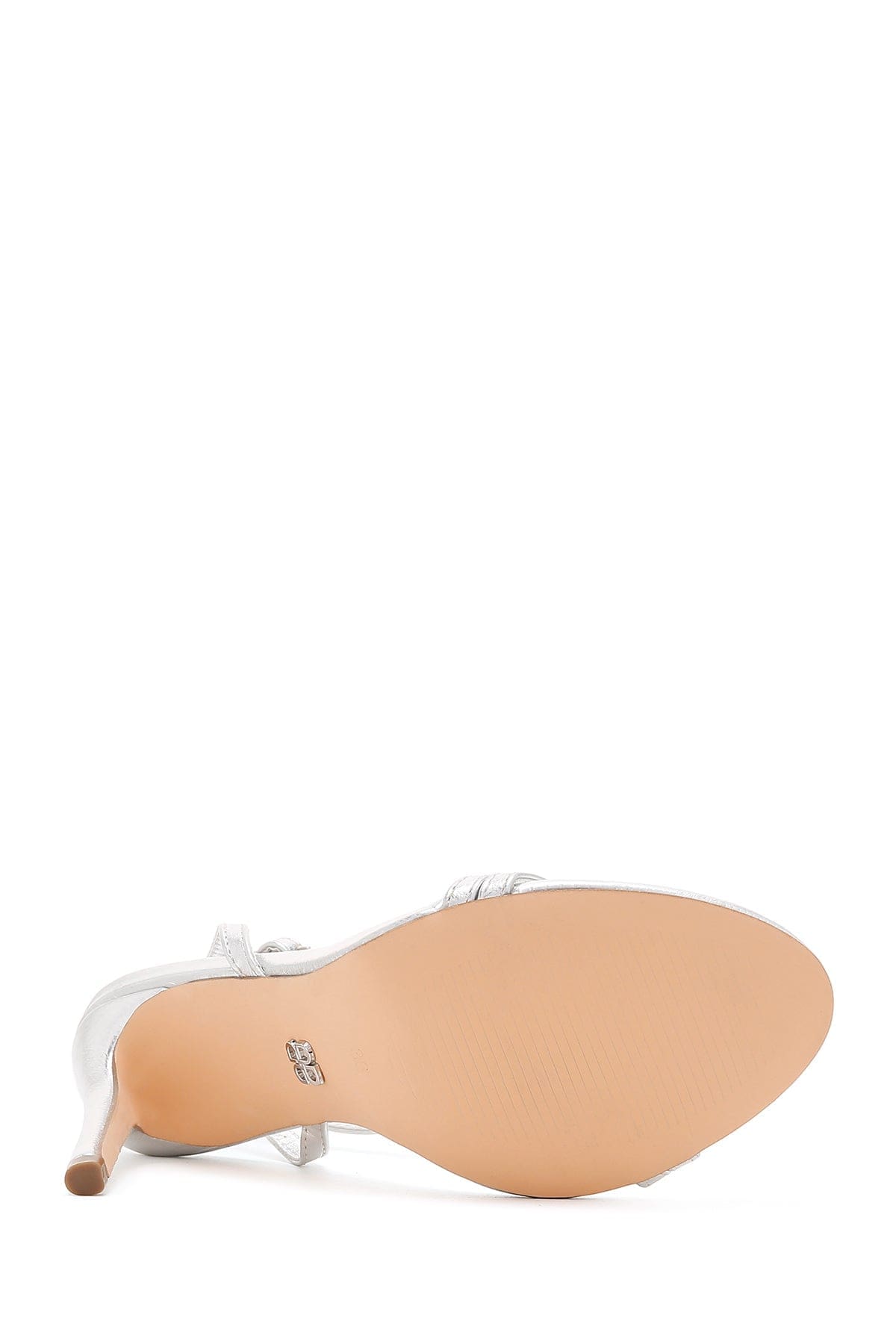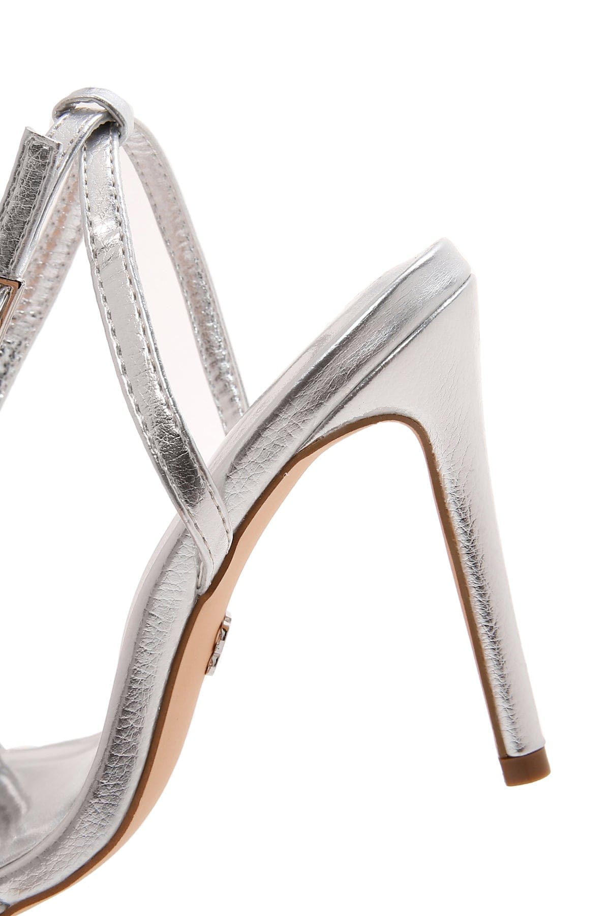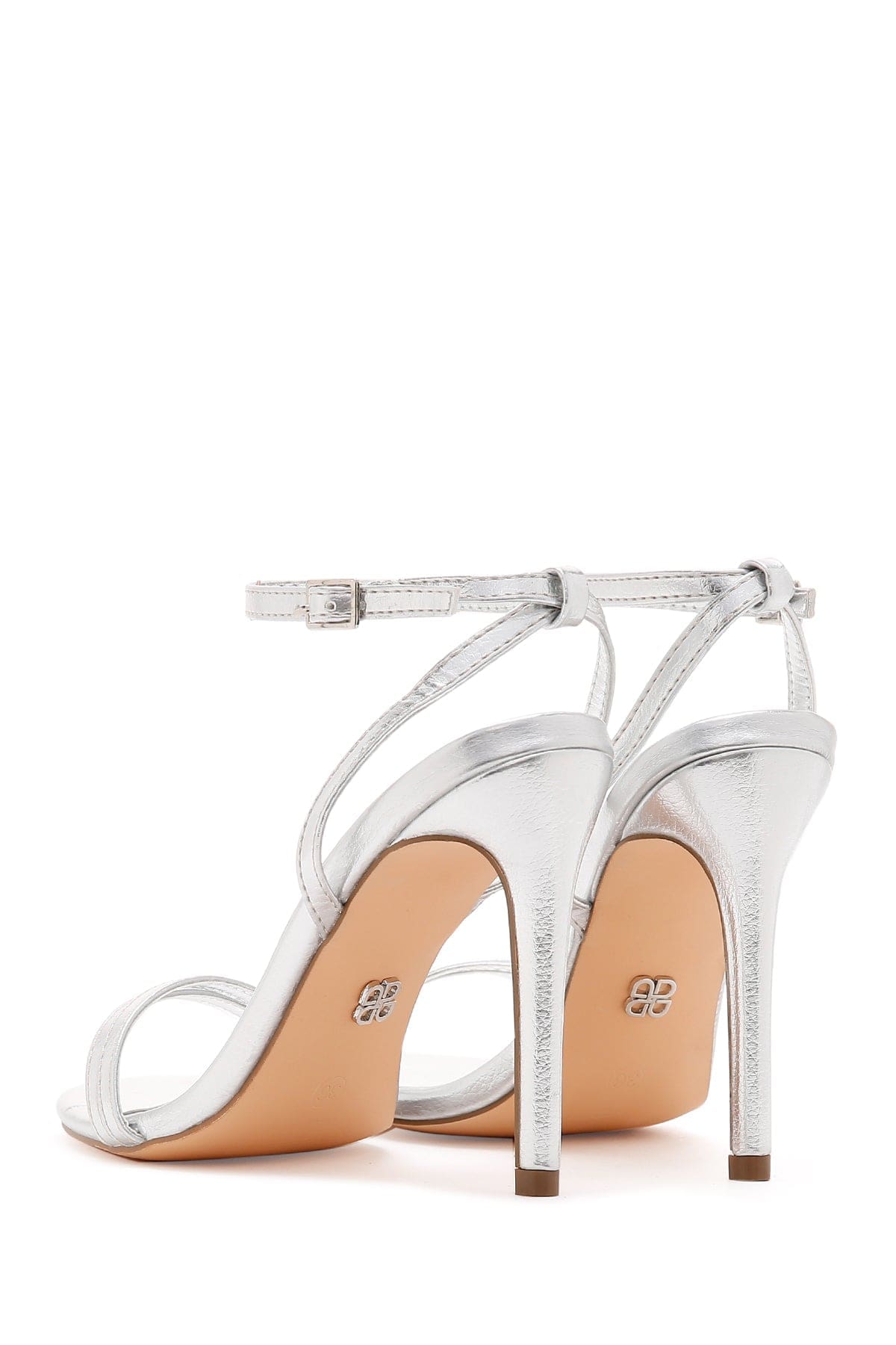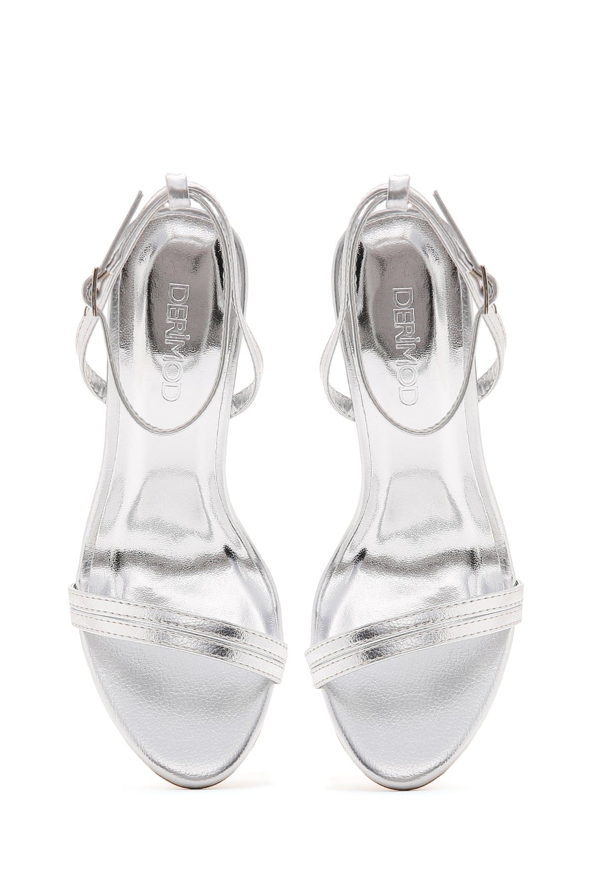 Kadın Gri Bilekten Bantlı Metalik Yüksek İnce Topuklu Sandalet