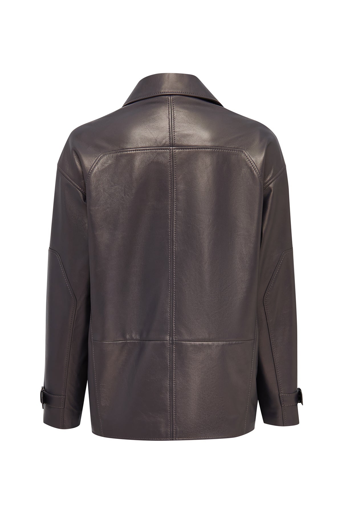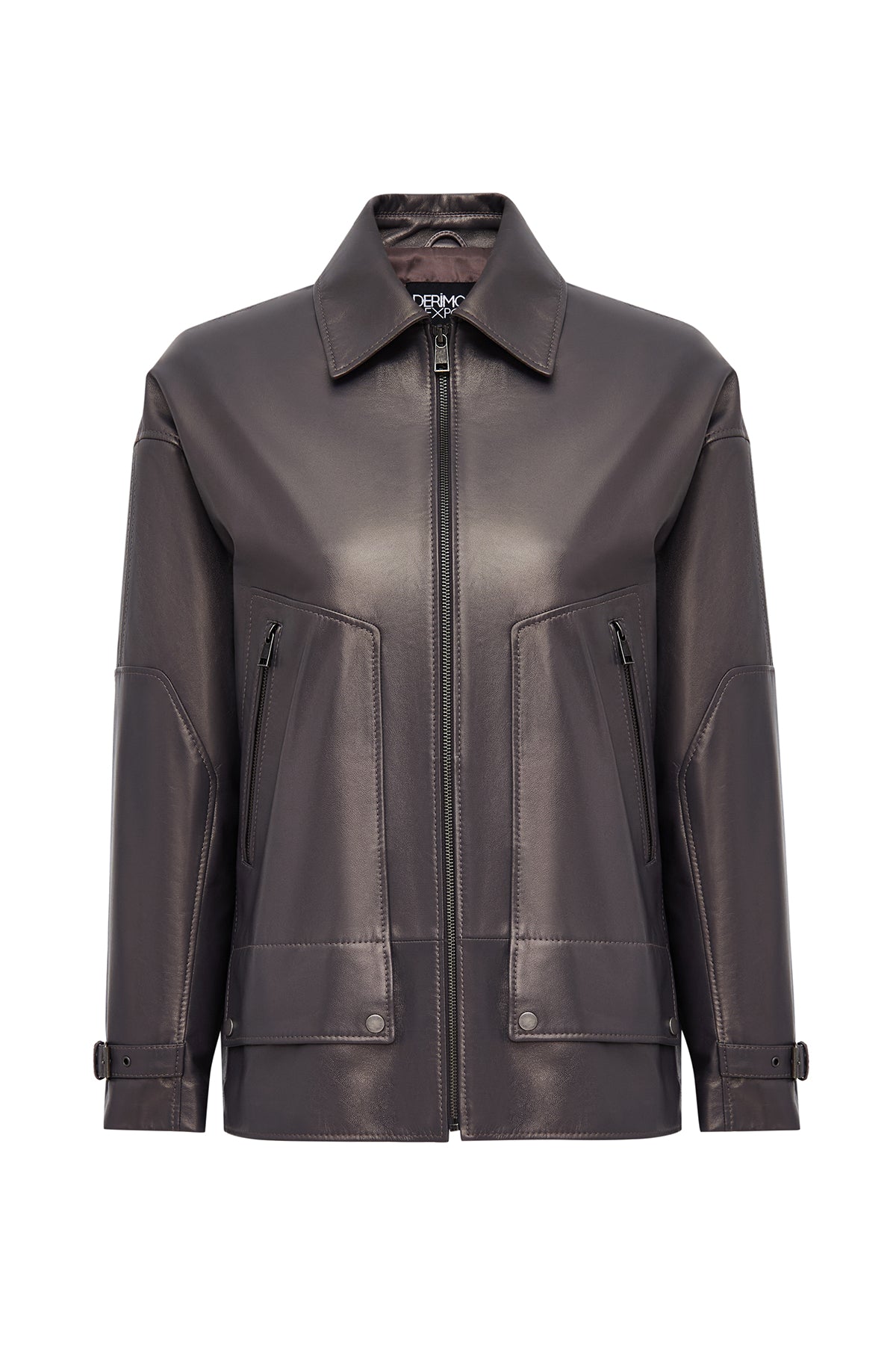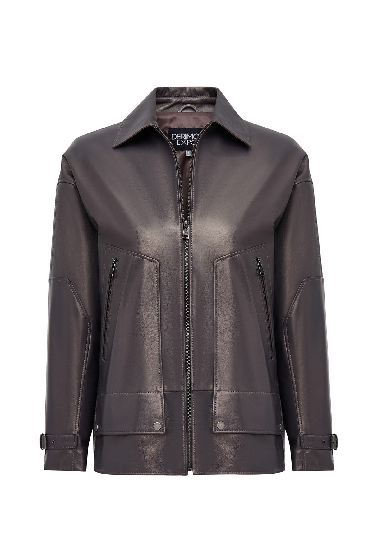 Rosalin Kadın Gri Gömlek Yaka Oversize Deri Mont