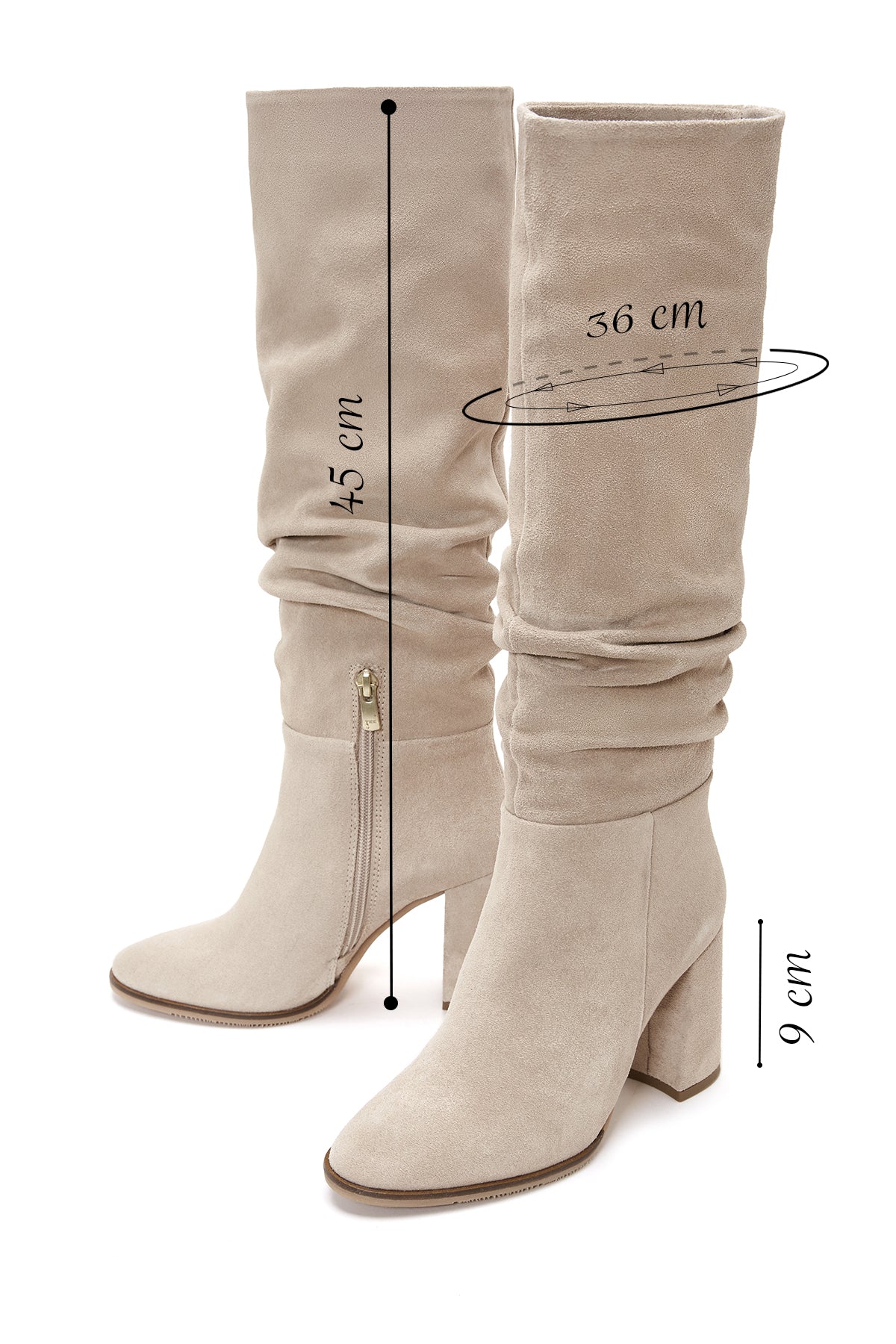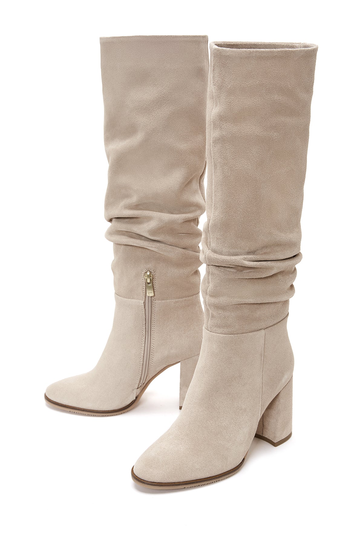 Kadın Bej Fermuarlı Kalın Topuklu Süet Deri Çizme