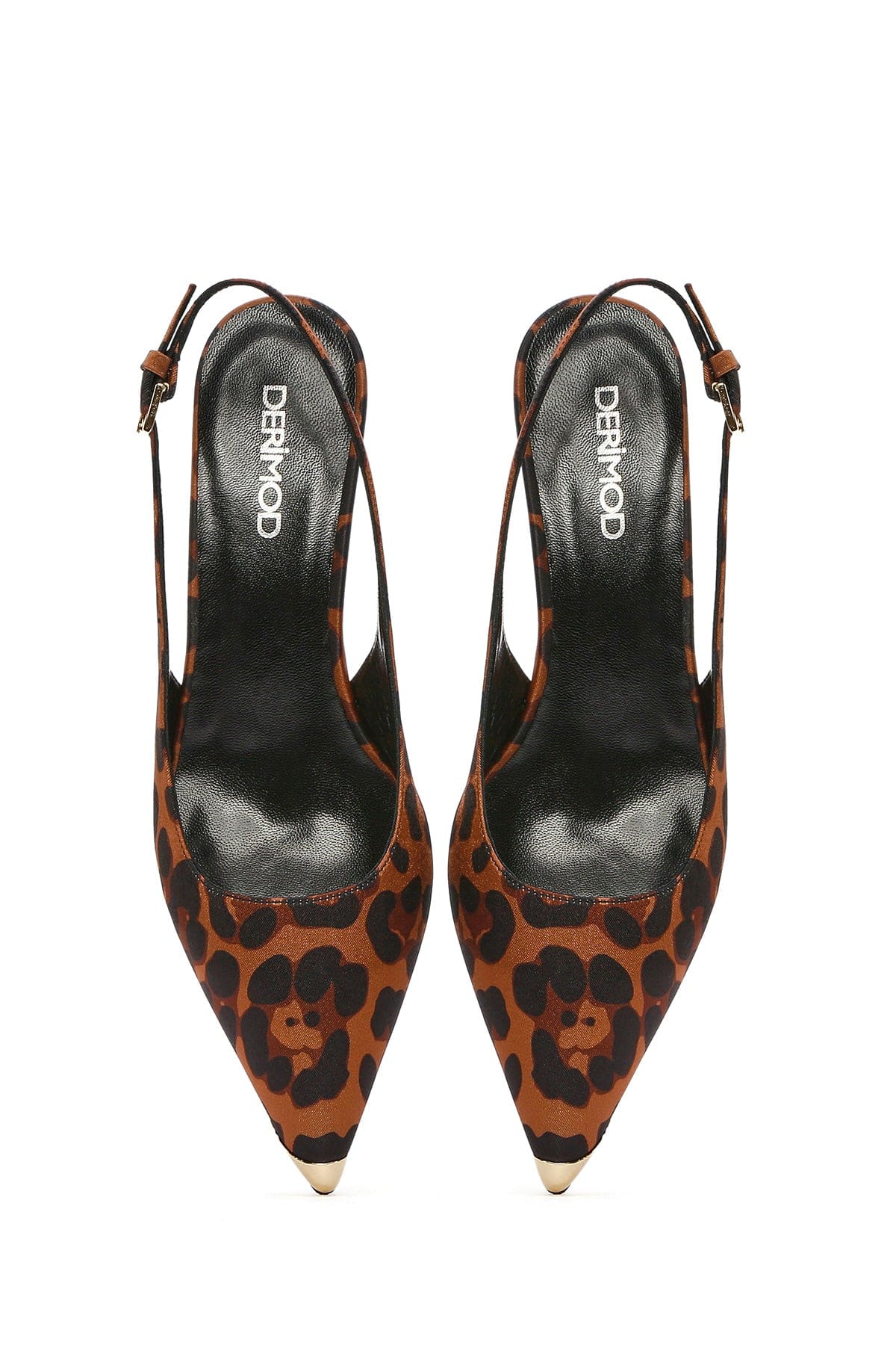 Kadın Leopar Desenli Arkası Açık Saten Kısa İnce Topuklu Deri Ayakkabı