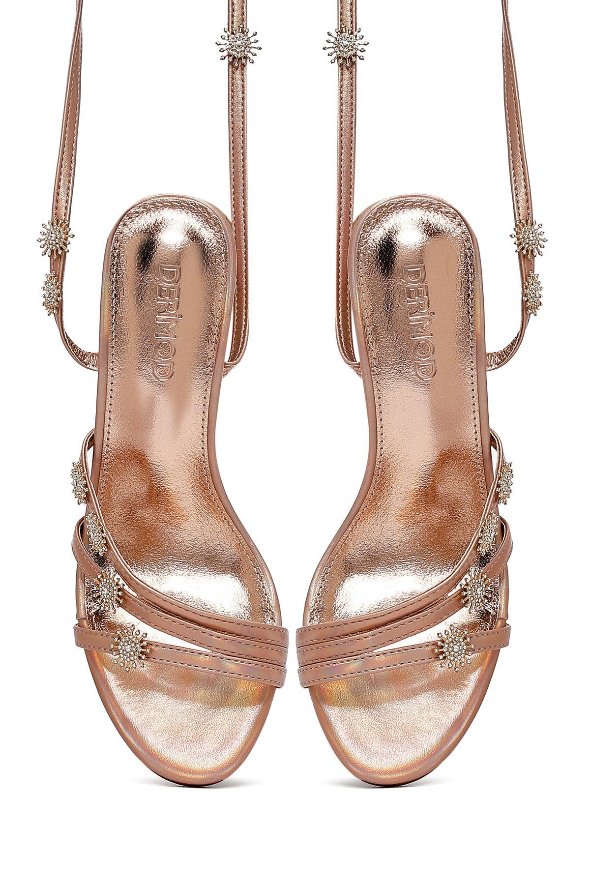 صندل زنانه صورتی متالیک نگیندار پاشنهنازک بنددار دری مد