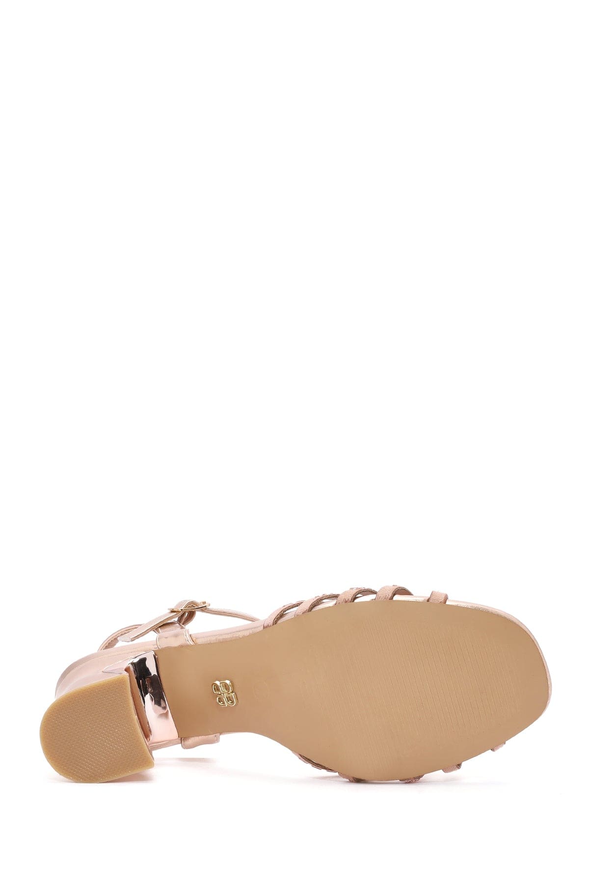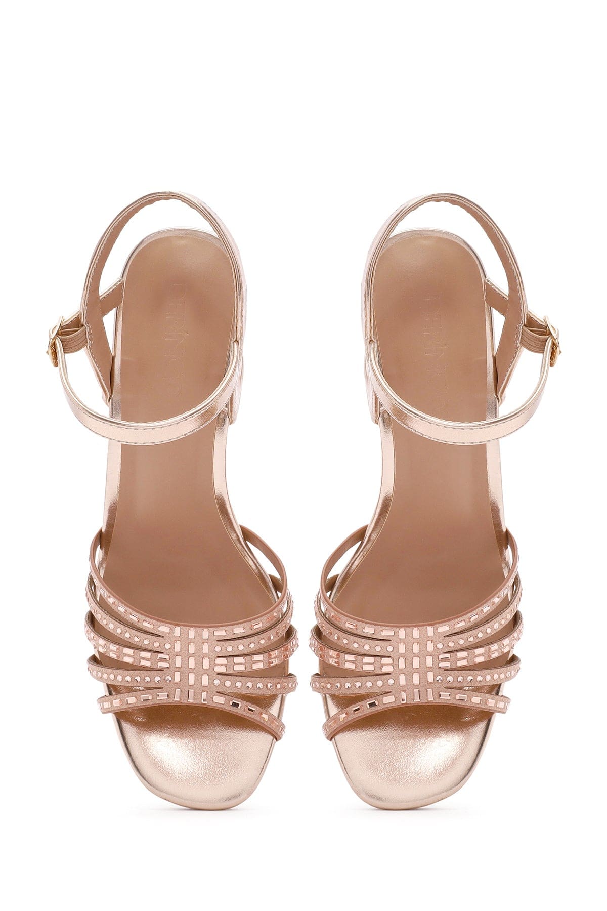 Kadın Pembe Bilekten Bağlamalı Metalik Kalın Topuklu Sandalet