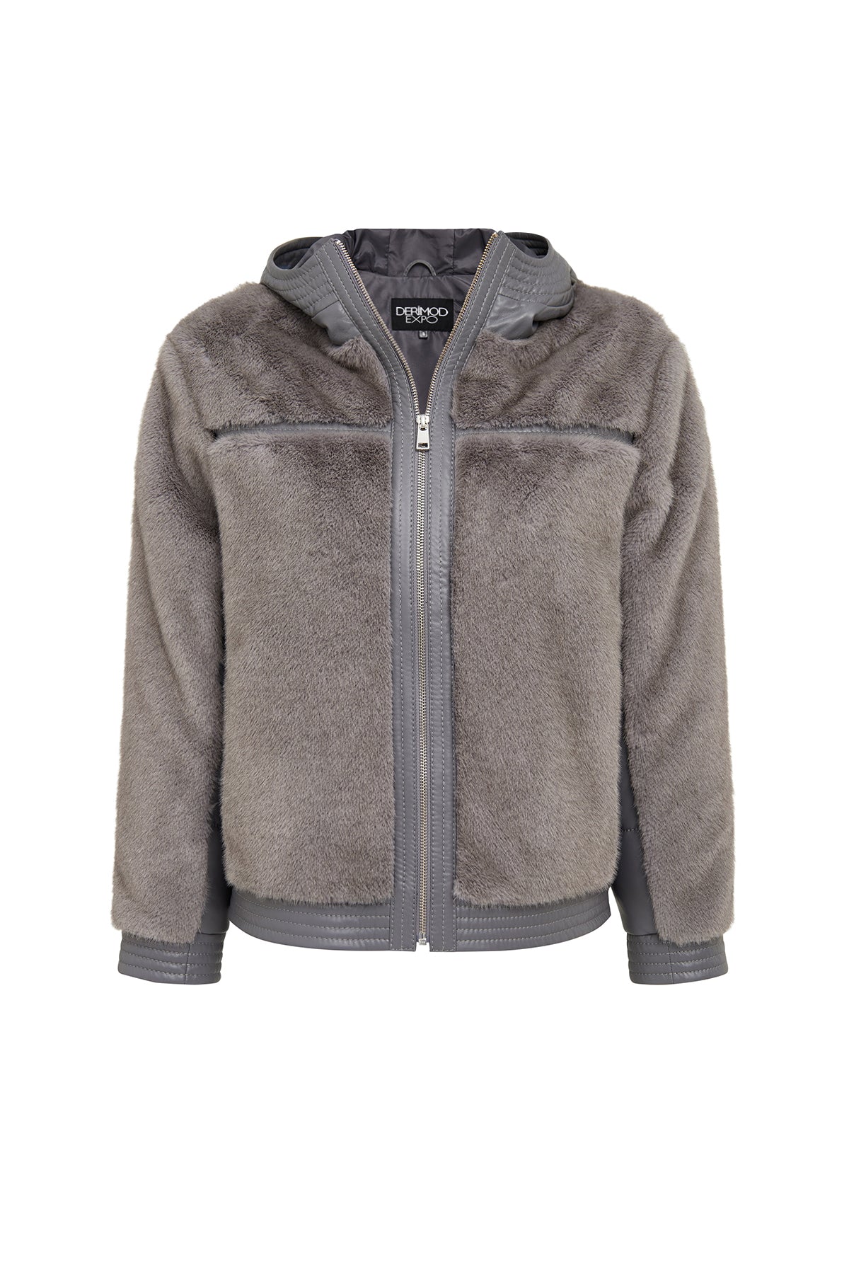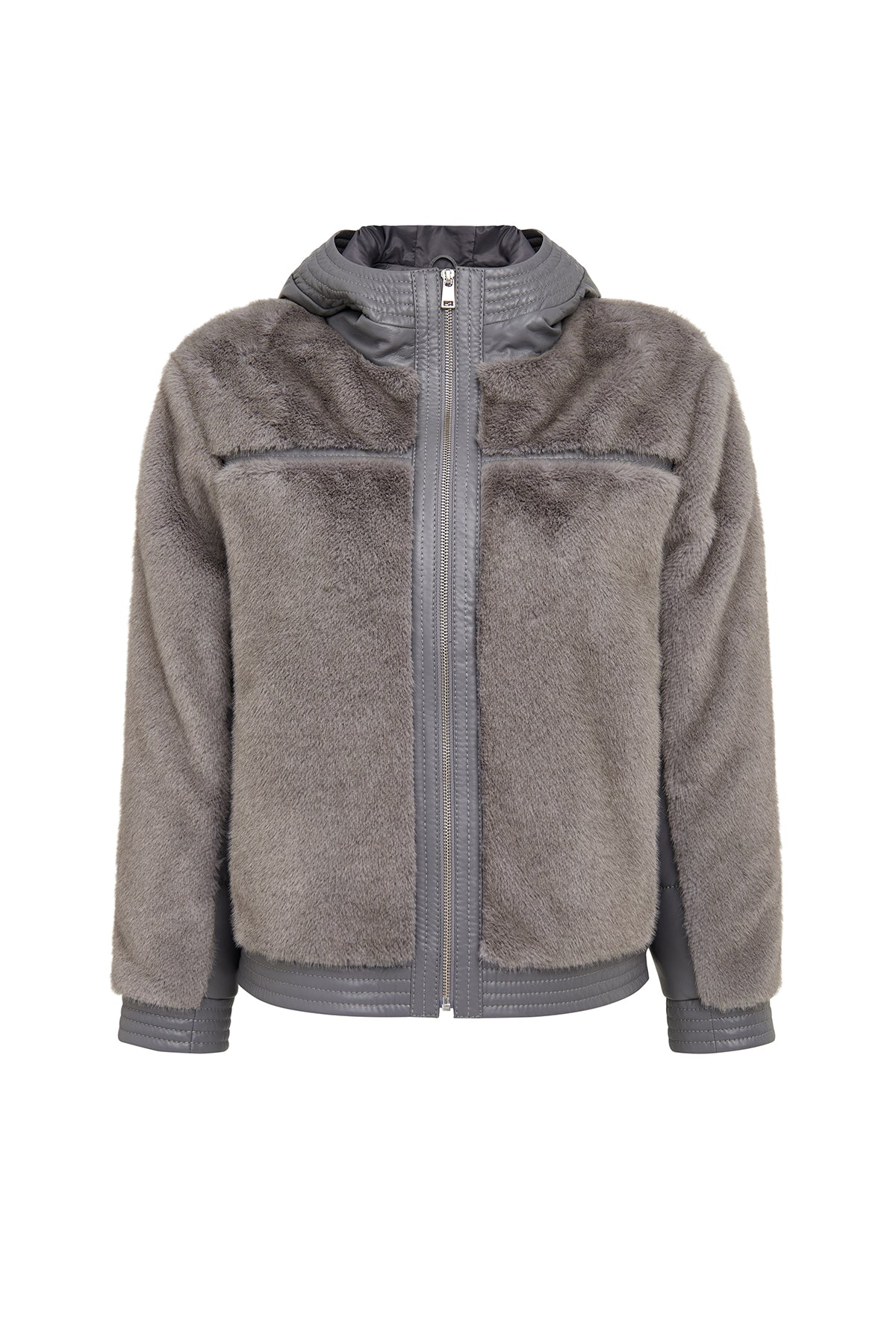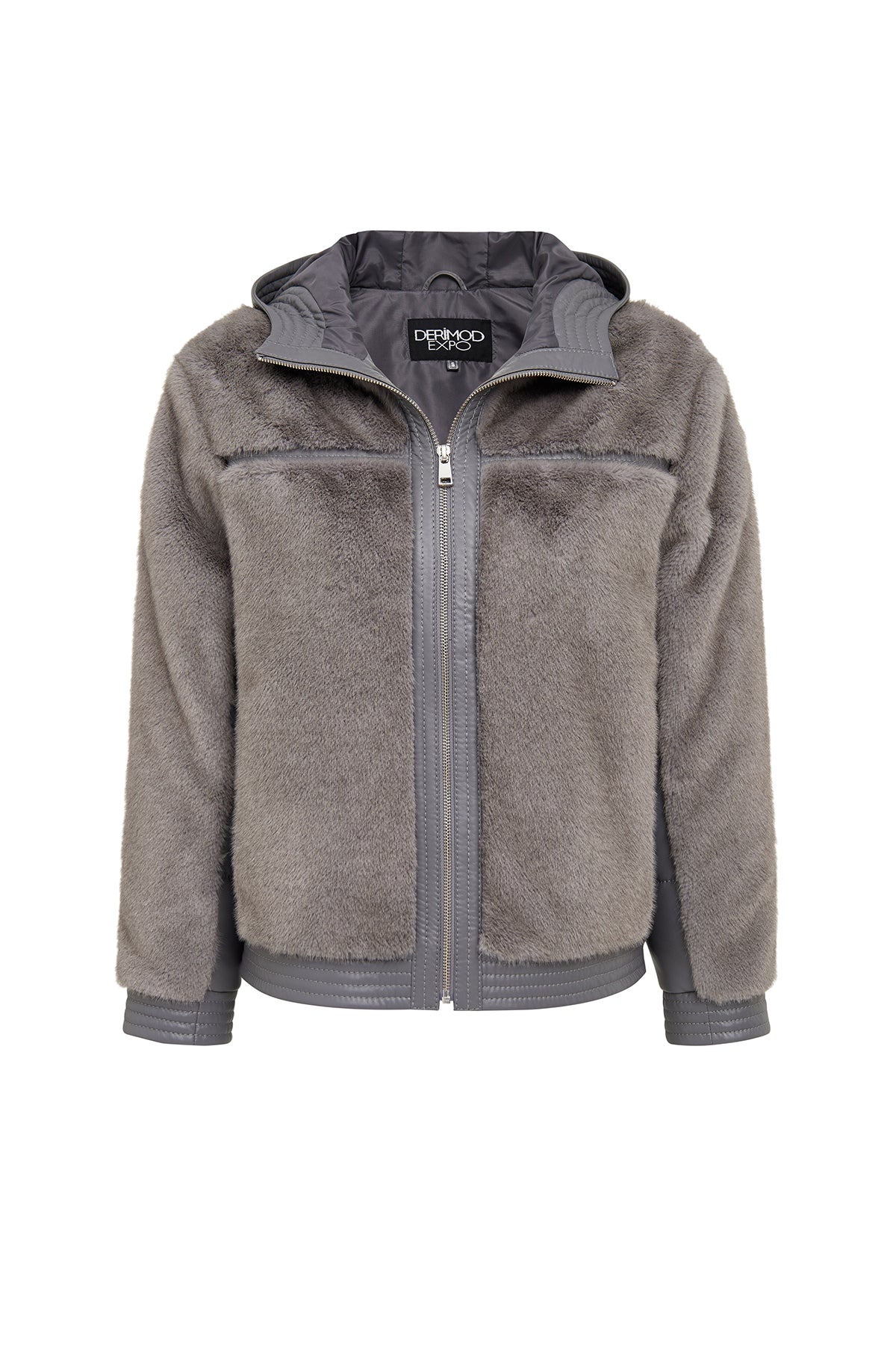 کاپشن زنانه Prag چرم تدی طوسی کلاهدار دری مد