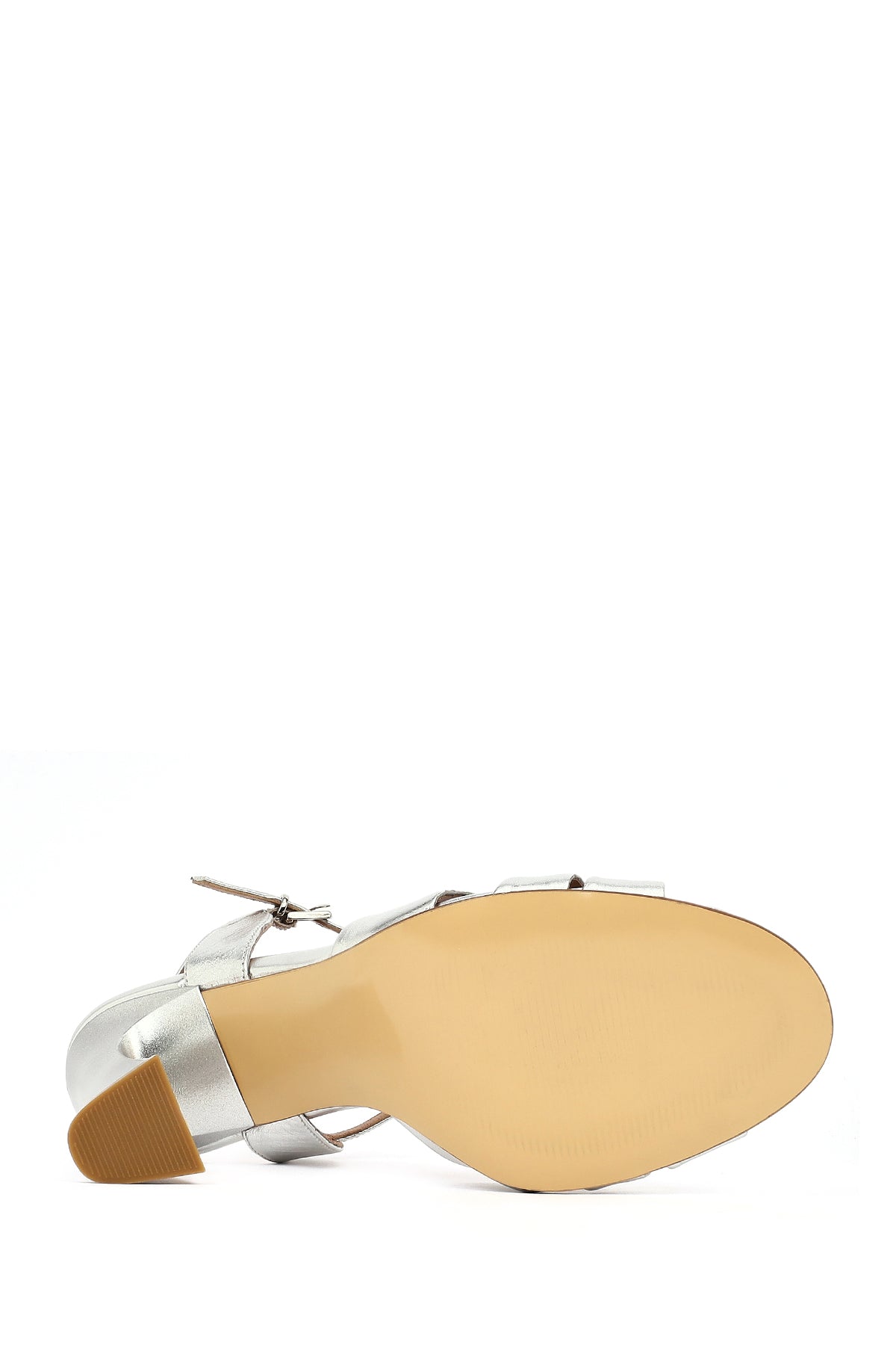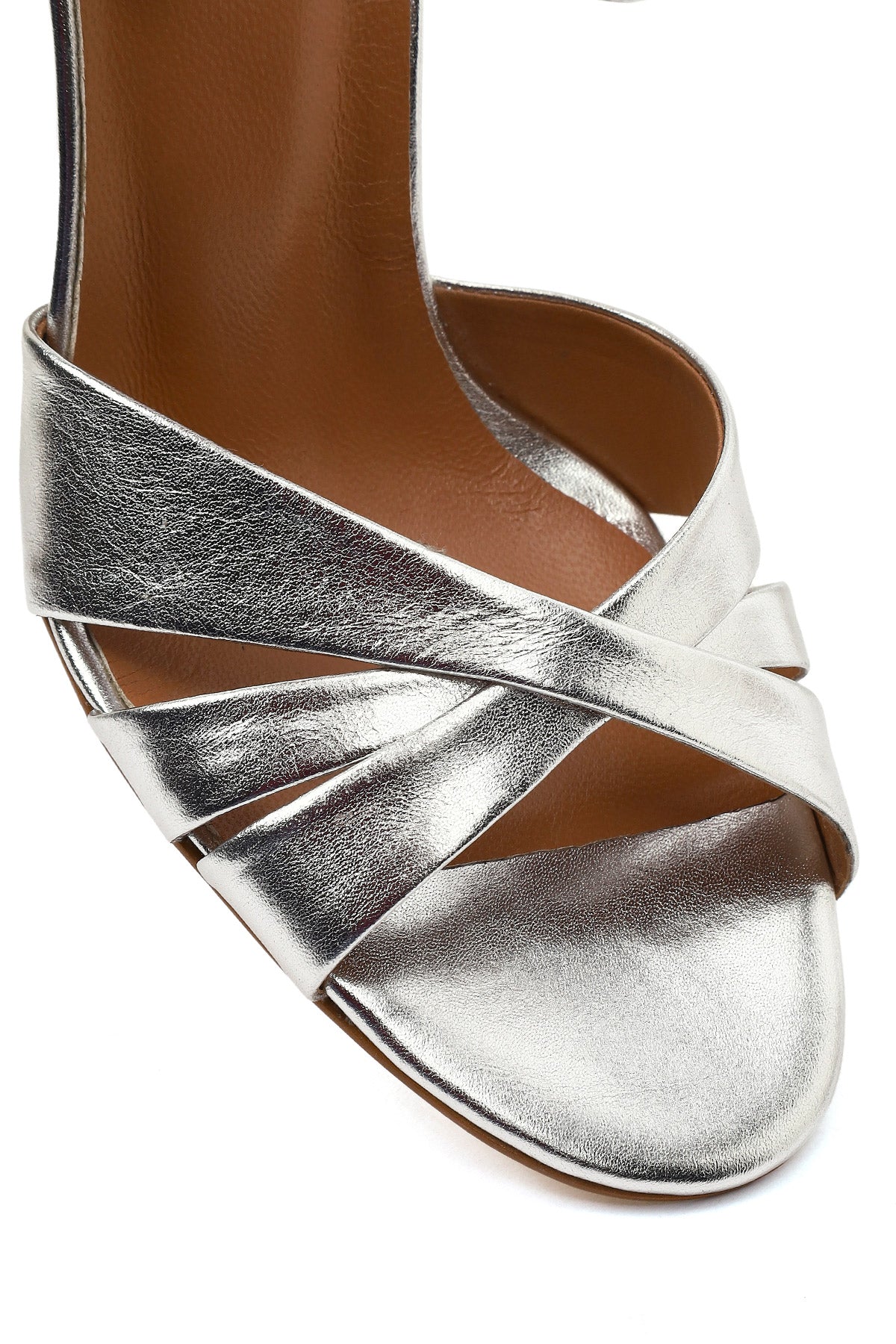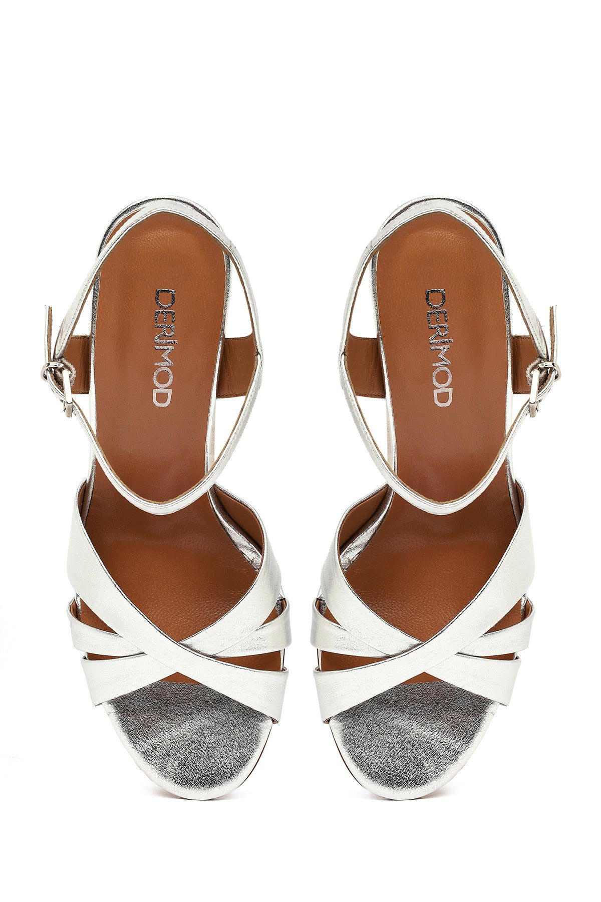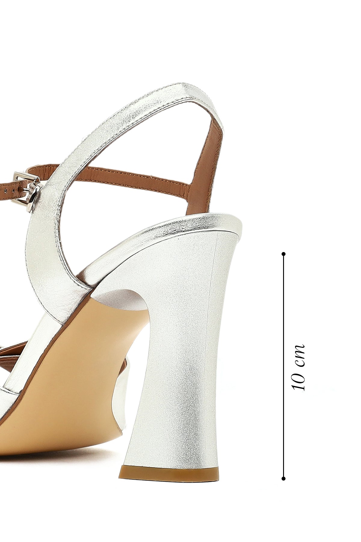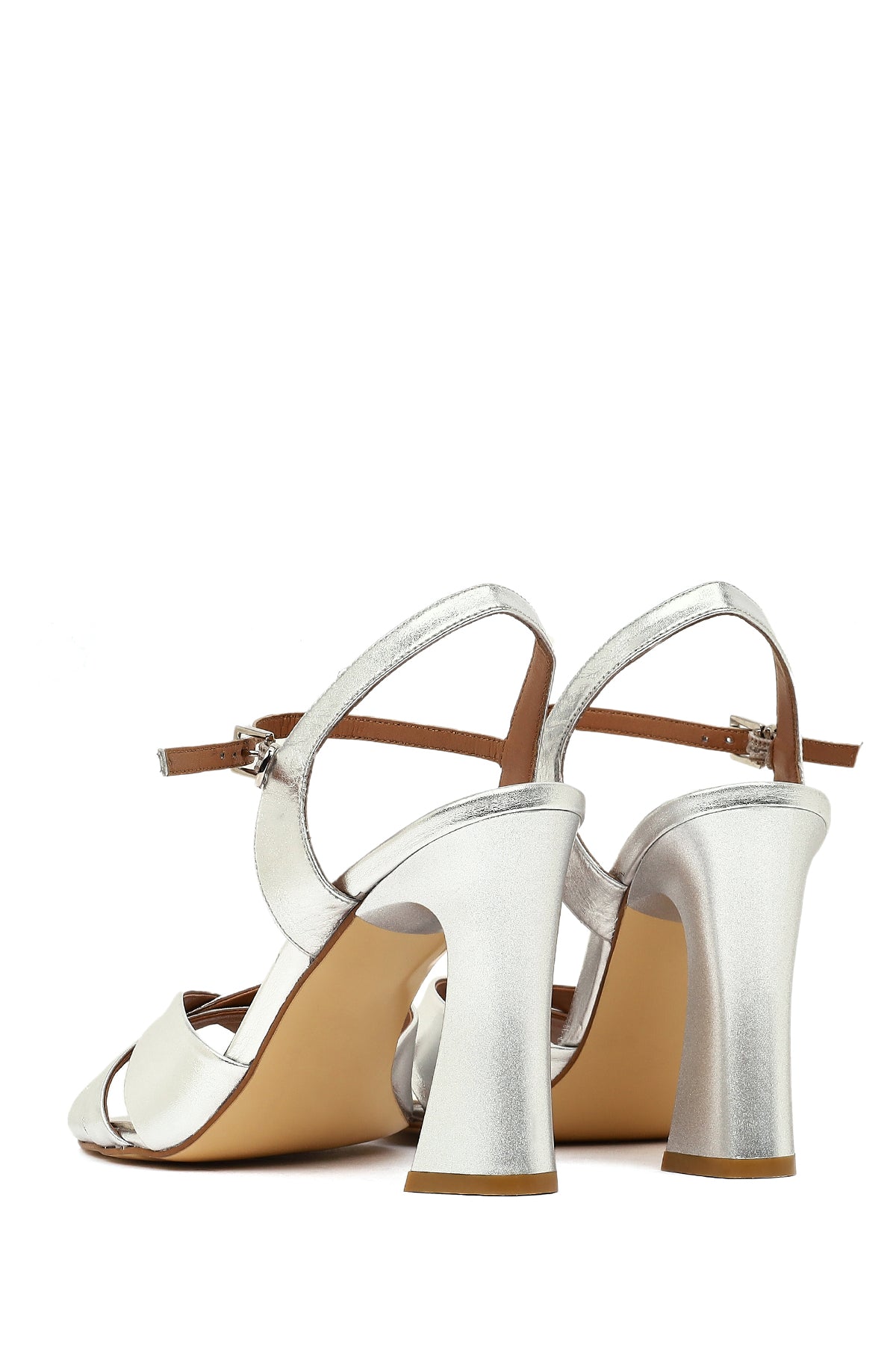 صندل زنانه چرم متالیک نقرهای بنددار مچ پا پاشنهبلند ضخیم دری مد