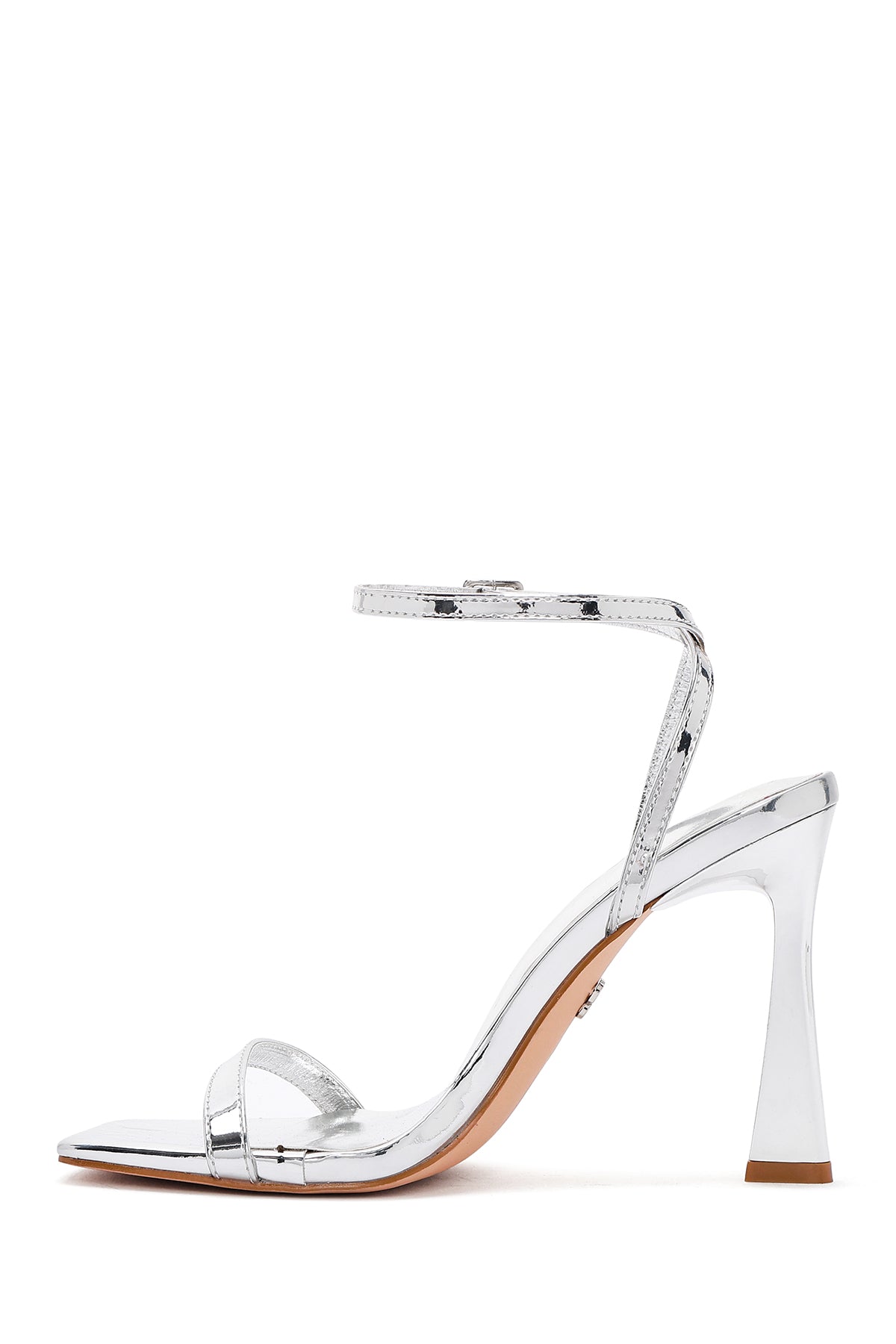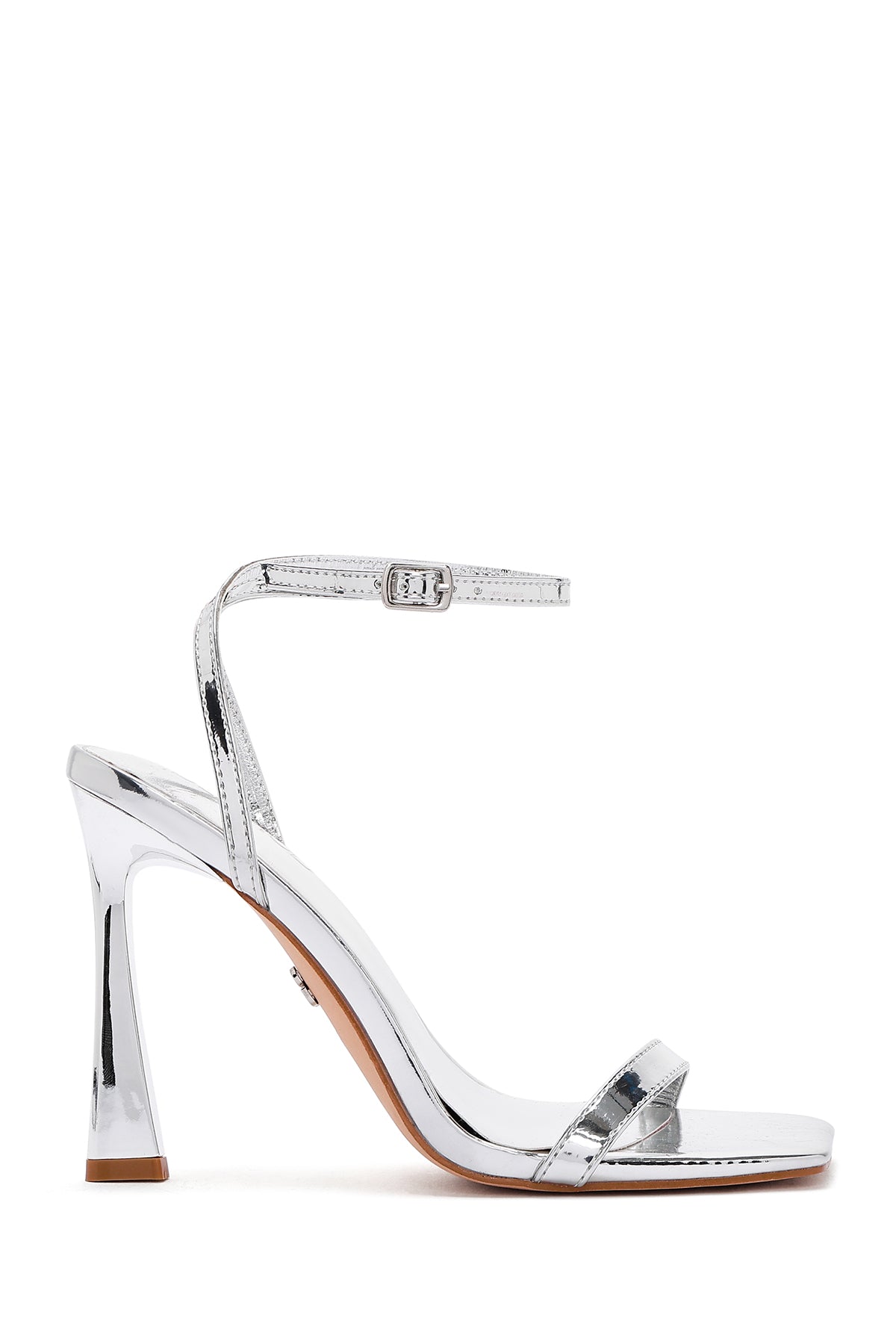 Kadın Gümüş Bilekten Bağlamalı Yüksek İnce Topuklu Metalik Sandalet