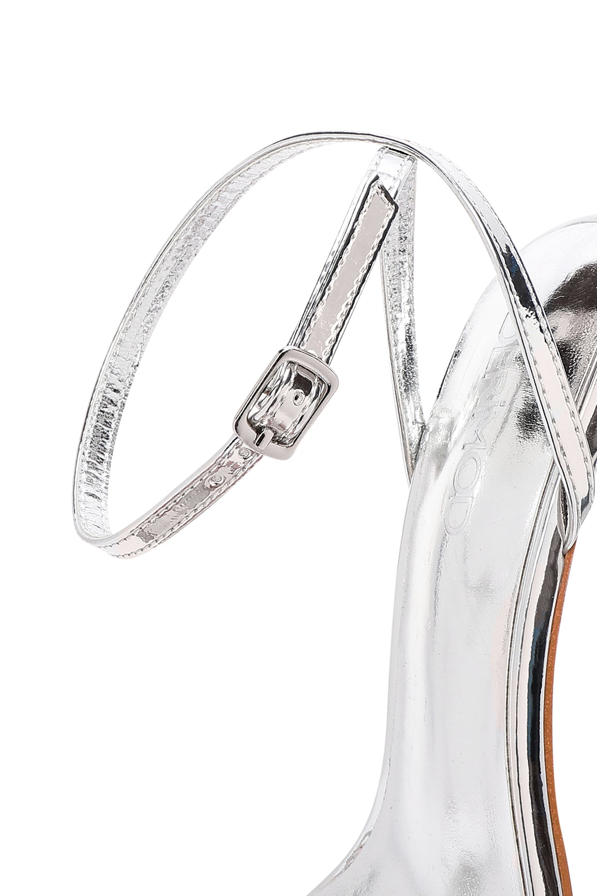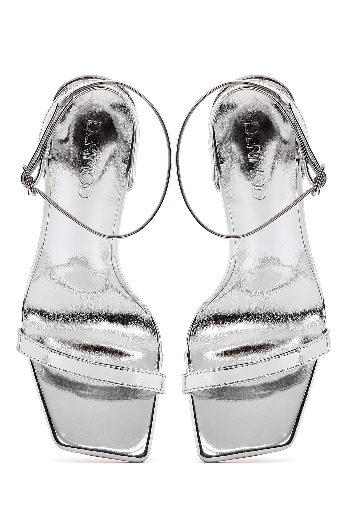 صندل زنانه نقرهای متالیک پاشنه نازک بلند بنددار دری مد