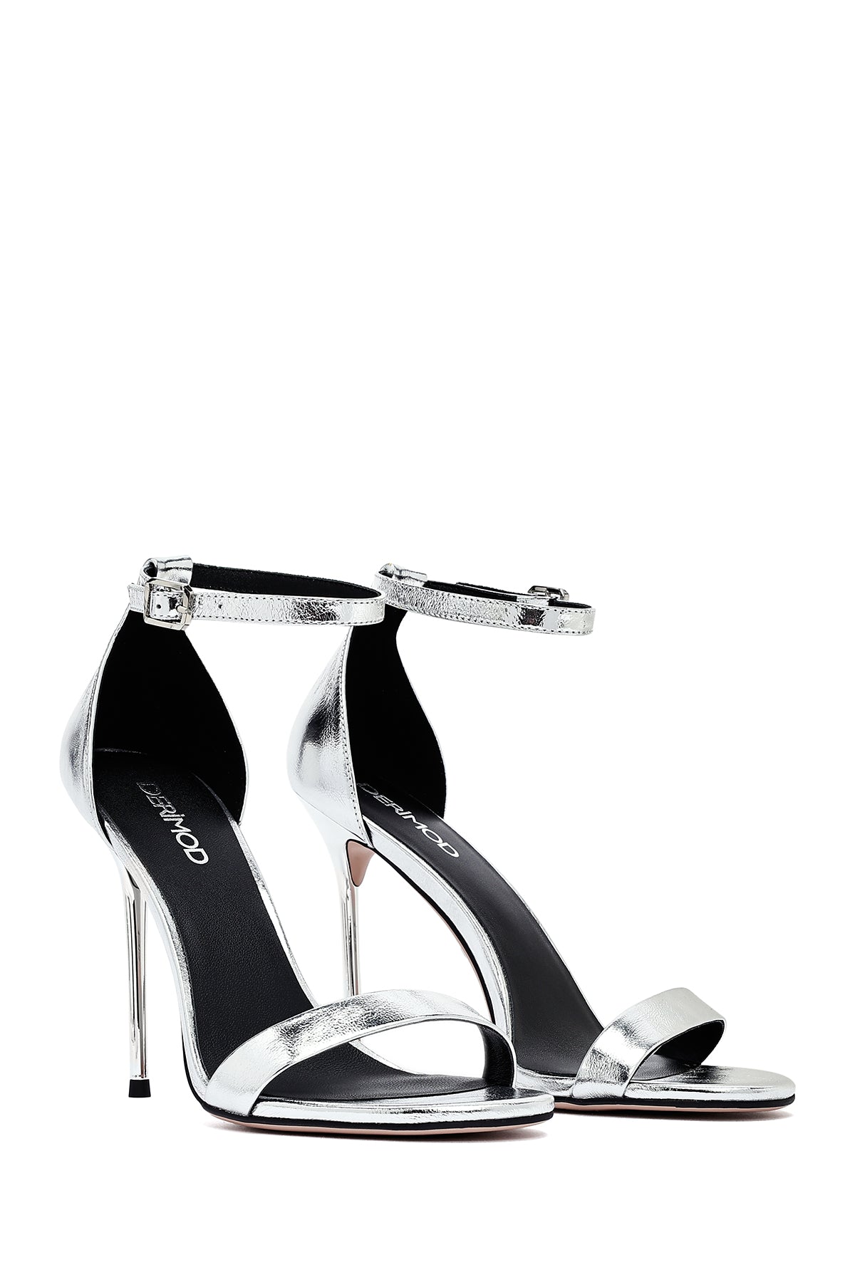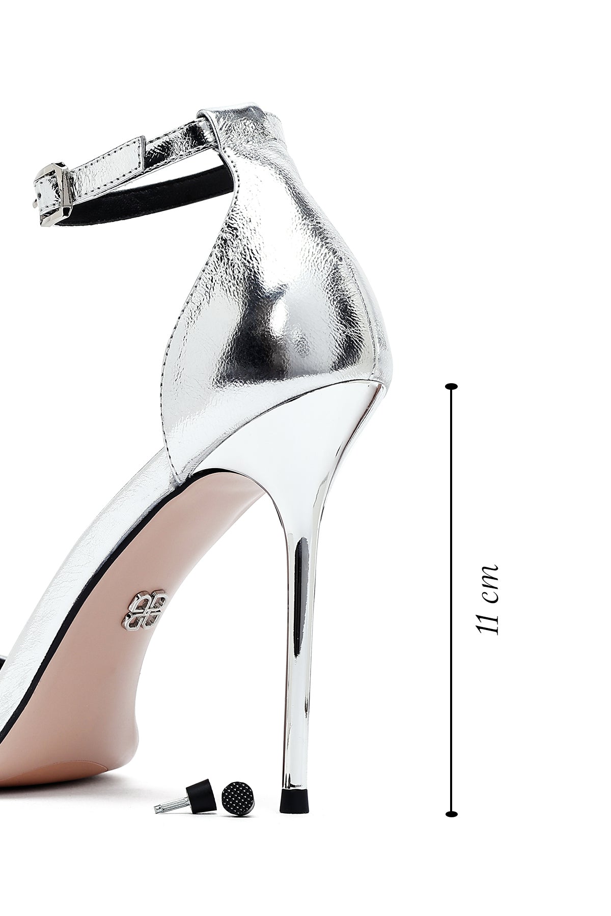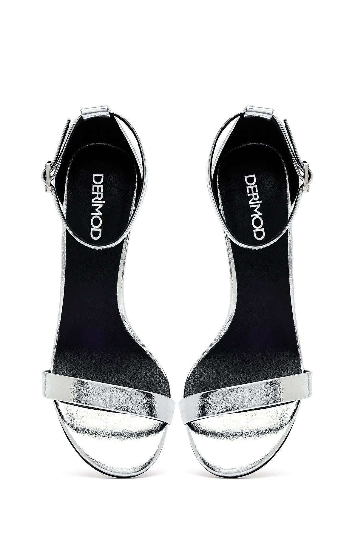 Kadın Gümüş Bilekten Tokalı Yüksek İnce Topuklu Metalik Deri Sandalet