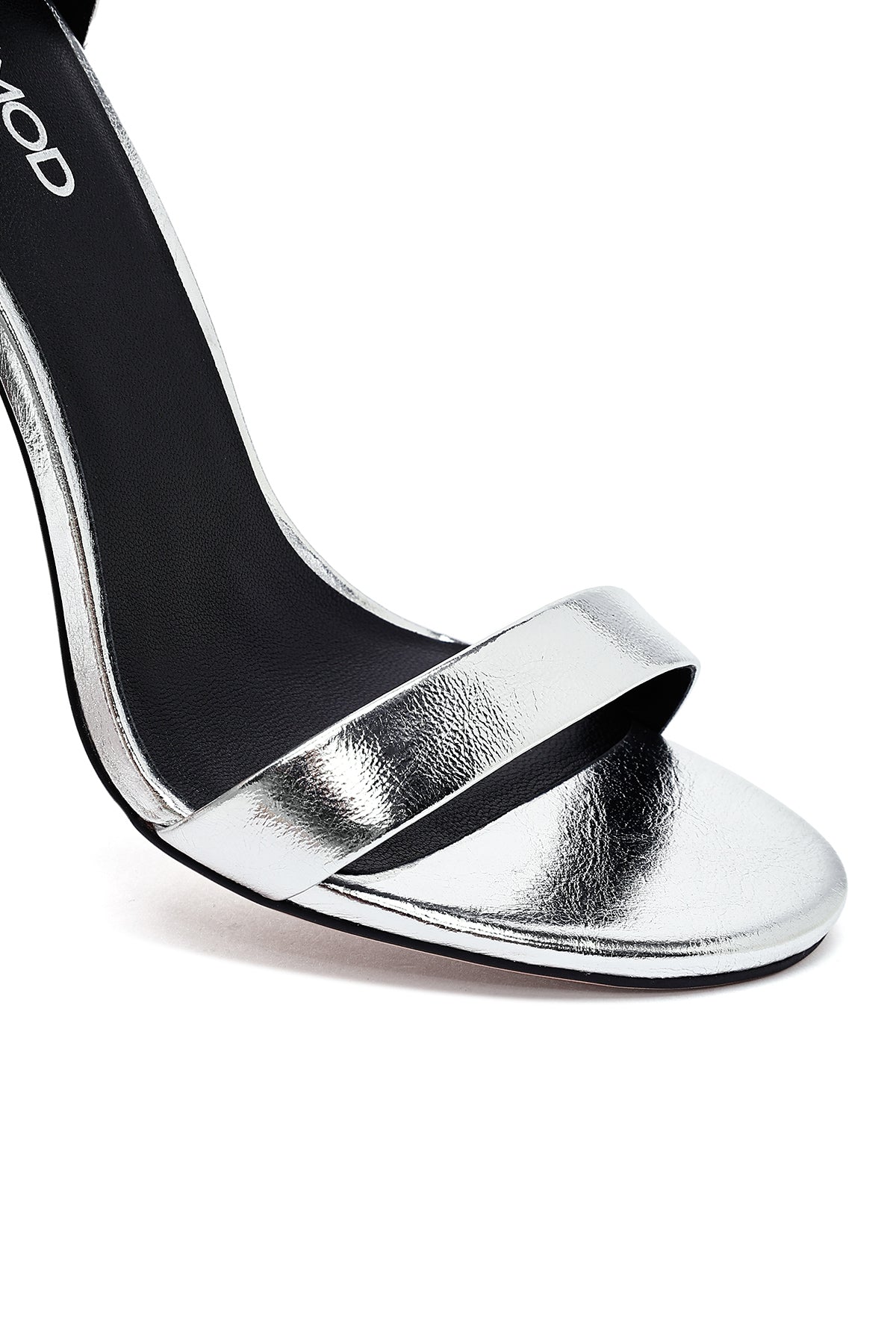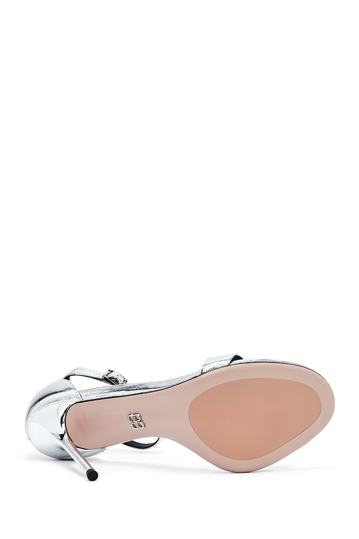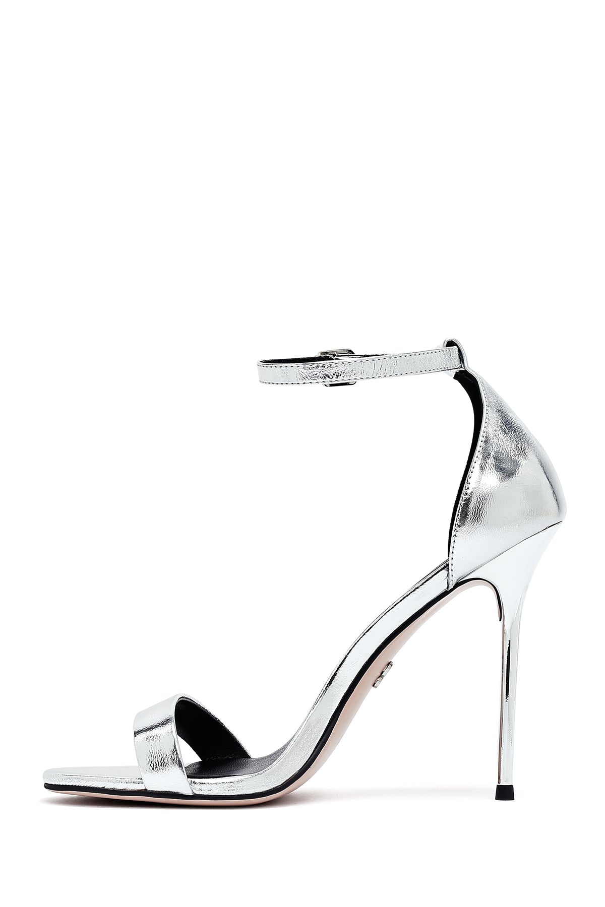 Kadın Gümüş Bilekten Tokalı Yüksek İnce Topuklu Metalik Deri Sandalet