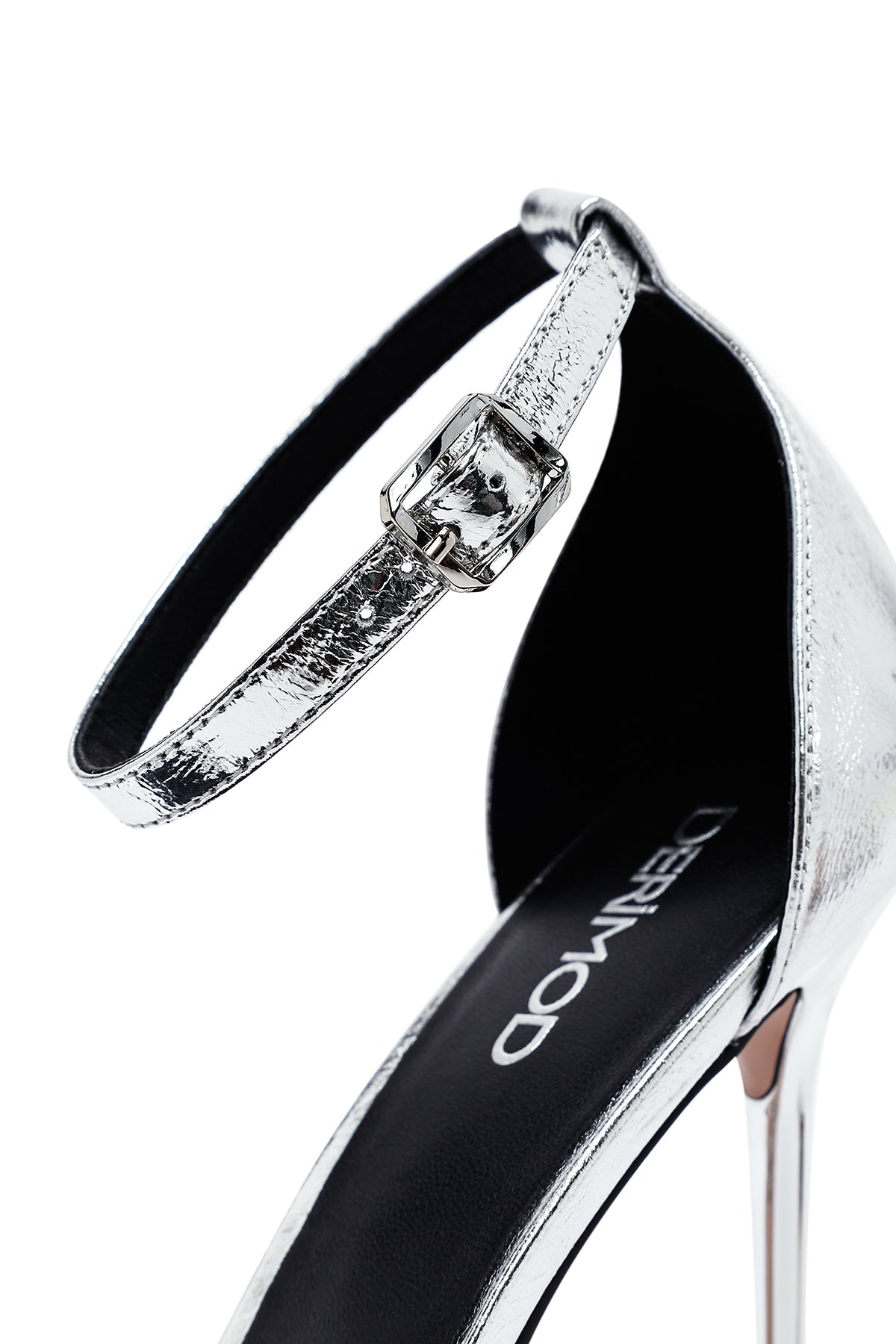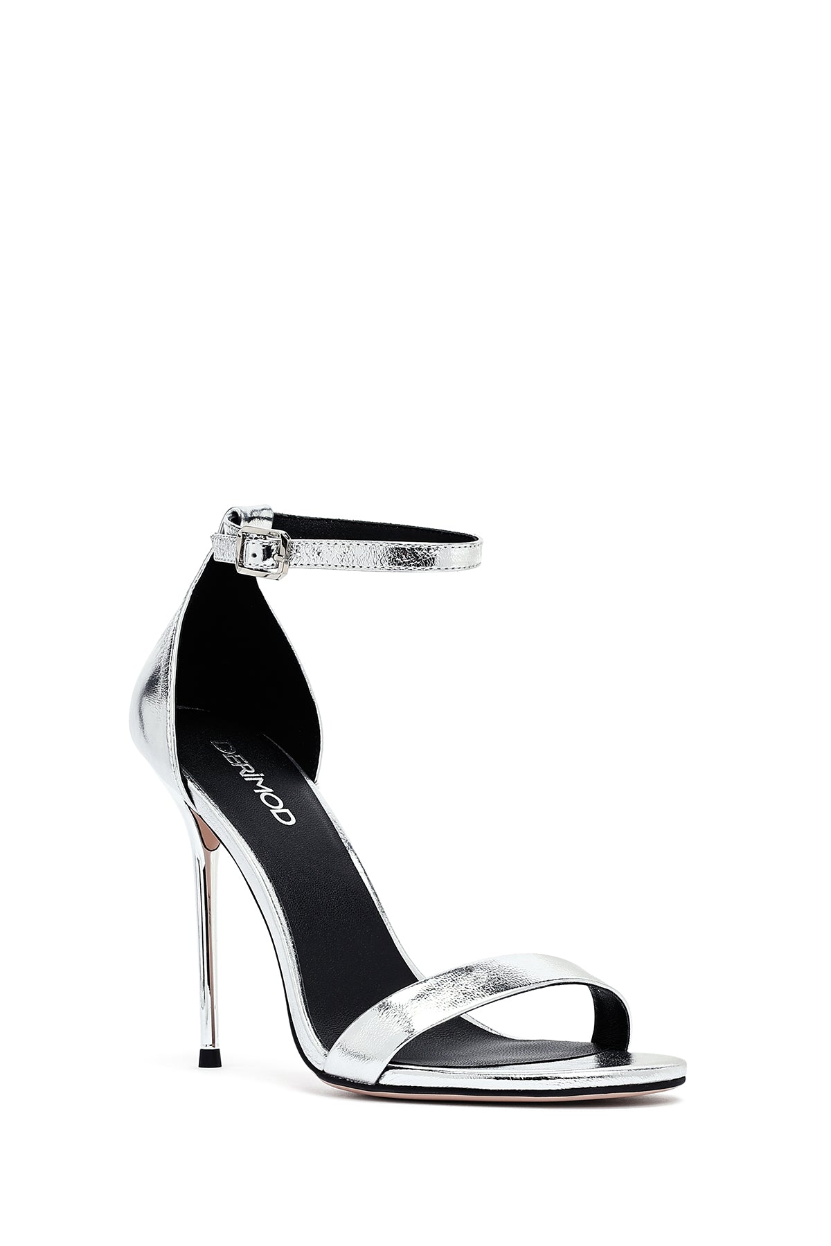 صندل زنانه نقرهای چرم متالیک پاشنهنازک بلند بنددار دری مد