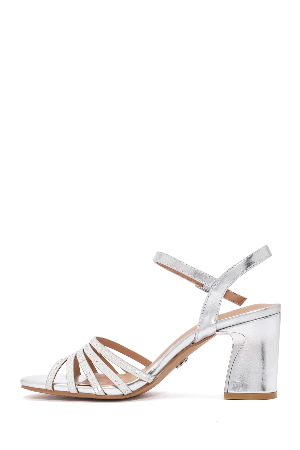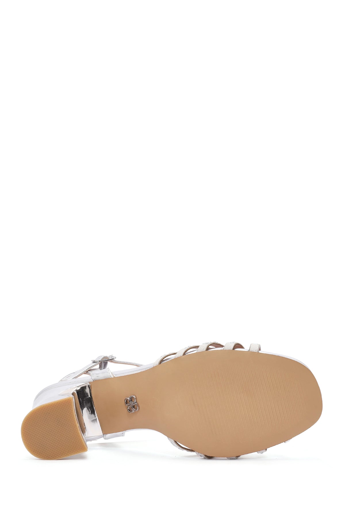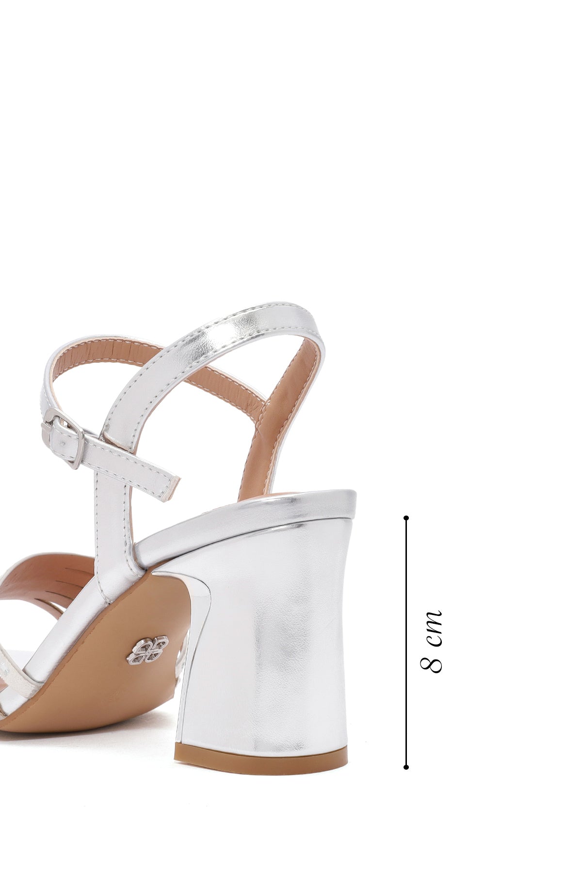 Kadın Gümüş Bilekten Bağlamalı Metalik Kalın Topuklu Sandalet