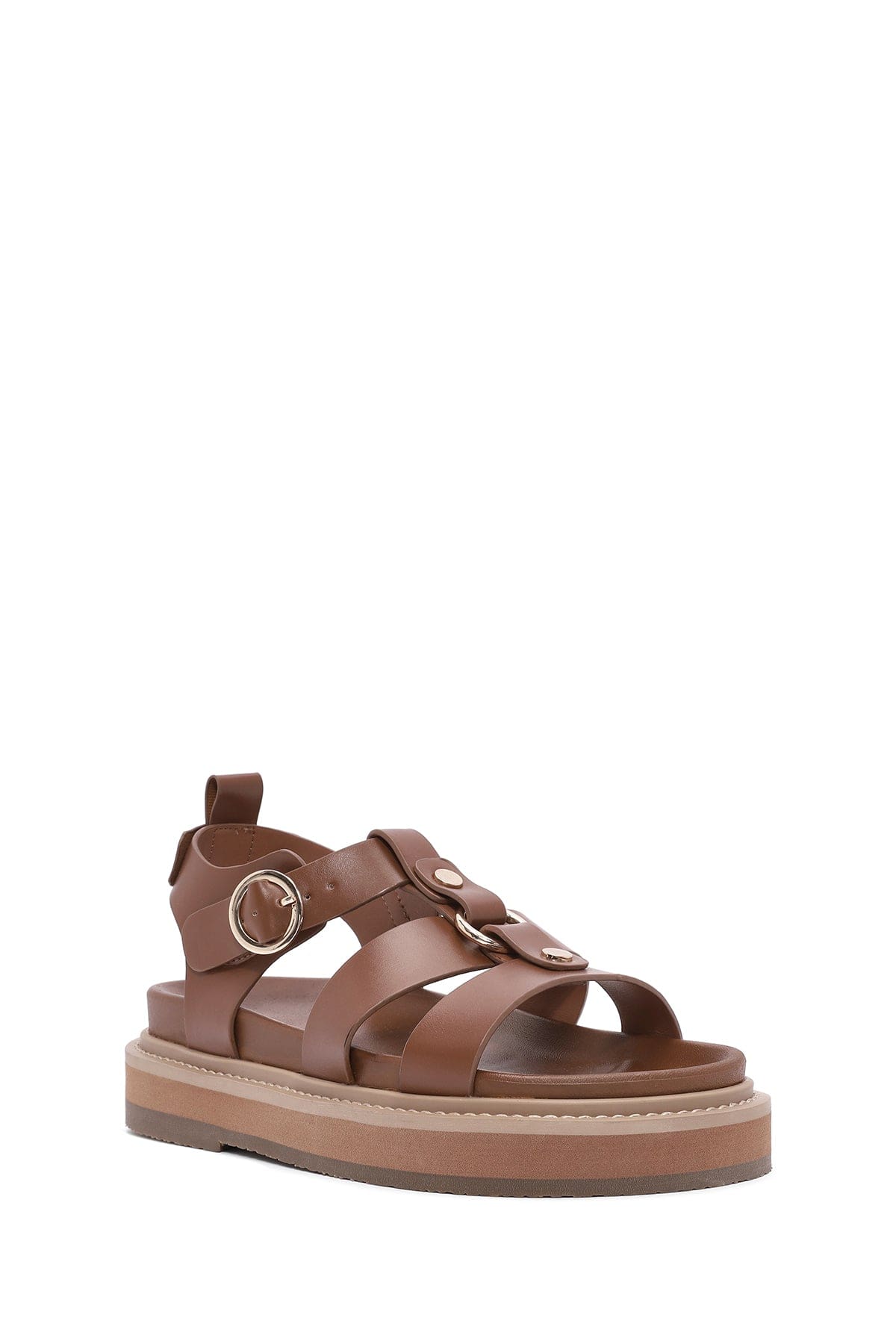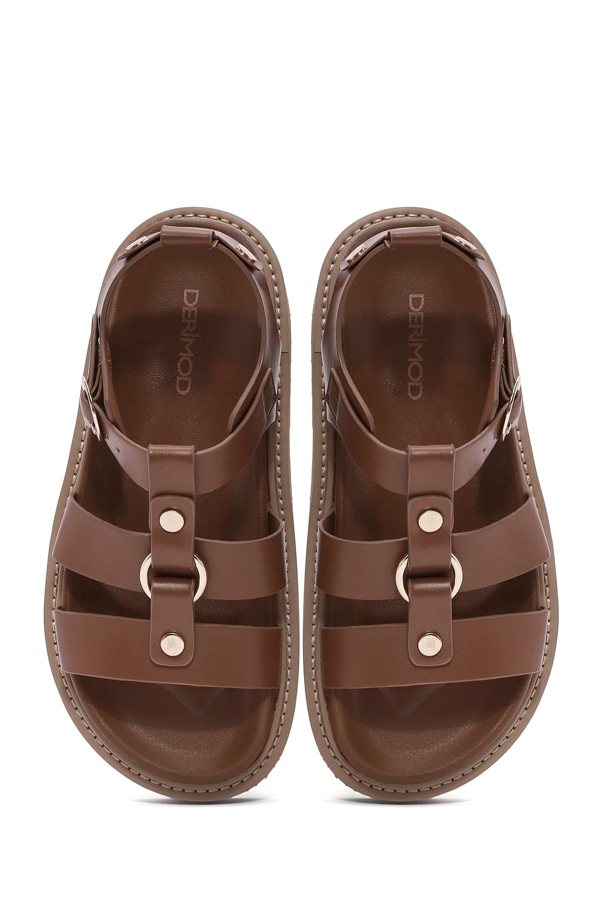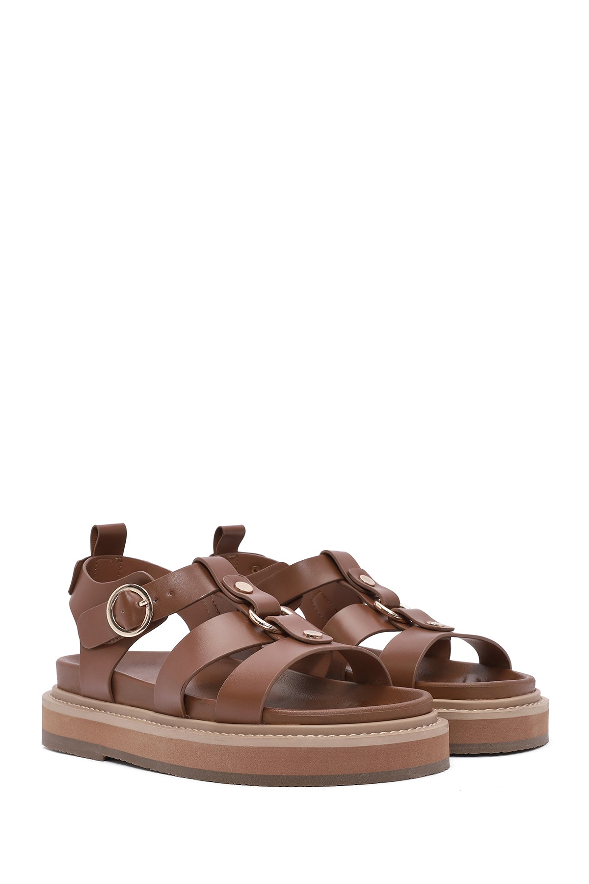 صندل زنانه قهوهای روشن بنددار تخت ضخیم دری مد