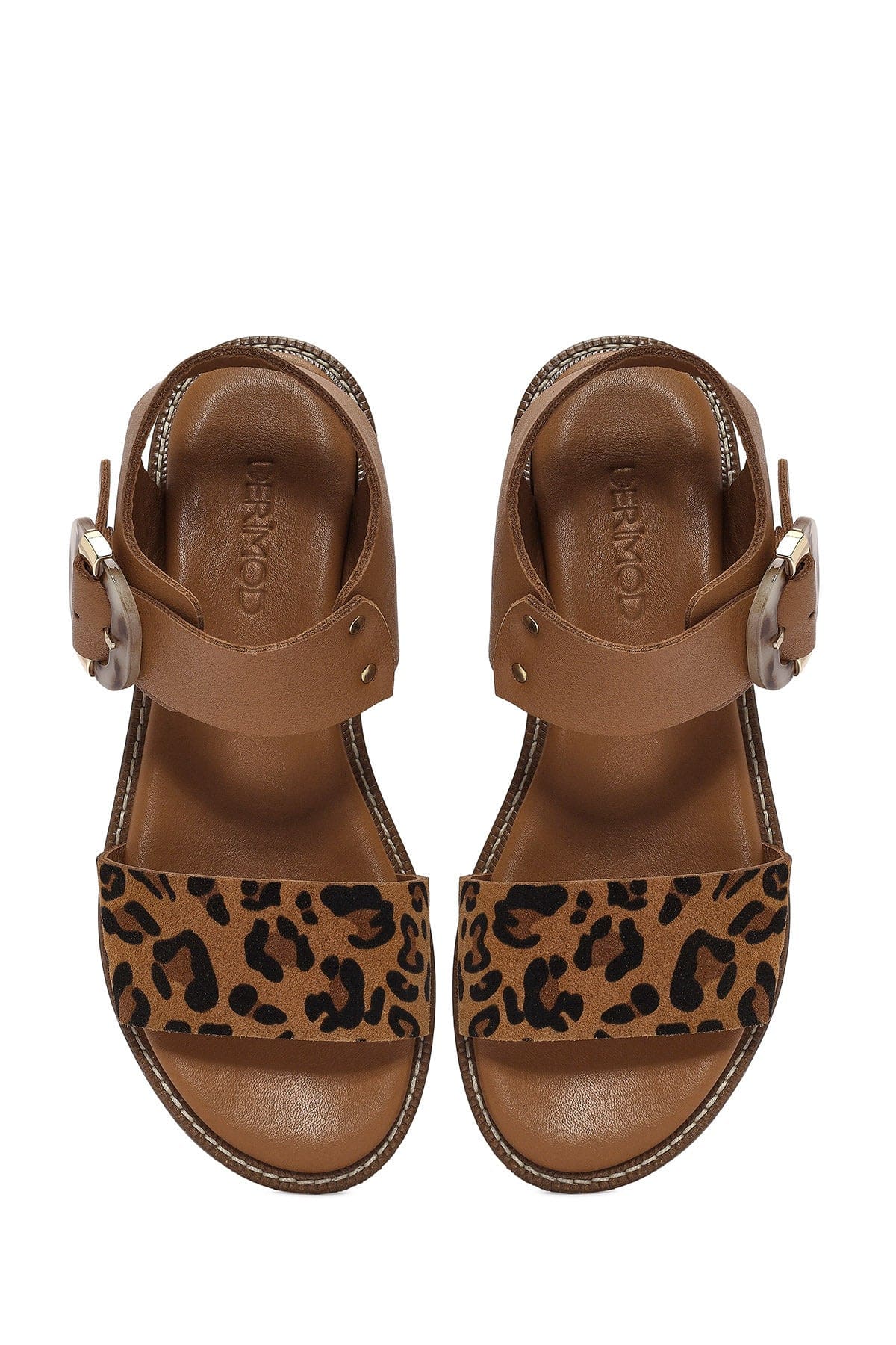 Kadın Taba Tokalı Leopar Desenli Deri Sandalet