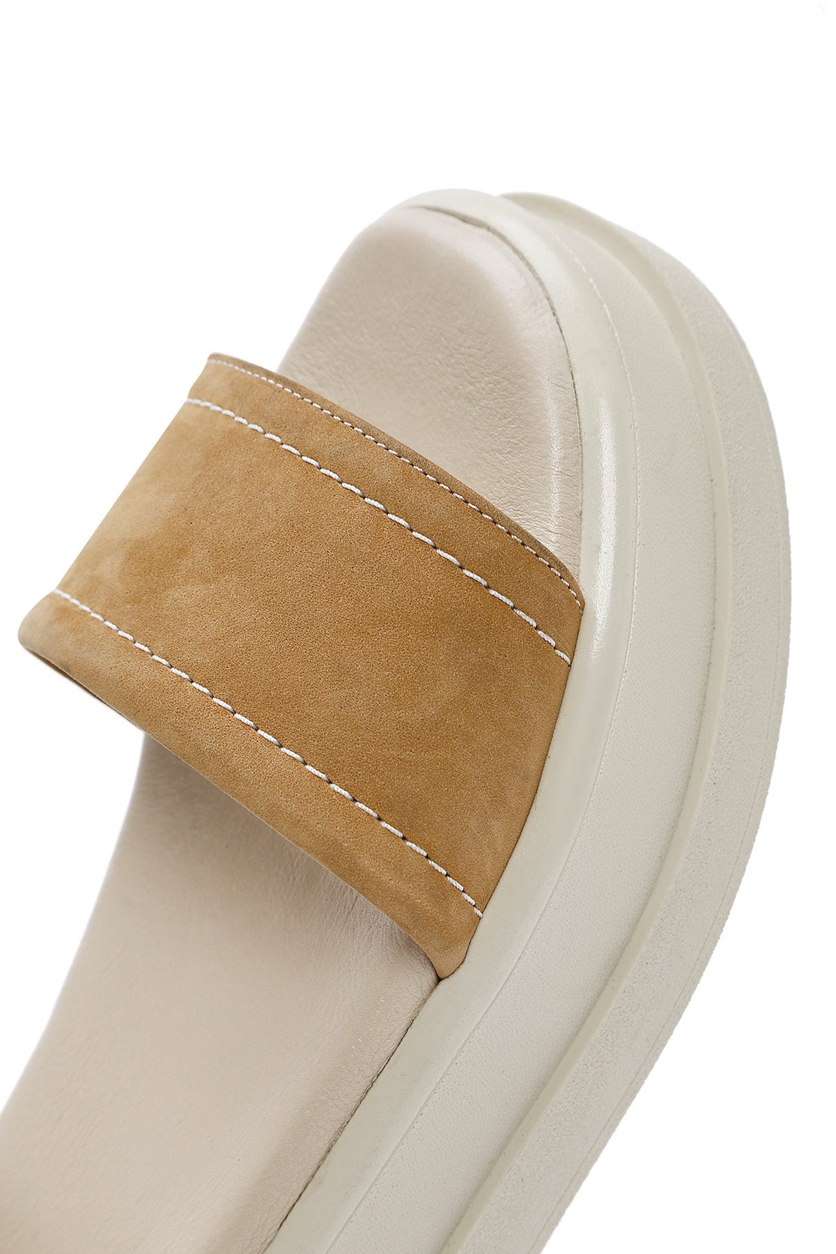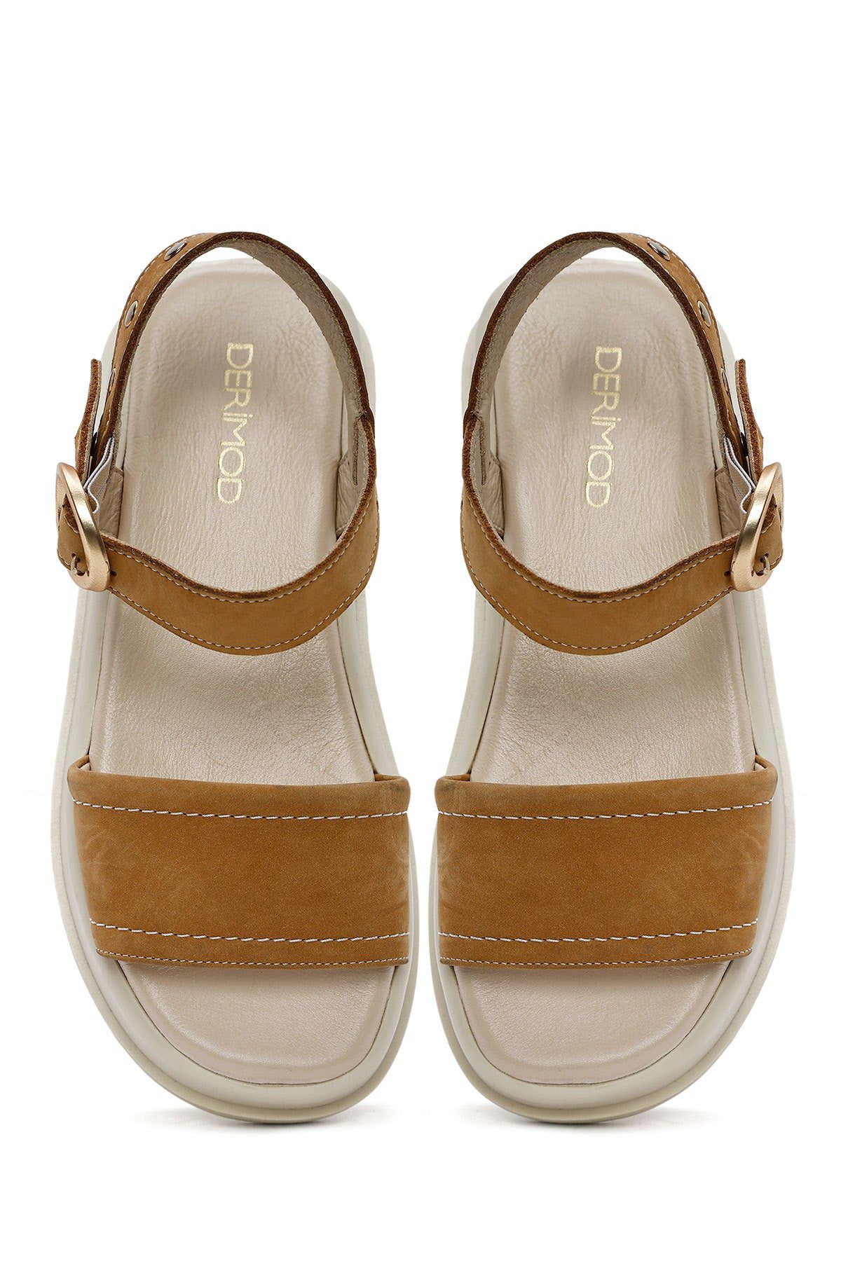 صندل زنانه قهوهای روشن چرم نبوک بنددار تخت ضخیم دری مد