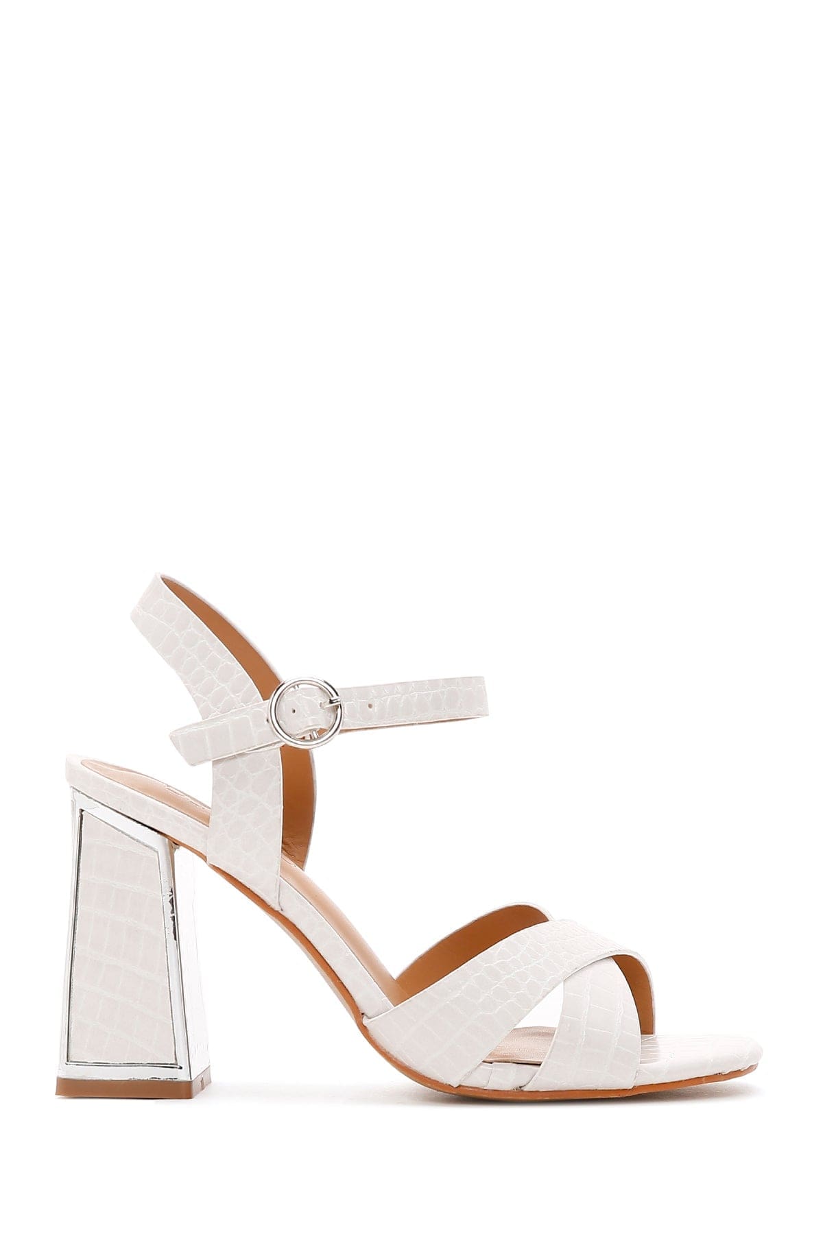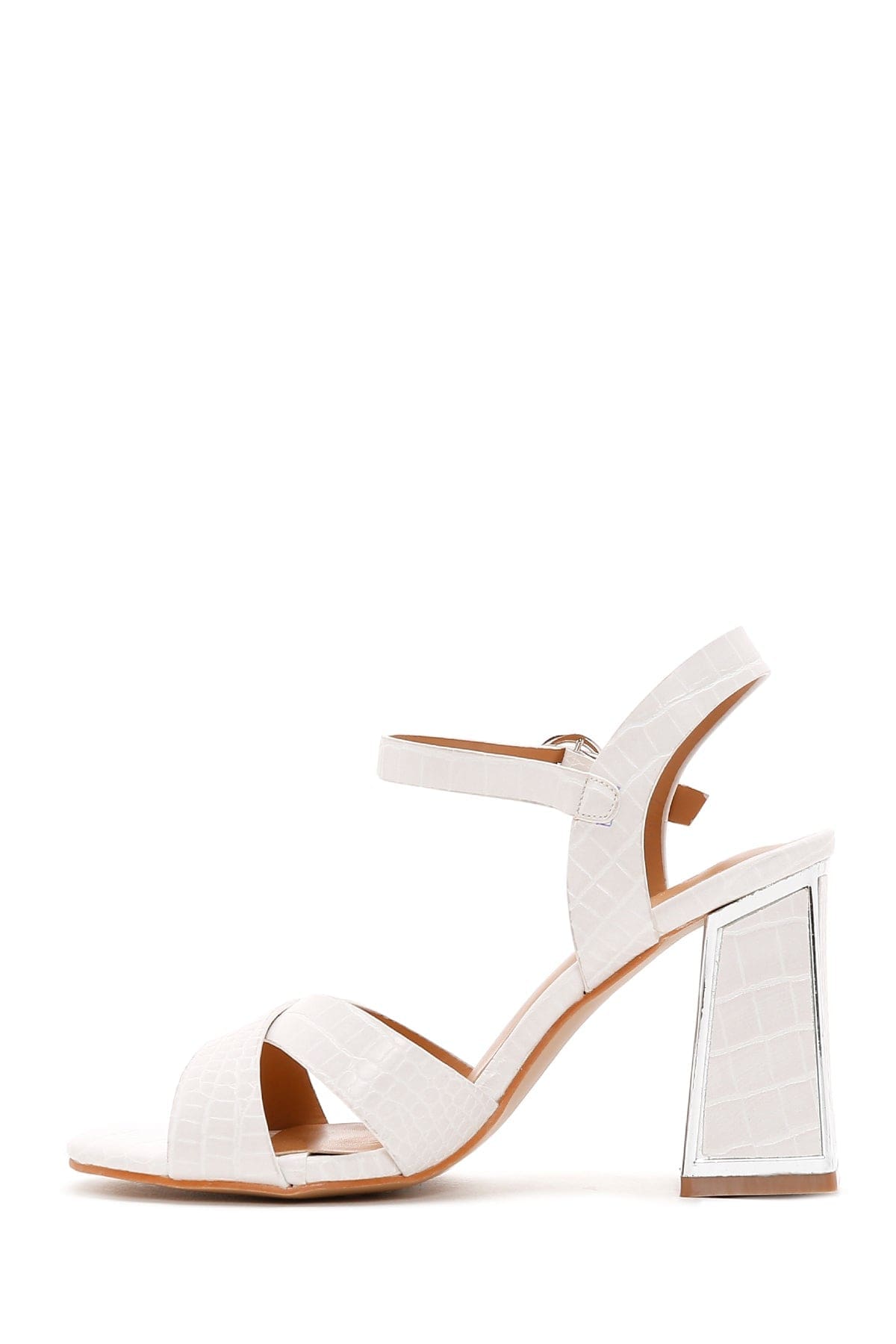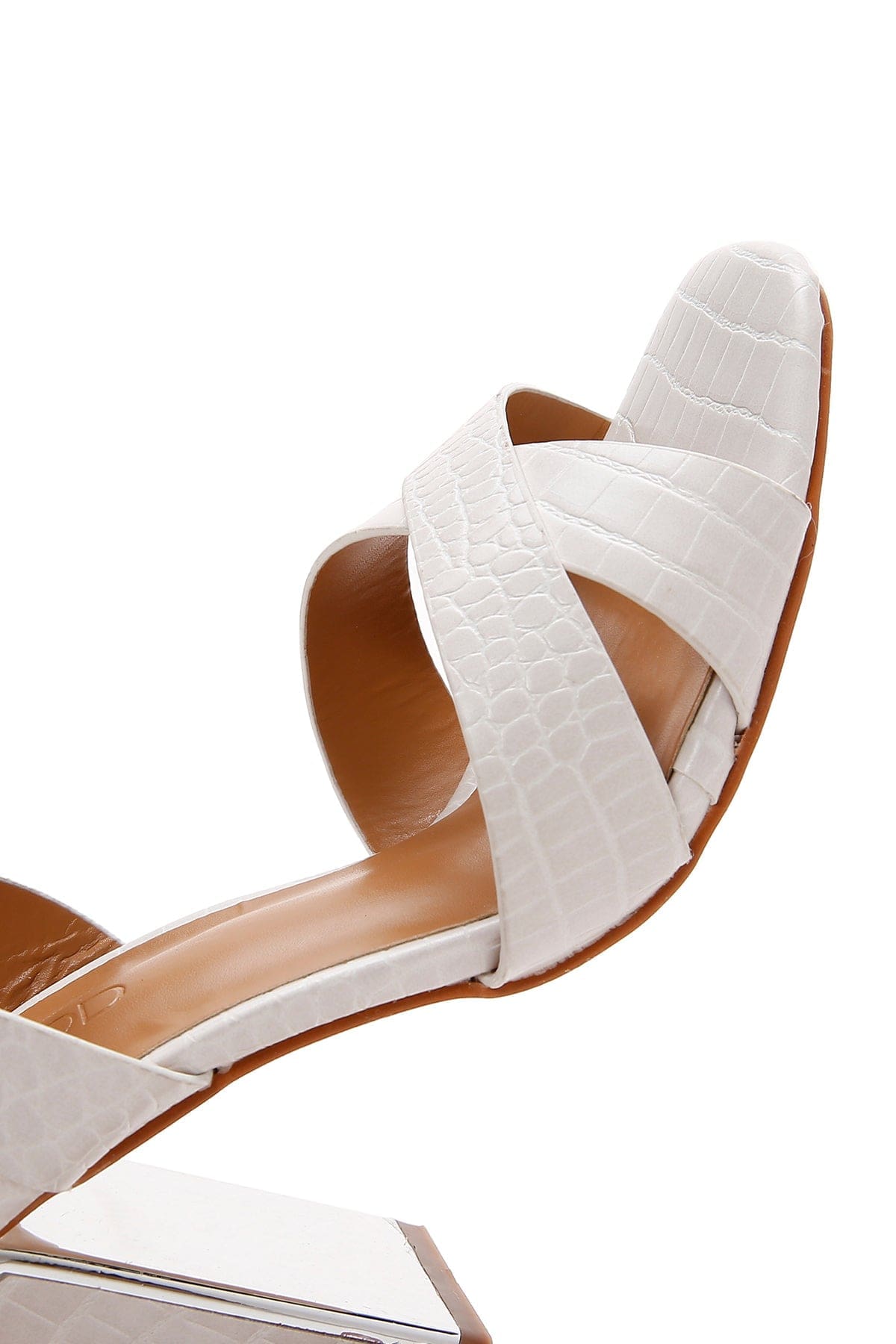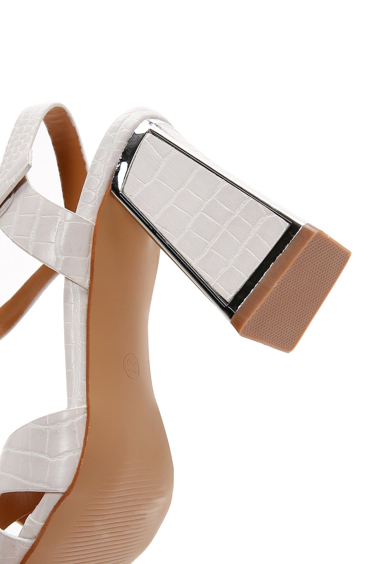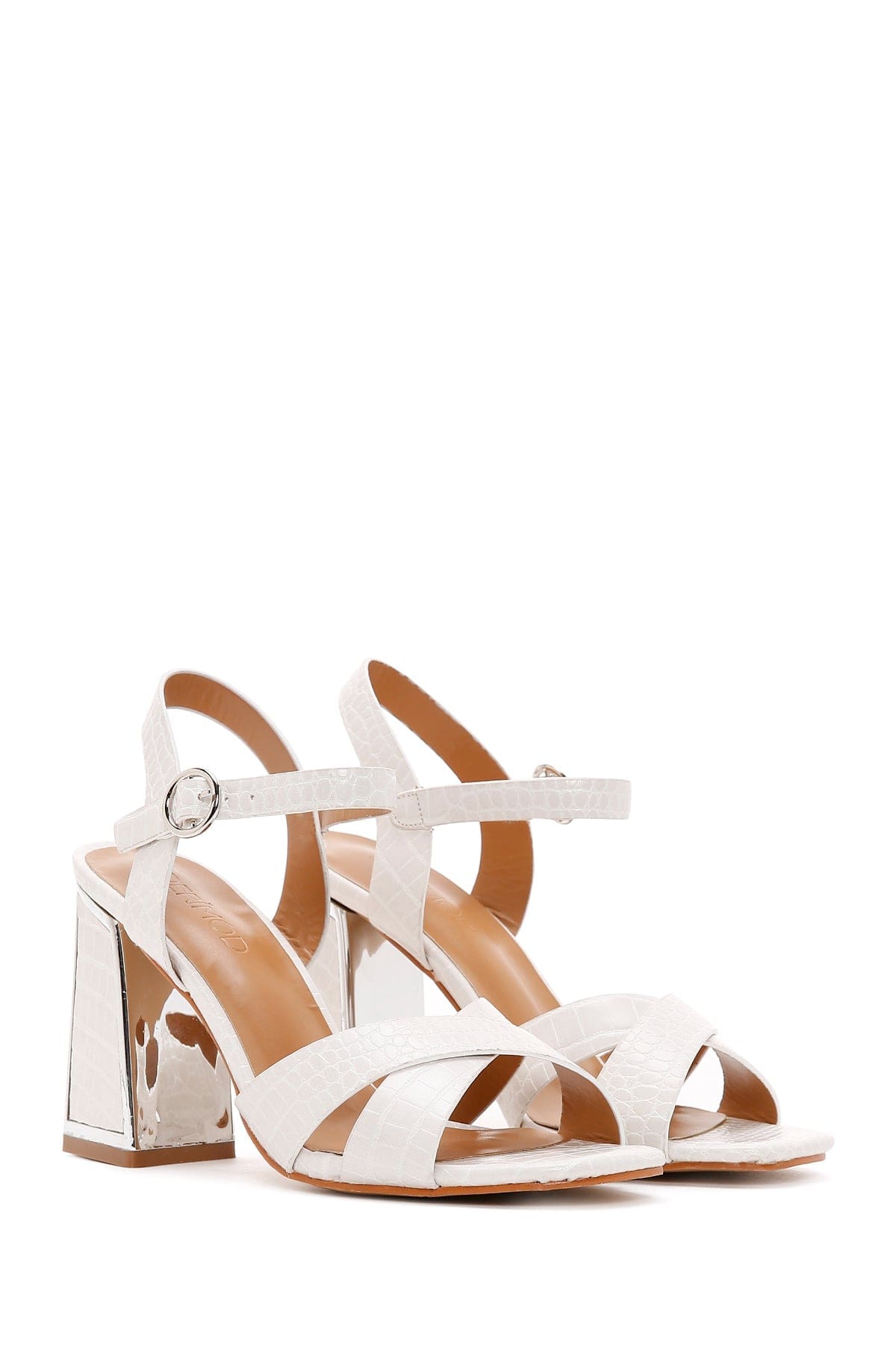 Kadın Beyaz Bilekten Bantlı Kalın Topuklu Kroko Sandalet