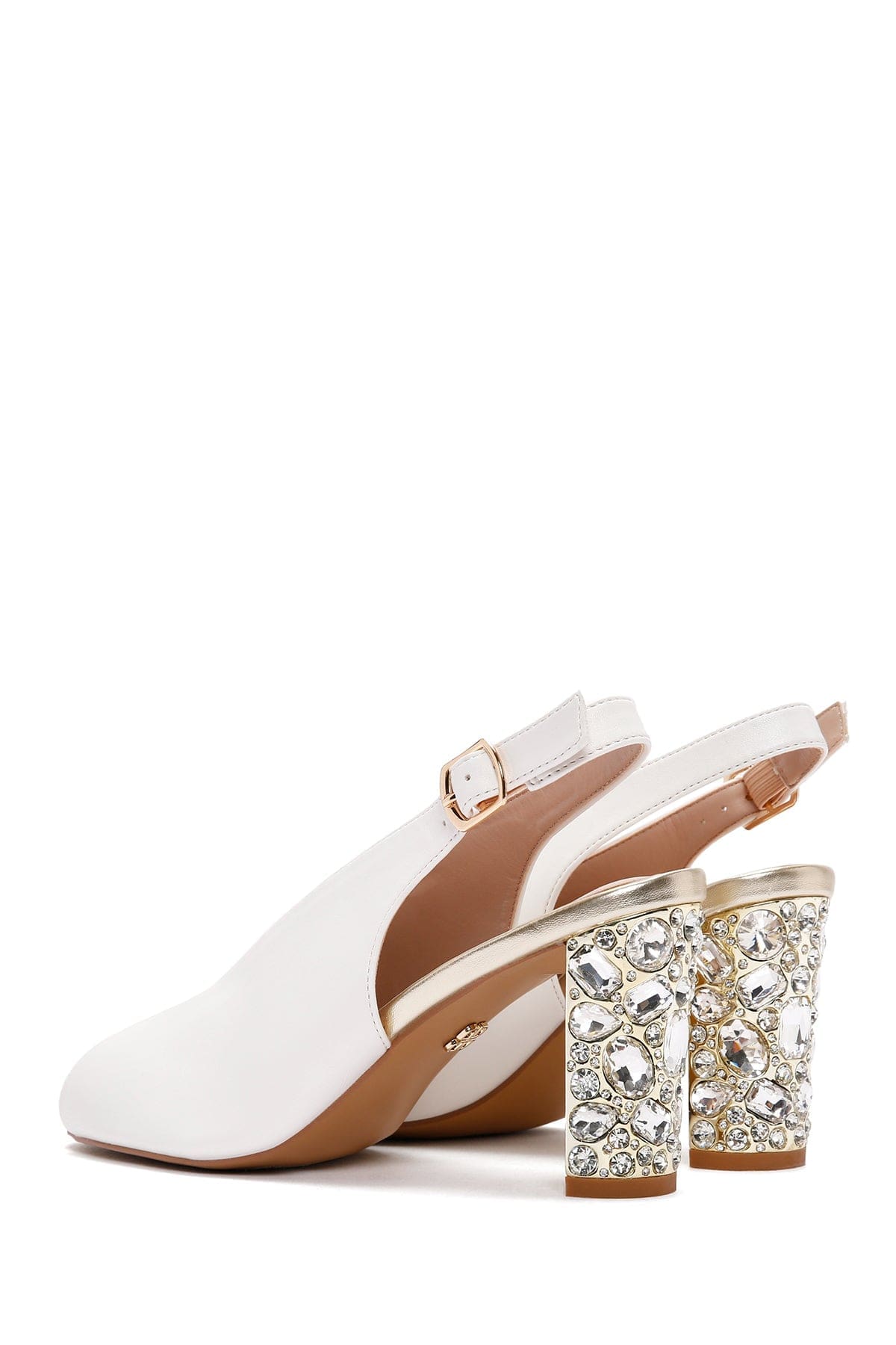 Kadın Beyaz Arkadan Bantlı Taşlı Kalın Topuklu Sandalet