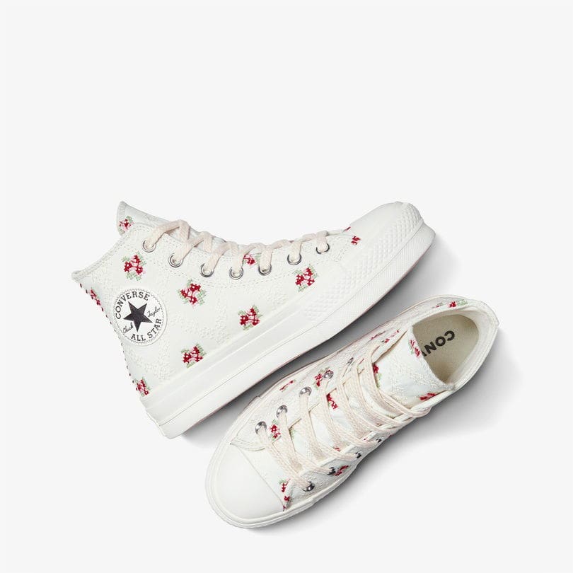 سطح فوقانی بوم بادوام ظاهر و احساس نمادین را نشان می دهد. Cushioning Ortholite راحتی برتر را فراهم می کند و ارتفاع اضافی را به سبک پایه سکو بالا اضافه می کند. توری بافندگی و جزئیات گلدوزی گل ظاهری دست ساز و DIY ارائه می دهد. مچ دست مچ دست چاک تیلور و تمام پلاک ستاره میراث Converse را تکمیل می کند.