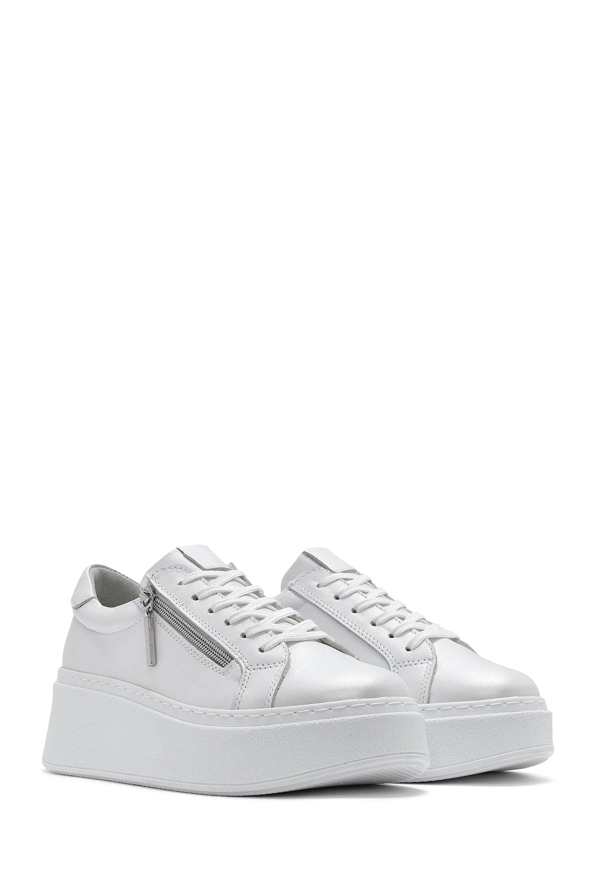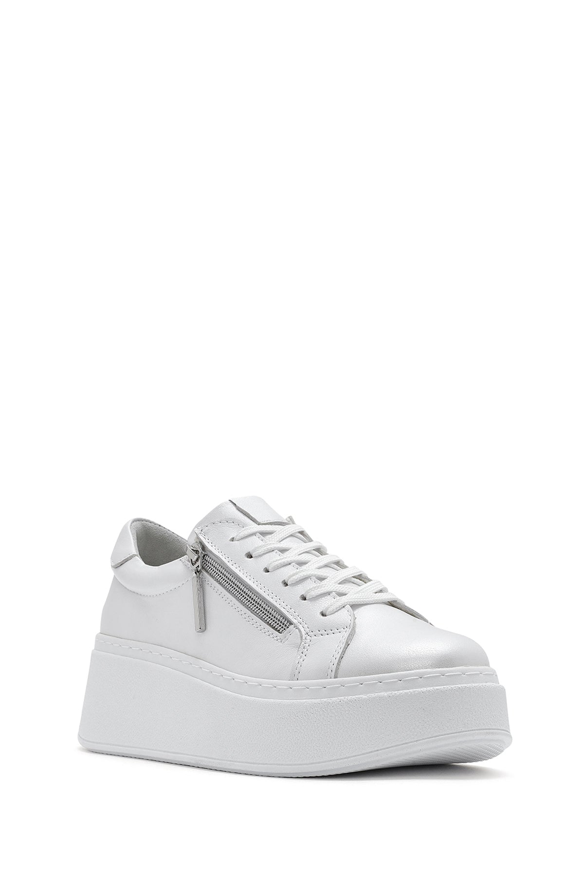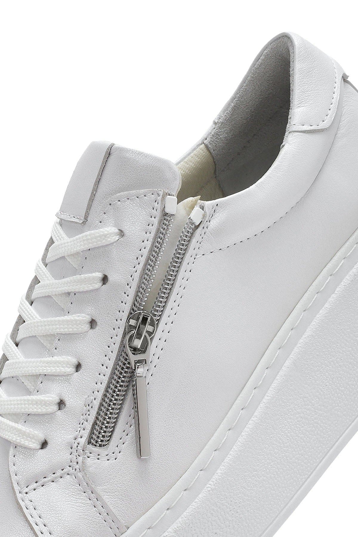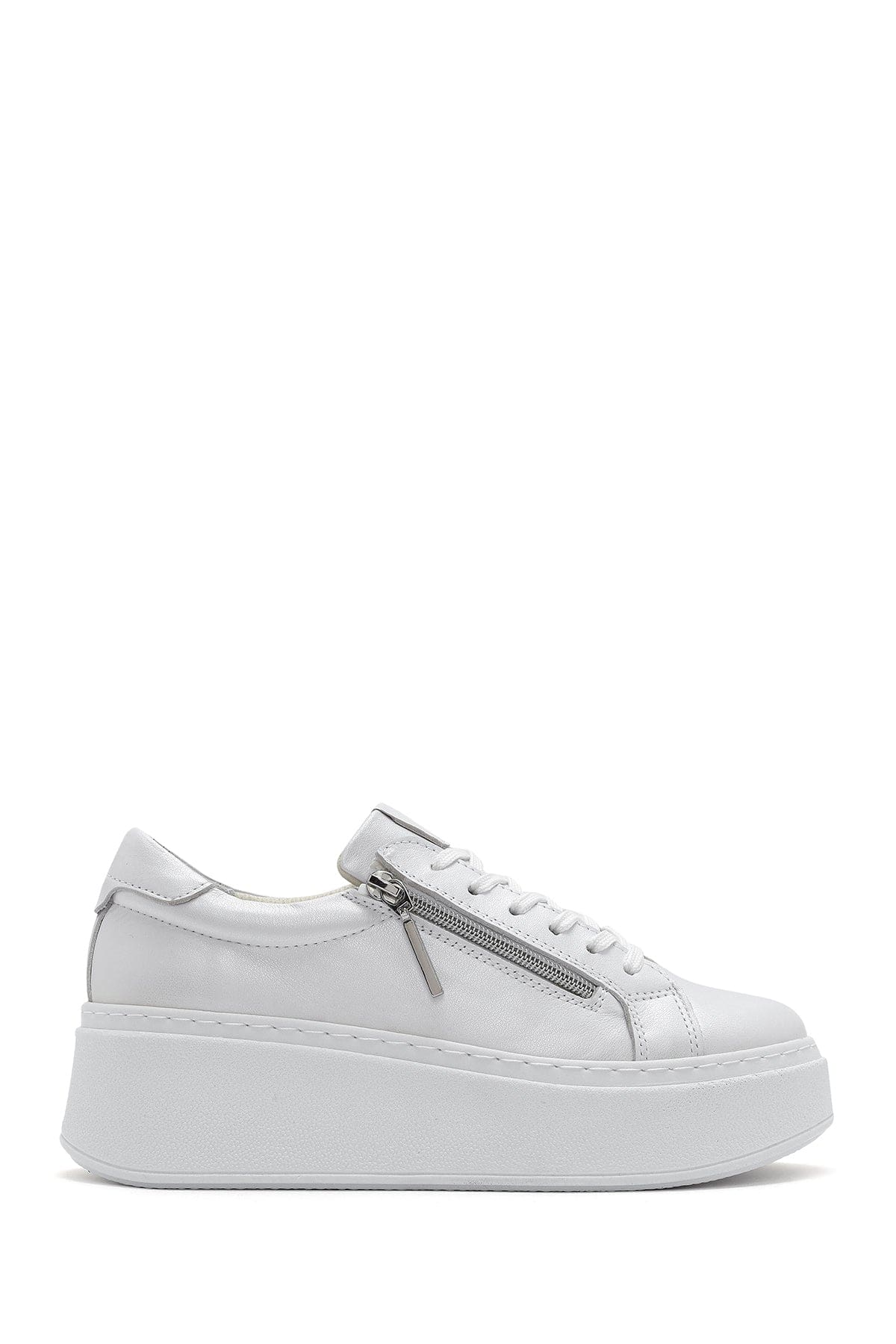 Kadın Beyaz Kalın Tabanlı Yandan Fermuarlı Bağcıklı Deri Sneaker