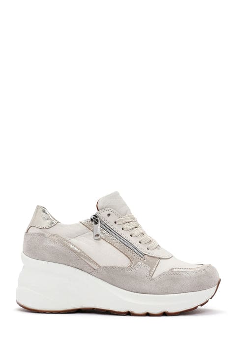 Kadın Bej Bağcıklı Fermuar Detaylı Dolgu Topuklu Deri Sneaker